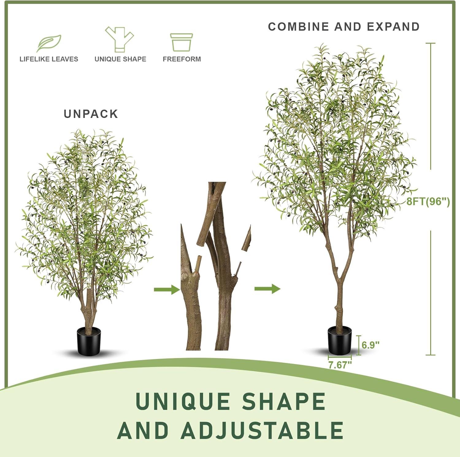 【 Effortless Assembly 】This lifelike olive tree 8 feet arrives with clear step-by-step instructions, allowing you to set it up effortlessly—no tools or complicated steps required. We suggest placing it in a bigger decorative planter to make the fake tree perfect.