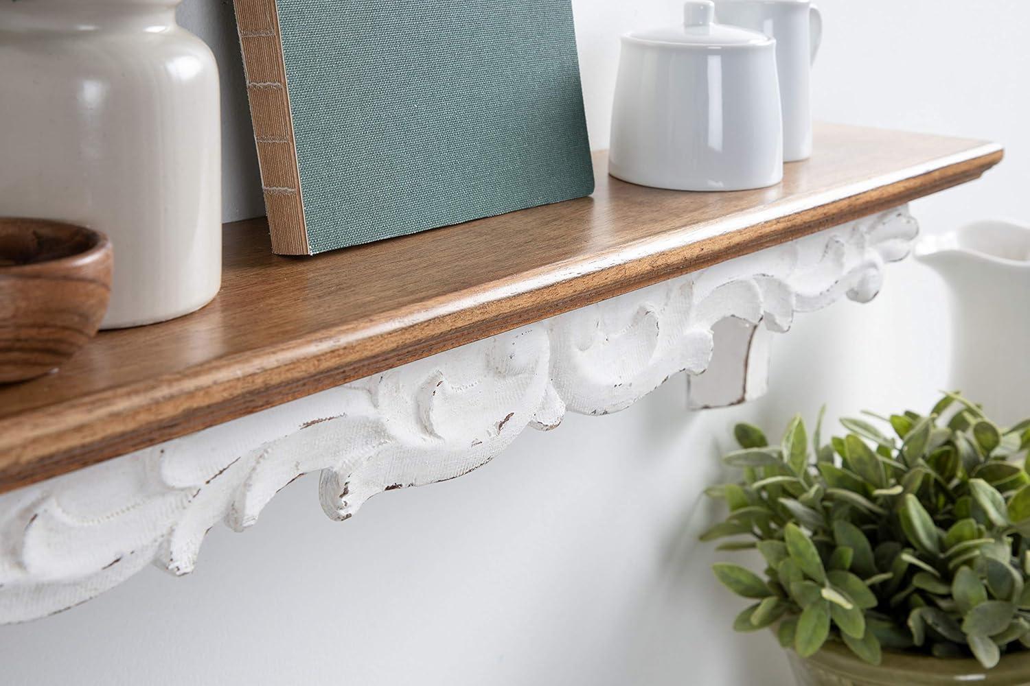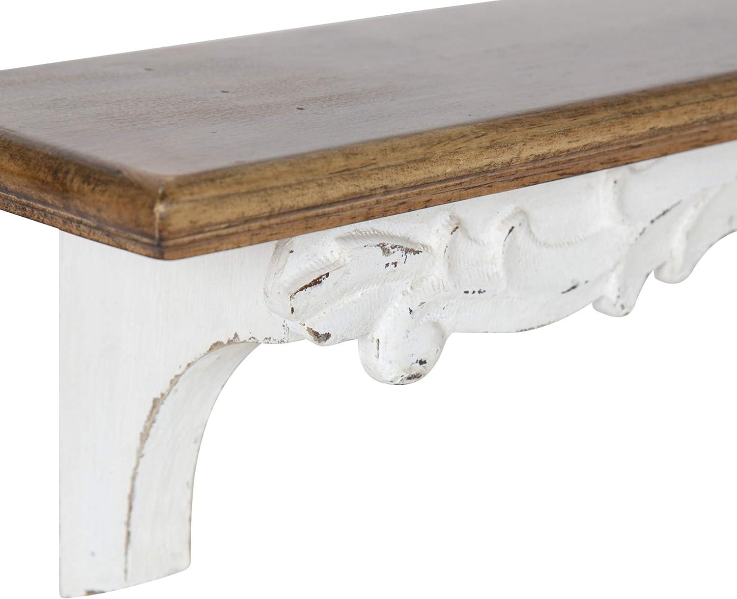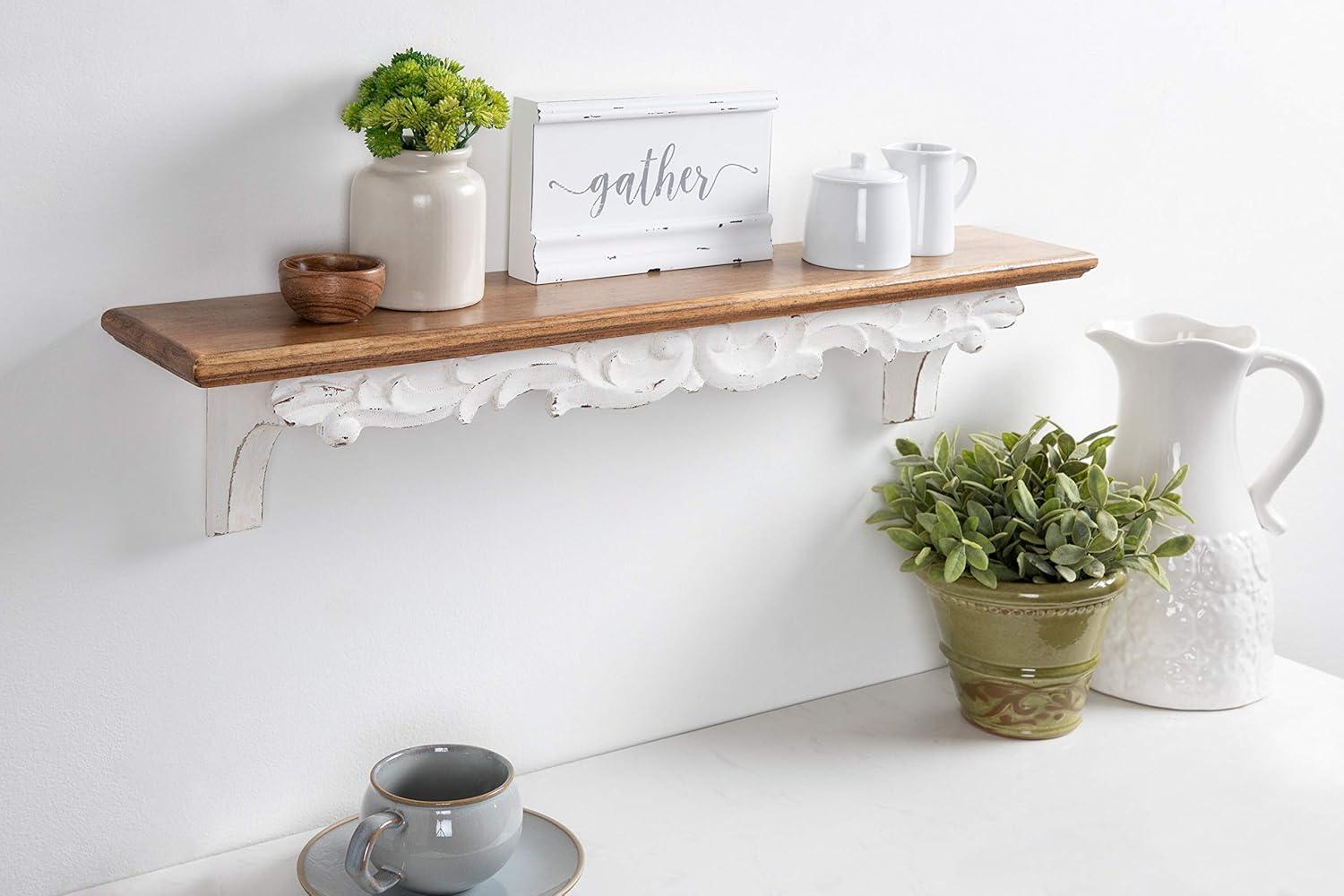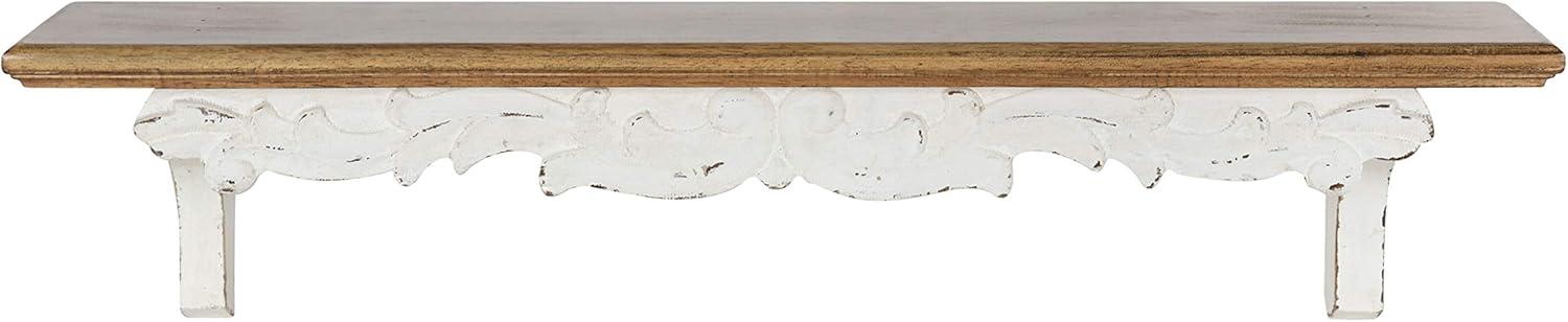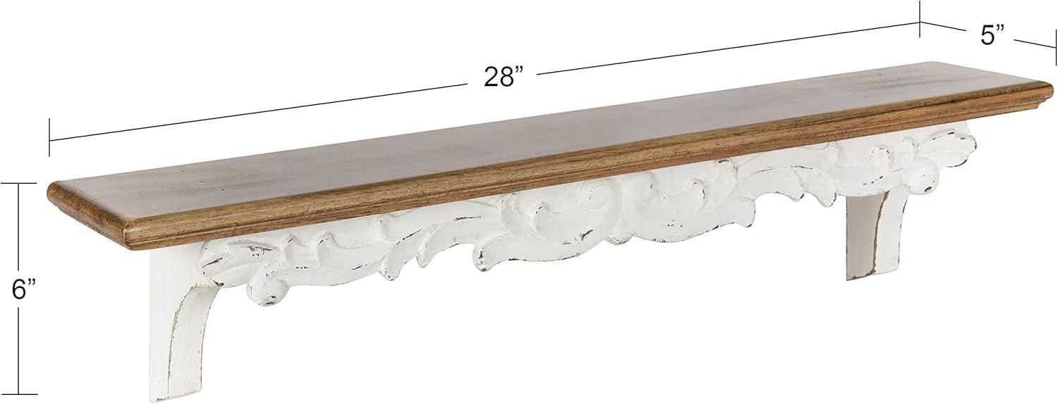 Indulge in a traditional aesthetic once thought to be found in secondhand flea markets in this artisanal wall shelf from Kate and Laurel. The Abberly wall shelf takes design cues from quality craftsmanship and vintage looks, with a robust solid fir wood construction and a beautiful white and rustic brown finish. The real pièce de résistance of this lovely shelf is the artful garland and nature-themed detailing reminiscent of colonial or Amish furniture. The overall display dimensions of this dynamic accent piece are 28 inches wide by 5 inches deep by 6.5 inches tall. The full shelf has 10 lbs. weight capacity, which is excellent for storing and displaying photos, small plants, vases, dessert plates, towels, and other household necessities. This traditional-style wall shelf looks fantastic as an accent piece in a living room or dining room, or a storage shelf in a farmhouse kitchen, bathroom, or bedroom. Hang the Abberly shelf in only a matter of seconds with the convenient metal keyhole hangers attached to the back of the wooden frame.