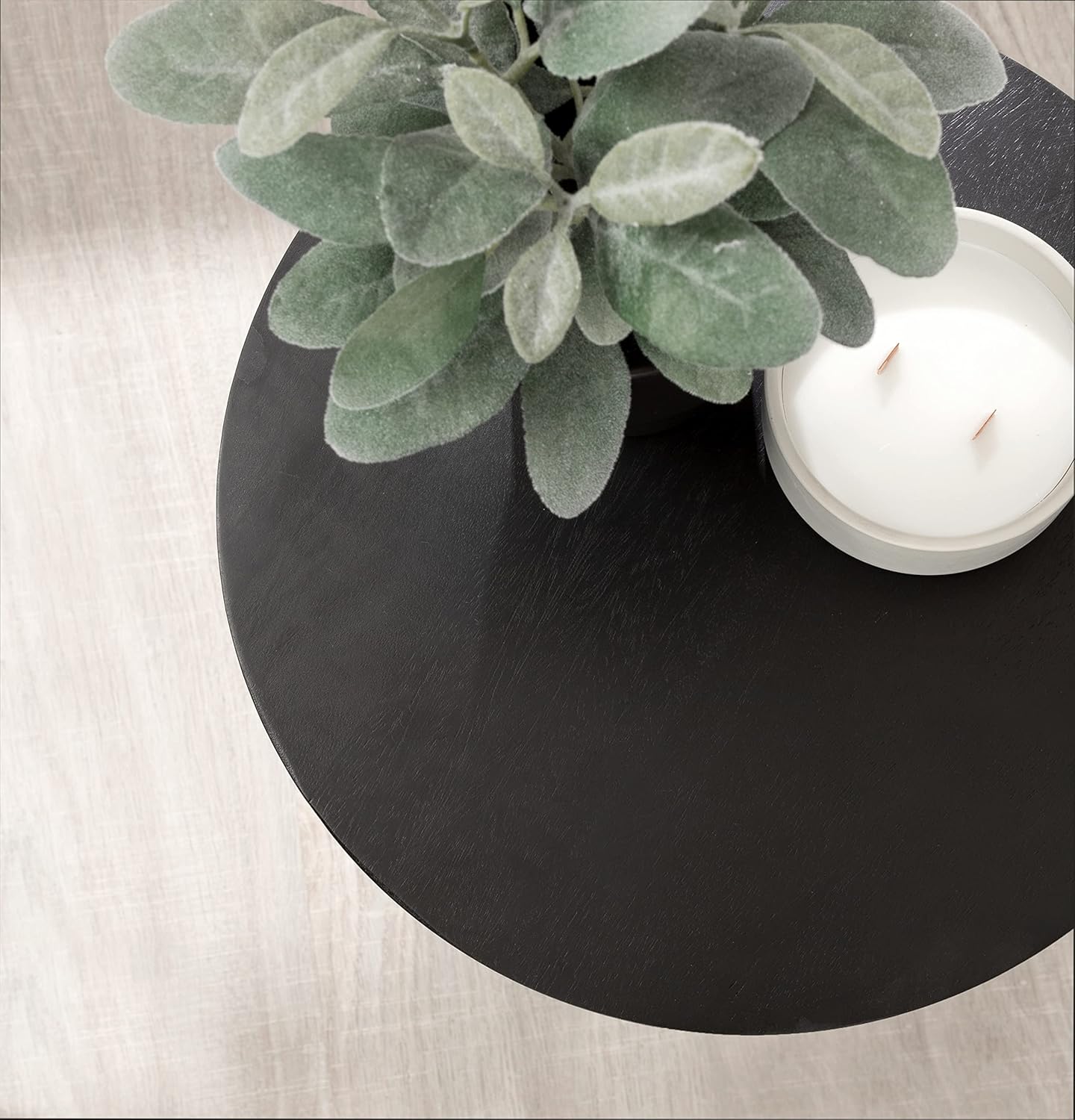 Blend bohemian style with modern design with the sophisticated Aja accent table. This lovely end table features a round tabletop upheld by chic, slanted legs to create a striking visual statement piece. The Aja table is handcrafted in India out of rich mango wood and coated in a bold black finish. Due to the handcraftsmanship of the Aja, each piece varies in woodgrain and finish, making the Aja entirely your own. This end table is 15 inches wide by 15 inches deep by 23 inches tall, making it the perfect size for an entryway, living room, or bathroom. The 15-inch diameter of the round tabletop looks great, displaying a lamp and photos, catching mail or house keys, or serving beverages on coasters to guests. Its unique design and cozy finish make it the perfect element for pairing with any piece of furniture. To assemble this decorative wood table, use the 4-step assembly process! Screw each slanted leg into the tabletop, followed by the round ring base, and it's ready for display.