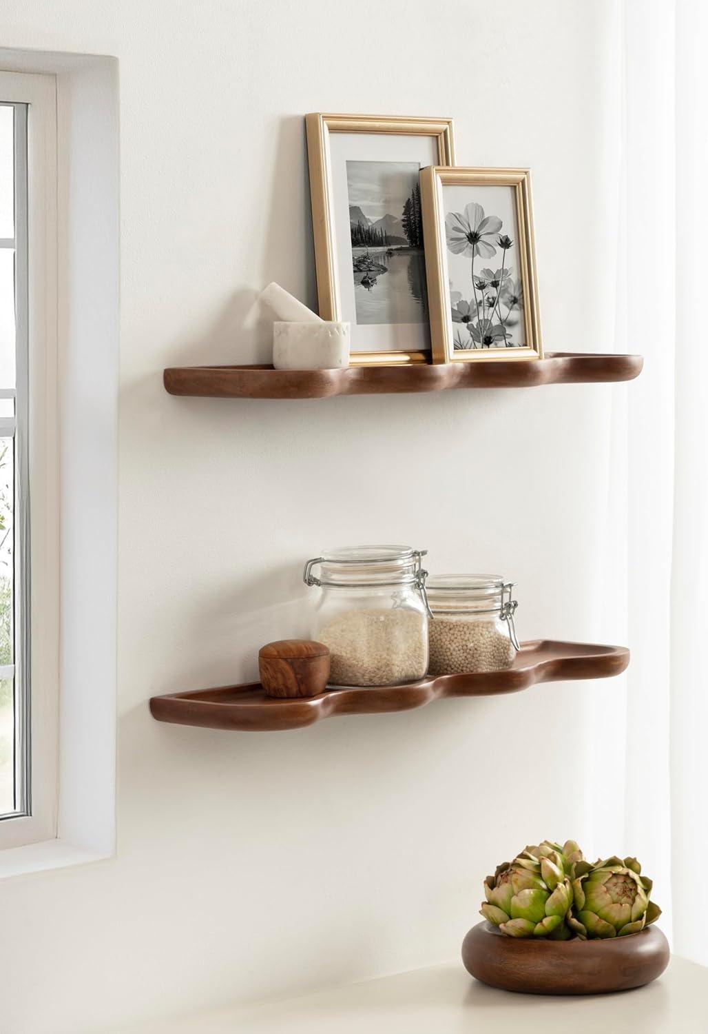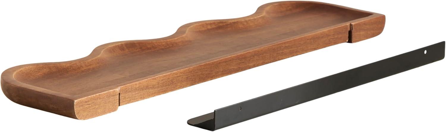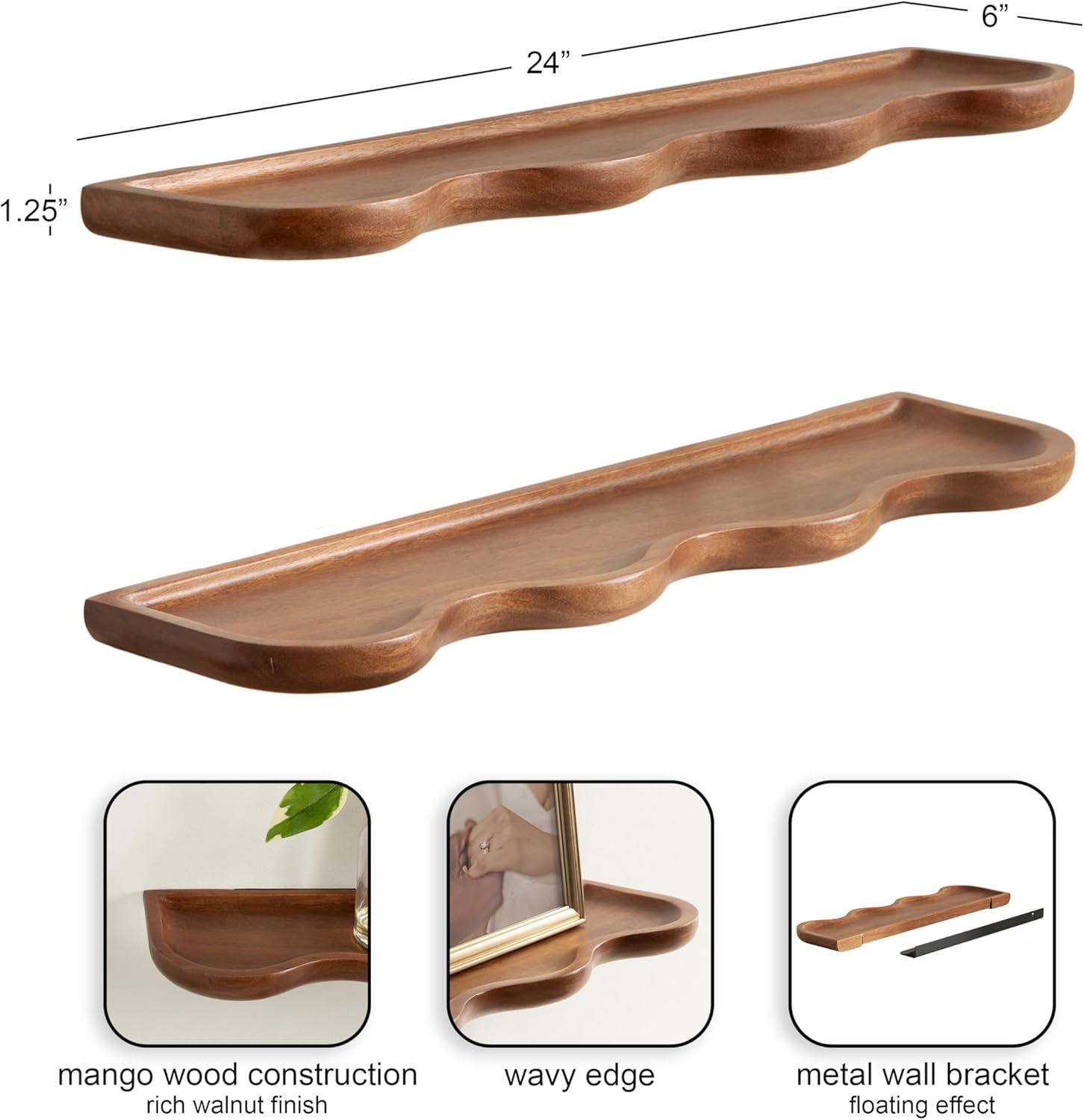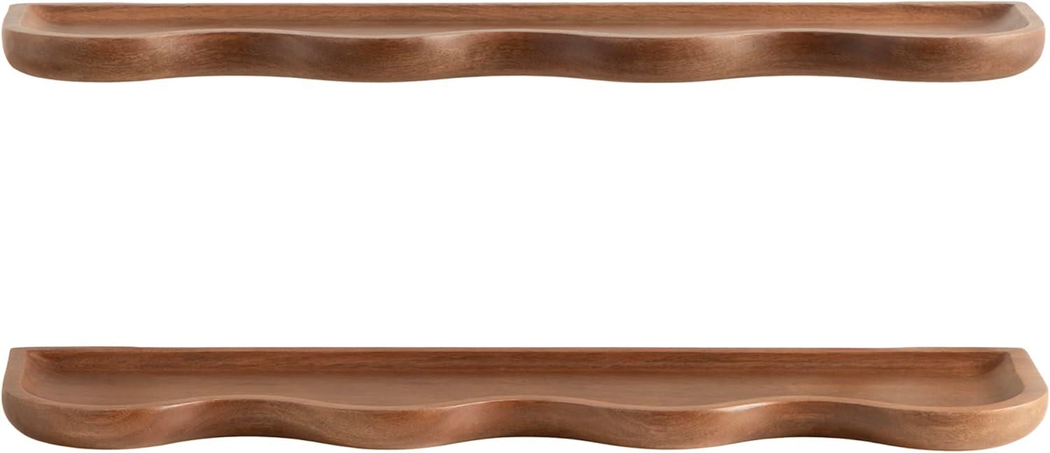 Inspire your inner interior decorator with these functional and beautiful floating shelves. Inspired by wavy curvature and convenient design, the Alezar wall shelves combine modern aesthetics with practical function. These shelves were made from solid mango wood, giving them an elevated quality and appearance. Setting it apart from a standard floating shelf, these shelves boast a youthful scalloped shape that adds a bit of character. The warm walnut brown finish provides a look that lends itself to clean design, allowing the Alezar set to blend into a variety of decorative aesthetics. The two shelves in this set measure 24 inches wide by 6 inches deep by 1.25 inches tall, making them fantastic for display side by side, parallel to each other, or spread throughout separate rooms. Each Alezar shelf has a five-pound weight capacity, giving you the opportunity to store dessert plates and mugs, showcase delightful succulents, or house your favorite keepsakes and media. The two Alezar shelves hang in just a matter of minutes with the convenient hanging brackets that attach directly to the wall for a floating effect.