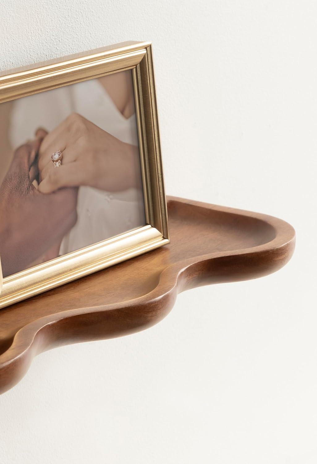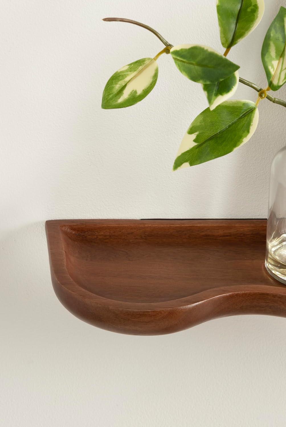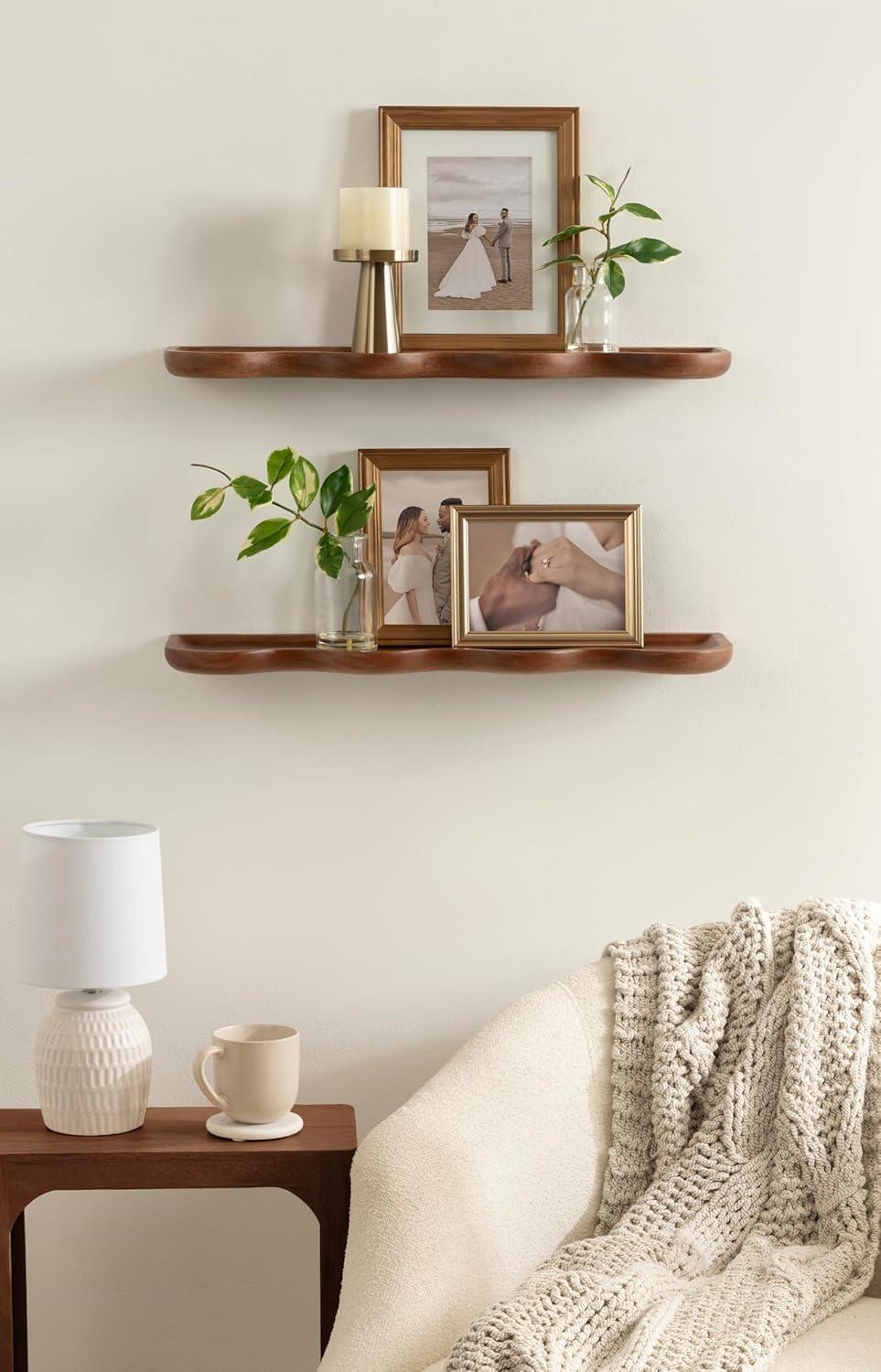 Inspire your inner interior decorator with these functional and beautiful floating shelves. Inspired by wavy curvature and convenient design, the Alezar wall shelves combine modern aesthetics with practical function. These shelves were made from solid mango wood, giving them an elevated quality and appearance. Setting it apart from a standard floating shelf, these shelves boast a youthful scalloped shape that adds a bit of character. The warm walnut brown finish provides a look that lends itself to clean design, allowing the Alezar set to blend into a variety of decorative aesthetics. The two shelves in this set measure 24 inches wide by 6 inches deep by 1.25 inches tall, making them fantastic for display side by side, parallel to each other, or spread throughout separate rooms. Each Alezar shelf has a five-pound weight capacity, giving you the opportunity to store dessert plates and mugs, showcase delightful succulents, or house your favorite keepsakes and media. The two Alezar shelves hang in just a matter of minutes with the convenient hanging brackets that attach directly to the wall for a floating effect.