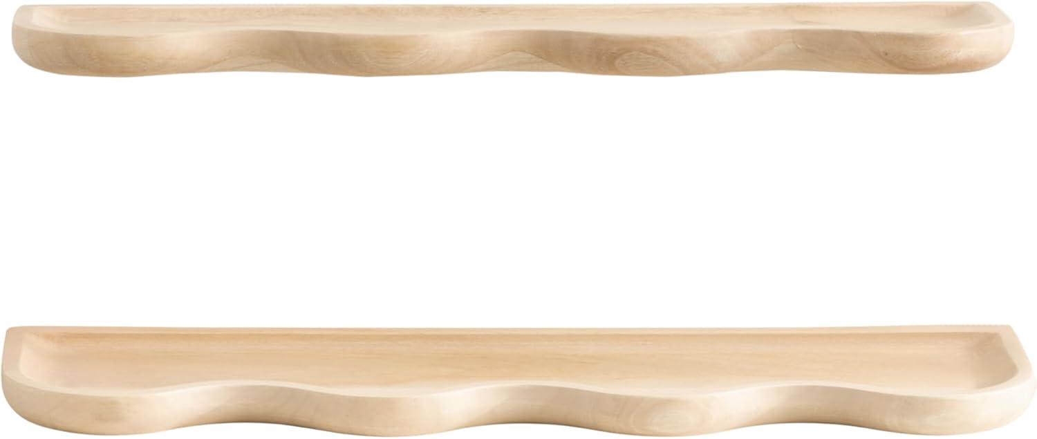 Inspire your inner interior decorator with these functional and beautiful floating shelves. Inspired by wavy curvature and convenient design, the Alezar wall shelves combine modern aesthetics with practical function. These shelves were made from solid mango wood, giving them an elevated quality and appearance. Setting it apart from a standard floating shelf, these shelves boast a youthful scalloped shape that adds a bit of character. The warm walnut brown finish provides a look that lends itself to clean design, allowing the Alezar set to blend into a variety of decorative aesthetics. The two shelves in this set measure 24 inches wide by 6 inches deep by 1.25 inches tall, making them fantastic for display side by side, parallel to each other, or spread throughout separate rooms. Each Alezar shelf has a five-pound weight capacity, giving you the opportunity to store dessert plates and mugs, showcase delightful succulents, or house your favorite keepsakes and media. The two Alezar shelves hang in just a matter of minutes with the convenient hanging brackets that attach directly to the wall for a floating effect.