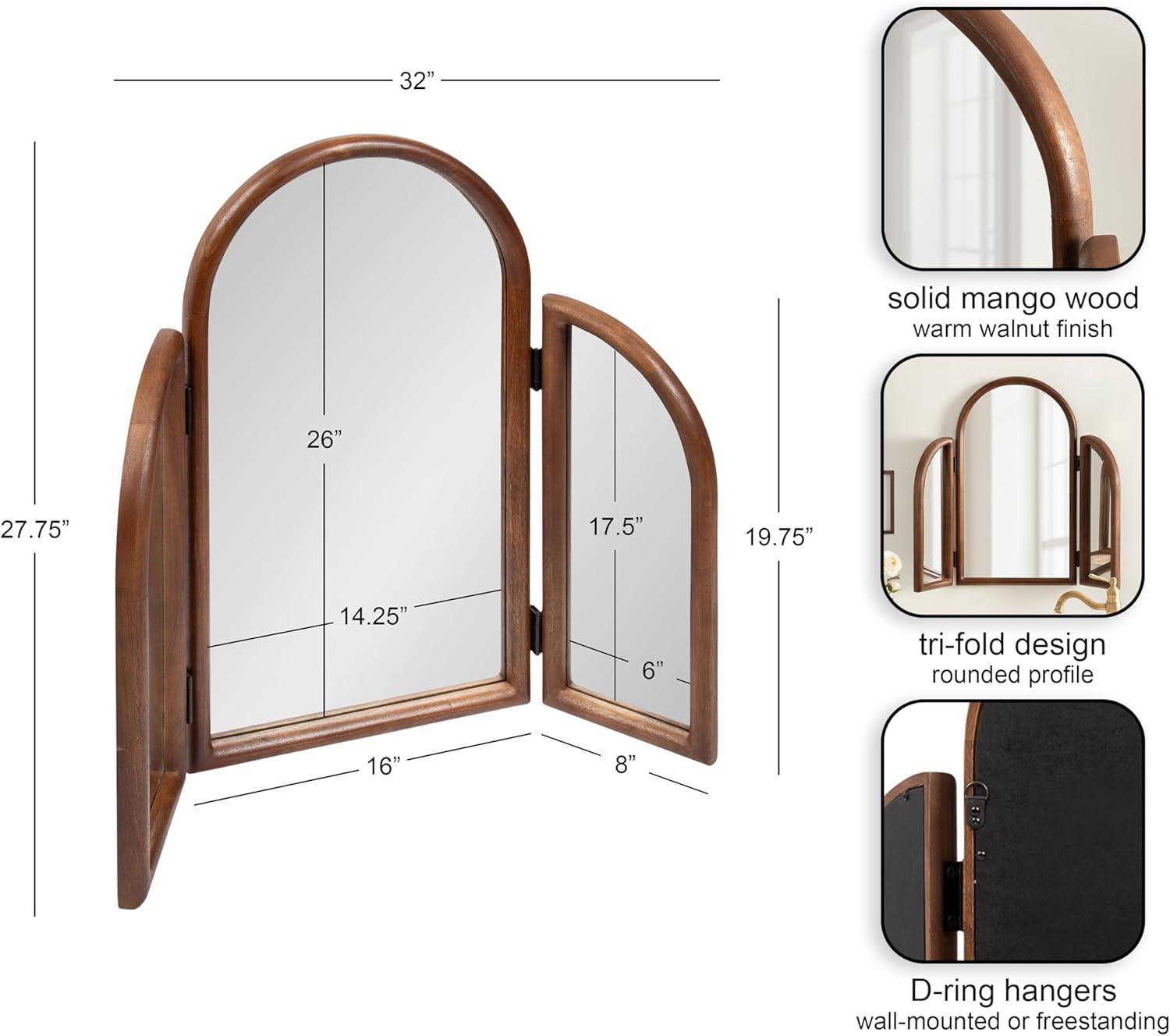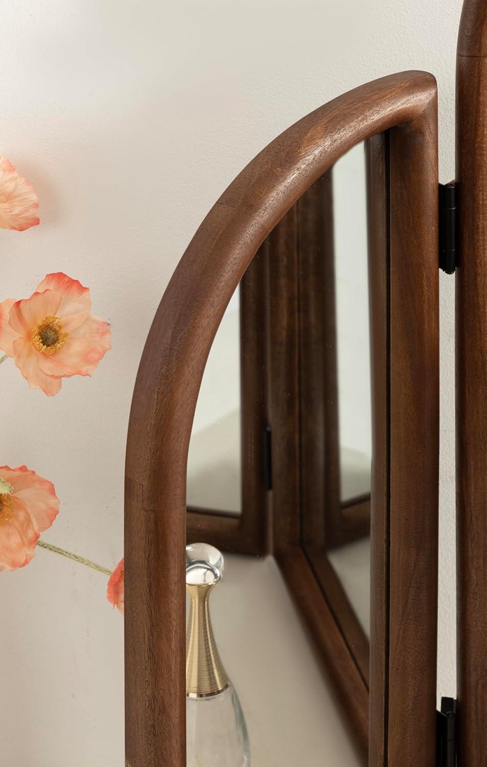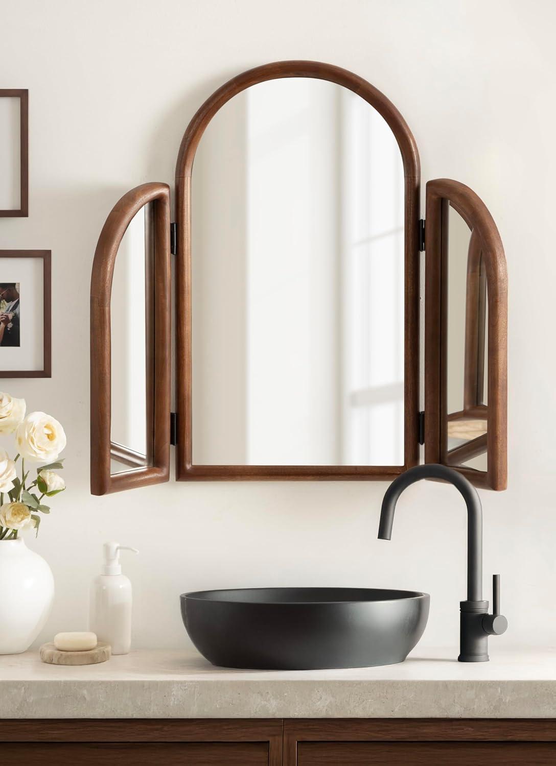 Transform your morning routine with this stunning Amoli tri-fold arch mirror, which is perfect for a makeup station or bathroom vanity setup. This three-mirror design allows you to see various angles by adjusting the position of the side mirrors. Built to last, the Amoli's frame is crafted from solid mango wood, which provides your space with a timeless piece that features handcrafted design variations. The Amoli's unique tri-fold design is sure to spark conversation among guests and serves as a wonderful addition to your home. With its three mirror surfaces, the Amoli provides an added amount of light and depth to your space. Fully spread out, the Amoli measures in at 32 inches wide by 27.75 inches tall with a slim depth of just over one inch. This size makes for a large addition to your space with the ability to fold the complementary mirrors in to save space when needed. The Amoli is designed to work stunningly as both a wall-mounted mirror or a freestanding option, making it quite the versatile piece.