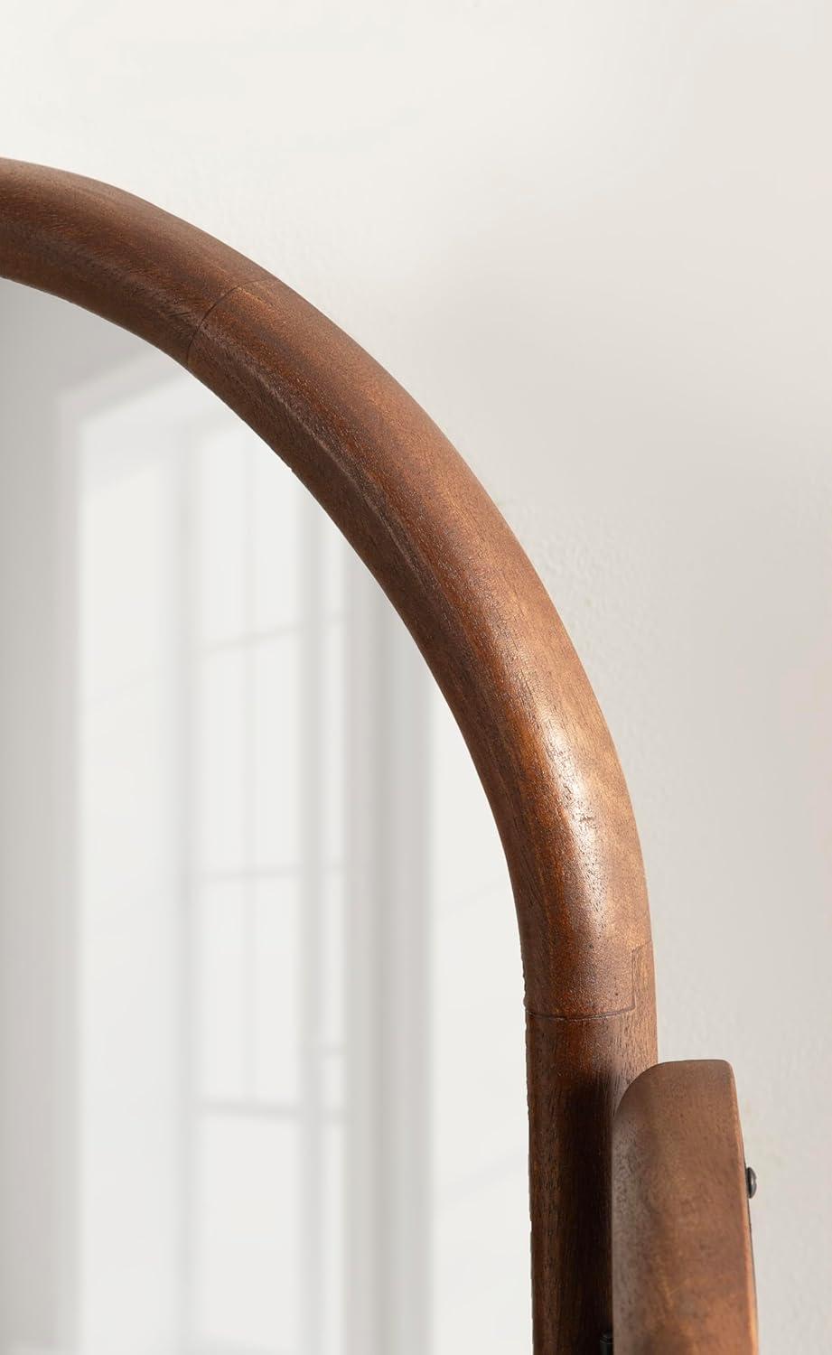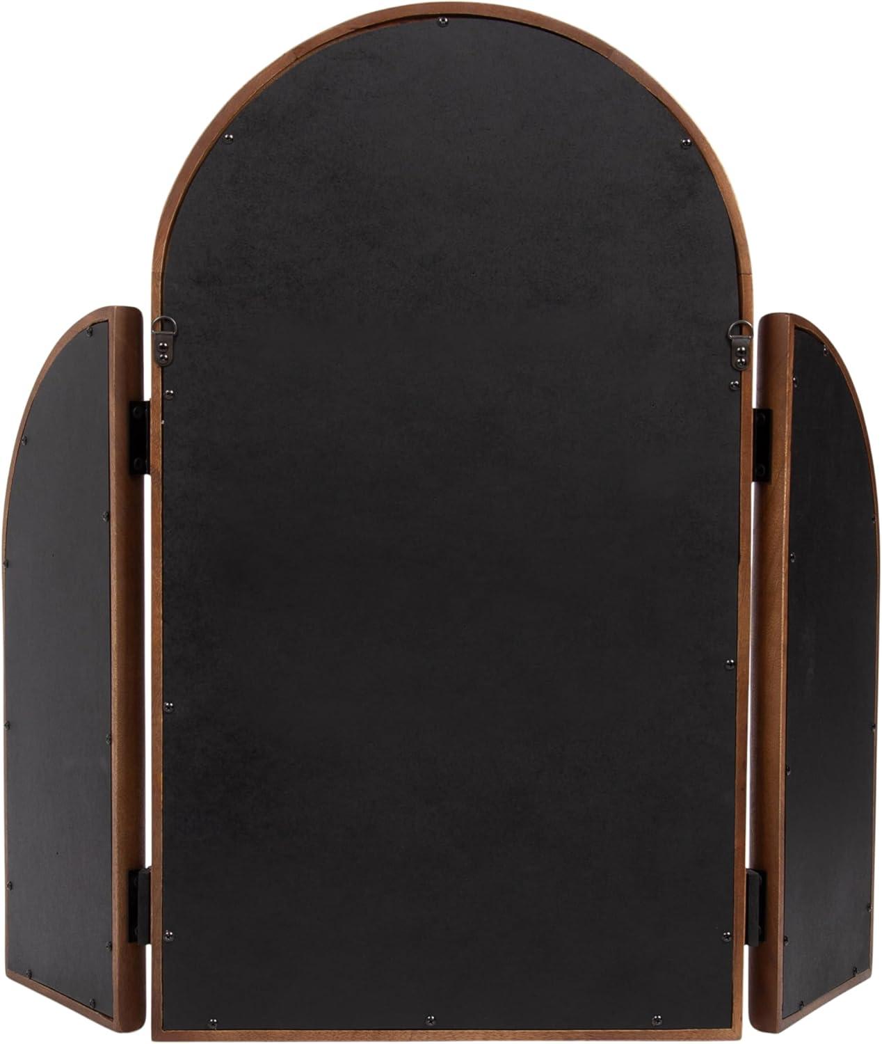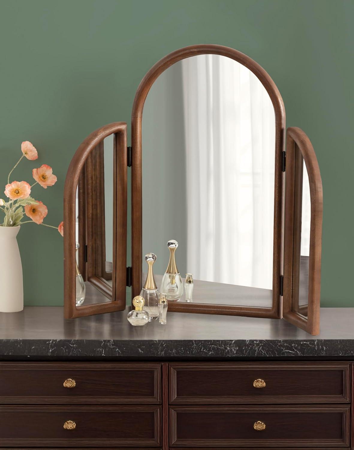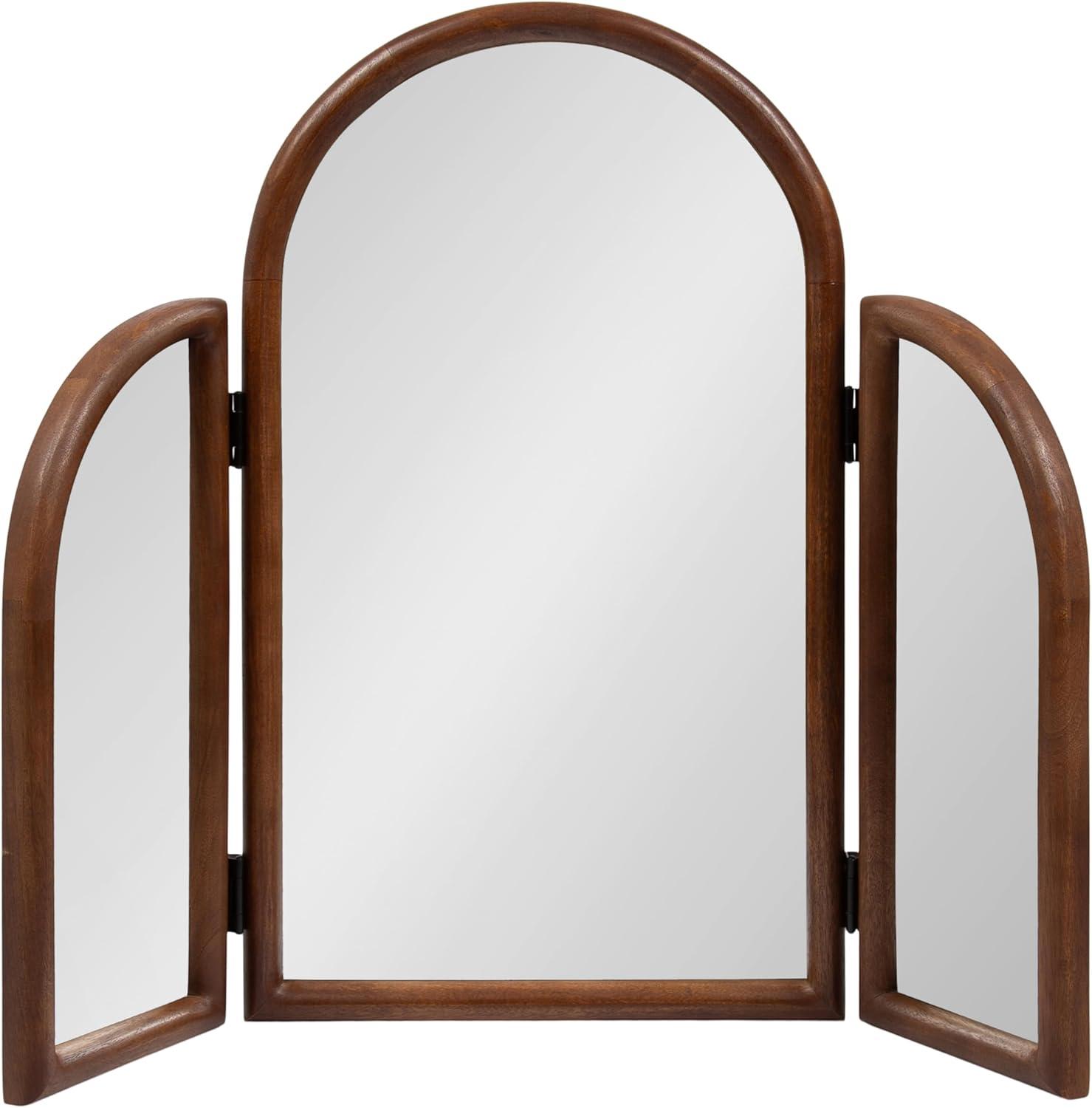 Transform your morning routine with this stunning Amoli tri-fold arch mirror, which is perfect for a makeup station or bathroom vanity setup. This three-mirror design allows you to see various angles by adjusting the position of the side mirrors. Built to last, the Amoli's frame is crafted from solid mango wood, which provides your space with a timeless piece that features handcrafted design variations. The Amoli's unique tri-fold design is sure to spark conversation among guests and serves as a wonderful addition to your home. With its three mirror surfaces, the Amoli provides an added amount of light and depth to your space. Fully spread out, the Amoli measures in at 32 inches wide by 27.75 inches tall with a slim depth of just over one inch. This size makes for a large addition to your space with the ability to fold the complementary mirrors in to save space when needed. The Amoli is designed to work stunningly as both a wall-mounted mirror or a freestanding option, making it quite the versatile piece.