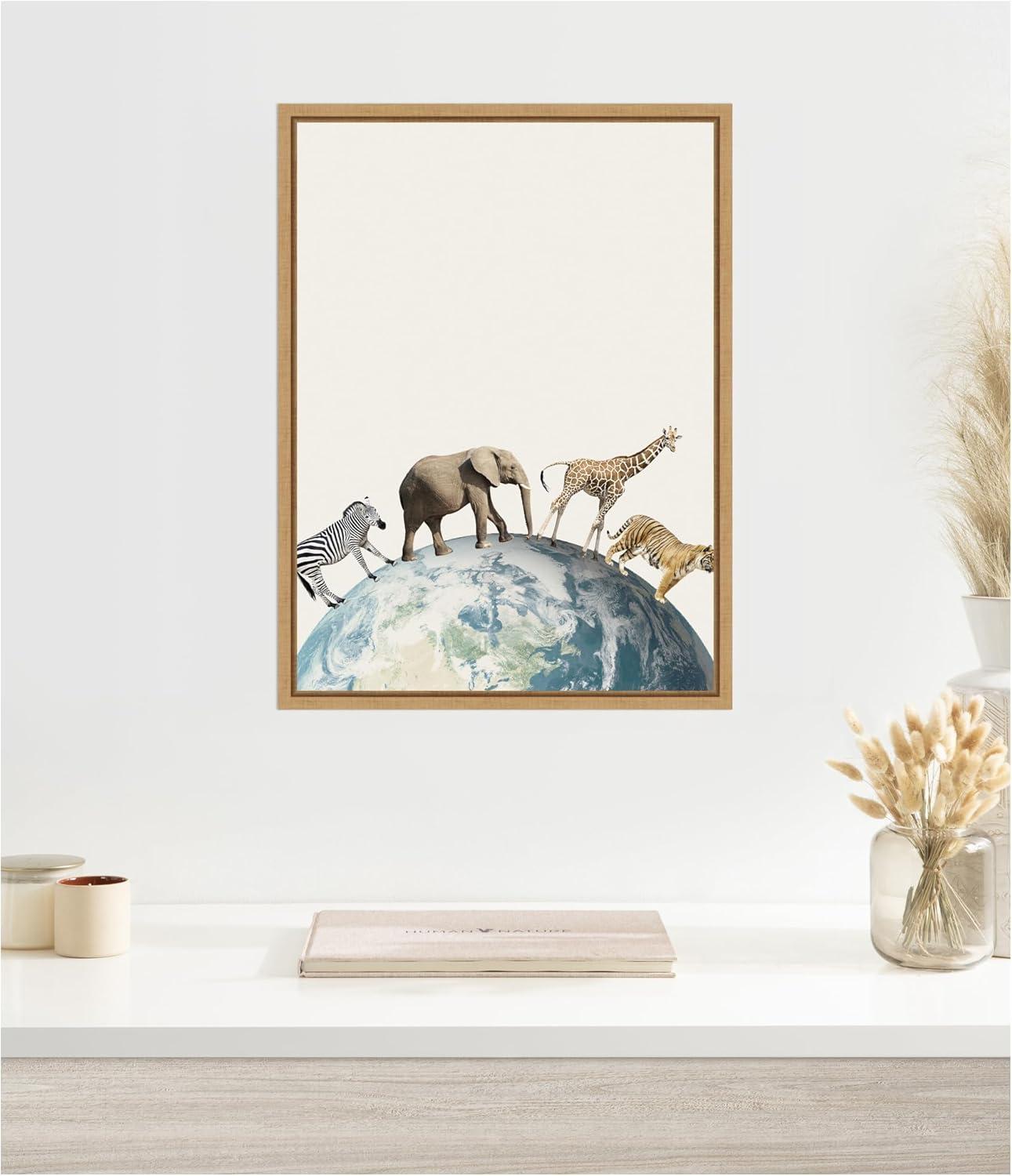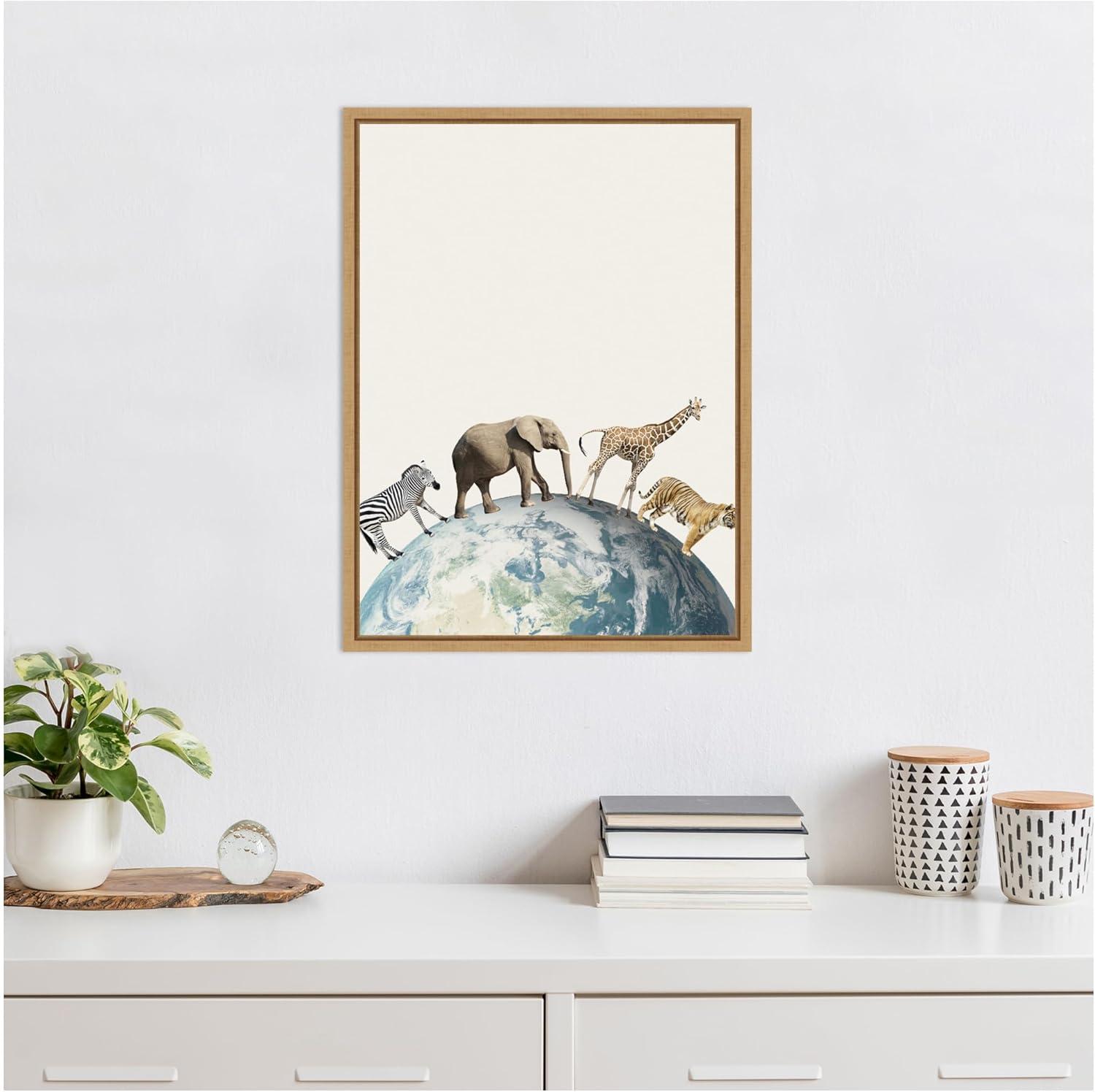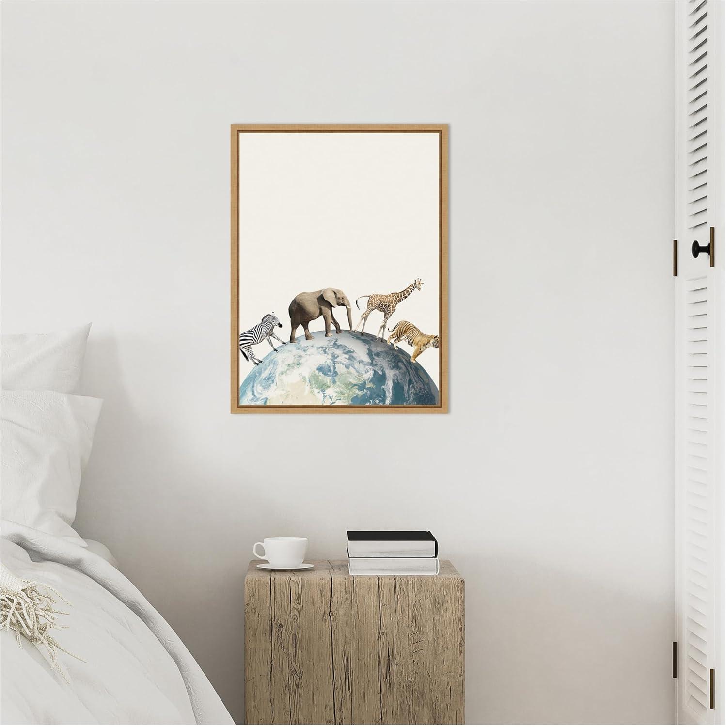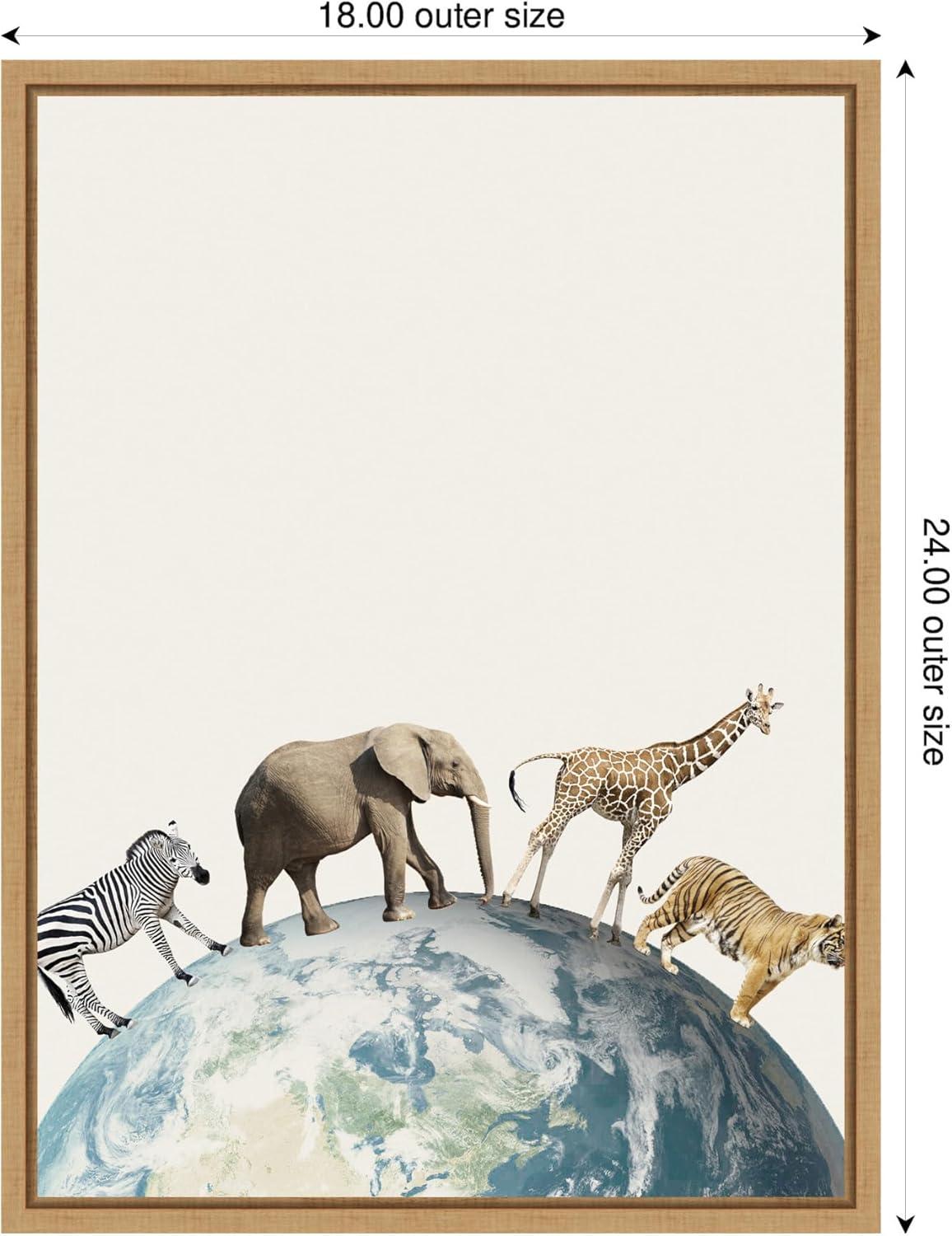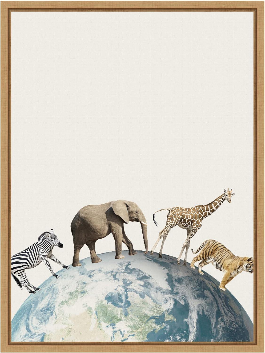 The artwork features a globe with four animals–zebra, elephant, giraffe, and tiger–standing on it. The animals are positioned along the curve of the Earth, symbolizing global wildlife diversity. The background is a simple, light color, highlighting the focus on the animals and planet. This Kate and Laurel canvas art print was created by July Art Prints and printed by Kate and Laurel in Waunakee WI. This modern floating canvas art is sure to bring joy to your space. Our design team curates art that will fit perfectly in any room of your home. Showcase this art in your living room, bedroom, home office, kitchen, bathroom, nursery, or anywhere you want to bring a little beauty and charm to your walls. Specializing in home decor, we are continually bringing timeless works of art for the traditional decorator as well as trend-forward pieces for that eclectic art lover. Our high-quality framed canvas art also makes excellent gifts for birthdays, holidays, or housewarming parties. Printed on gallery-wrapped canvas and framed with a simple gallery frame this wall art is easy to display on the wall and will match with any decor style. The outside display dimensions are 18 in x 24 in by 1.6 in Print Name: “Animals Walk Across the Planet”