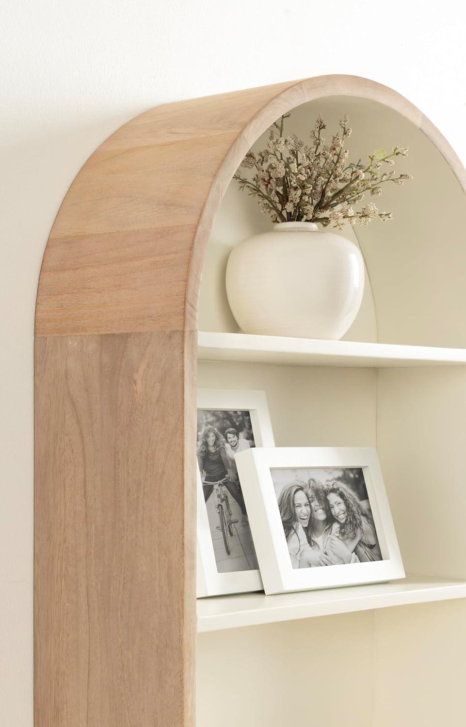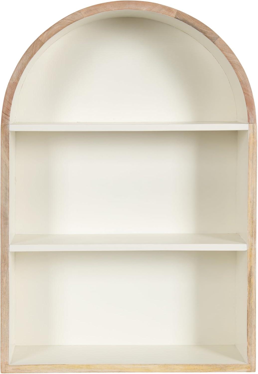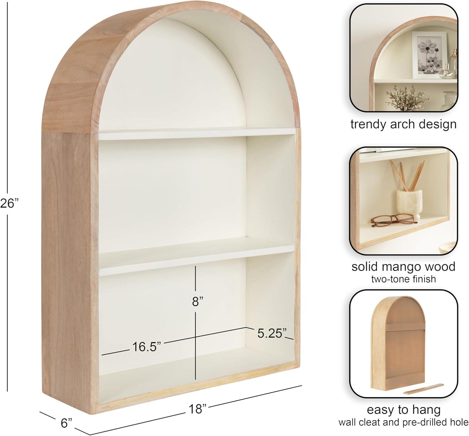 The Arcott shelving unit embraces an elegant look and provides functional storage for your home. Inspired by modern design, the Arcott shelf features a geometric design with a tall arched shape and a refined, two-tone white and light natural wood finish. The storage shelf is made with the utmost quality, crafted from solid mango wood, giving it an elegant look and resilient, premium construction. This shelf makes a welcome addition to your living room, bedroom, entryway, or bathroom, thanks to its functional design. The storage shelf's arched design gives your space fun curvature without taking away from its refined look. The overall dimensions of the Arcott shelf are 18 inches wide by 6 inches deep by 26 inches tall, creating a commanding statement in any room of your home. Each of the three shelves is perfect for displaying cherished decorative accents and storing household items, measuring 16.5 inches wide by 5.25 inches deep. Use the included cleat hanger and the through hole for a quick and easy installation process.