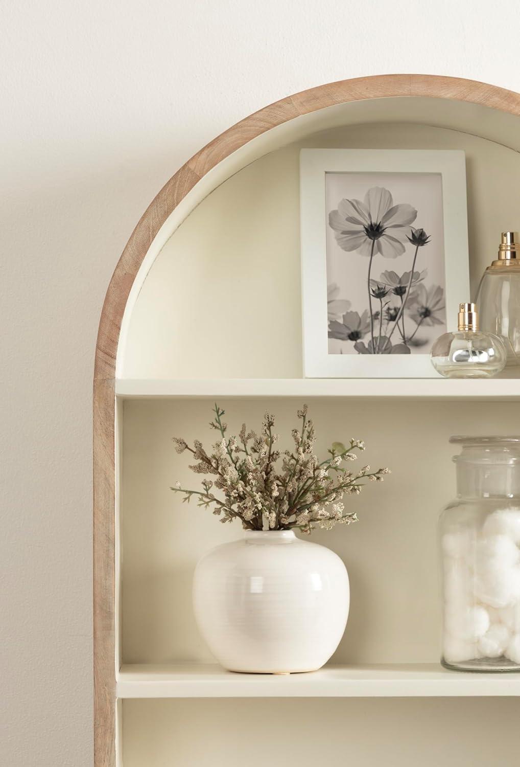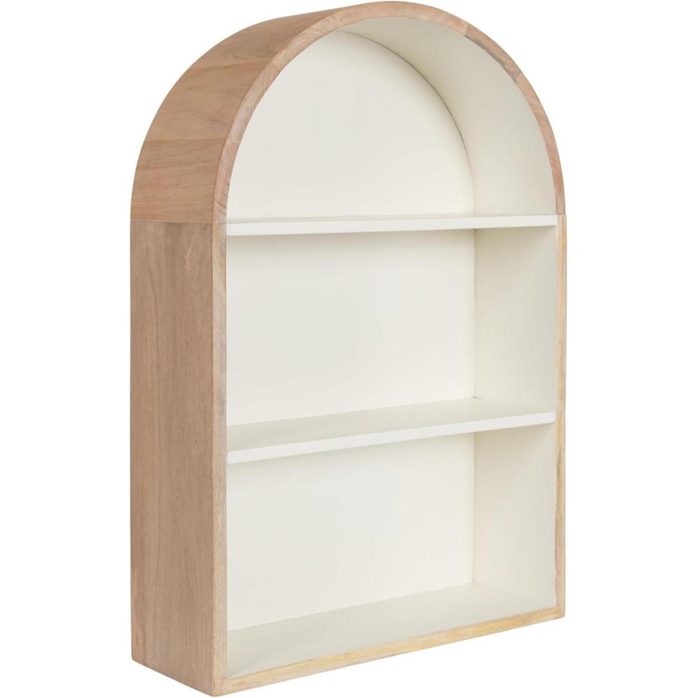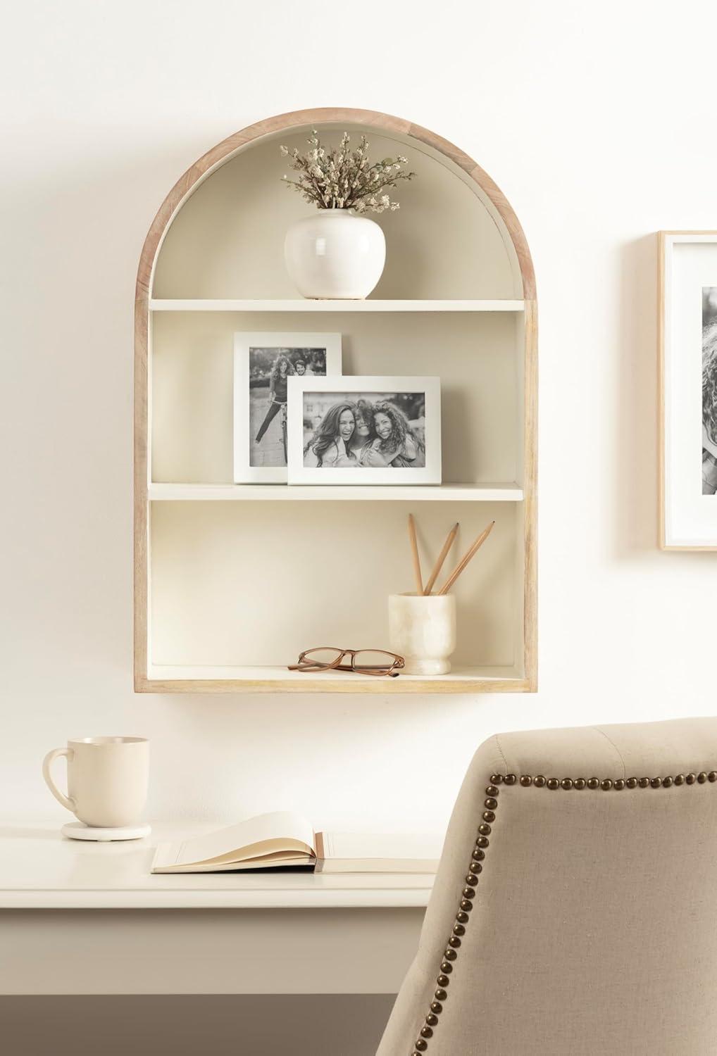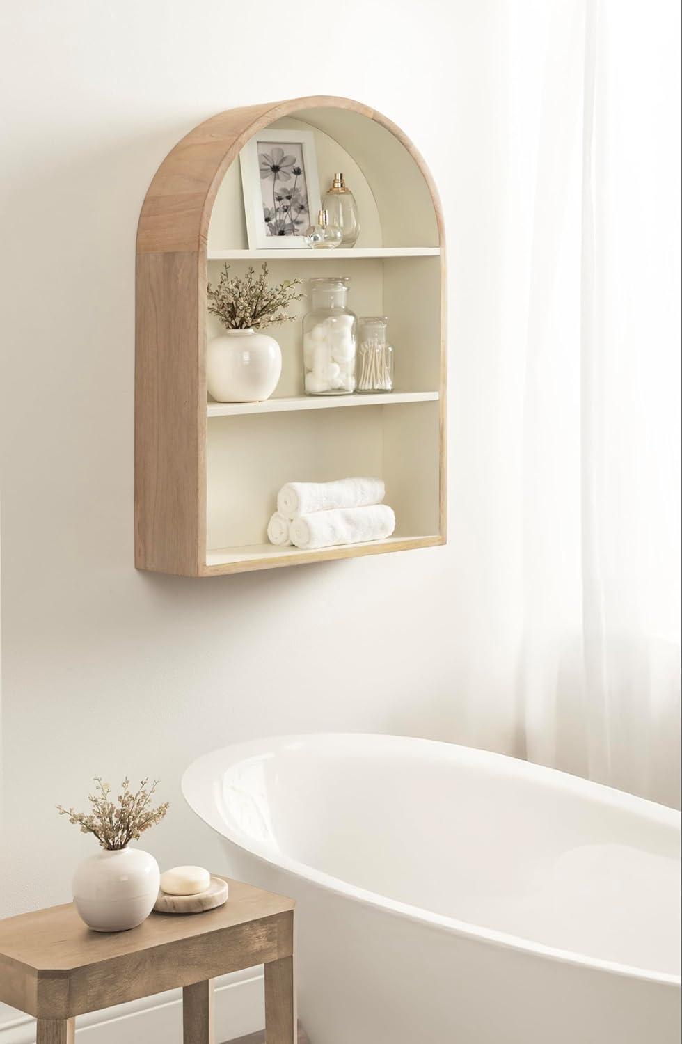 The Arcott shelving unit embraces an elegant look and provides functional storage for your home. Inspired by modern design, the Arcott shelf features a geometric design with a tall arched shape and a refined, two-tone white and light natural wood finish. The storage shelf is made with the utmost quality, crafted from solid mango wood, giving it an elegant look and resilient, premium construction. This shelf makes a welcome addition to your living room, bedroom, entryway, or bathroom, thanks to its functional design. The storage shelf's arched design gives your space fun curvature without taking away from its refined look. The overall dimensions of the Arcott shelf are 18 inches wide by 6 inches deep by 26 inches tall, creating a commanding statement in any room of your home. Each of the three shelves is perfect for displaying cherished decorative accents and storing household items, measuring 16.5 inches wide by 5.25 inches deep. Use the included cleat hanger and the through hole for a quick and easy installation process.