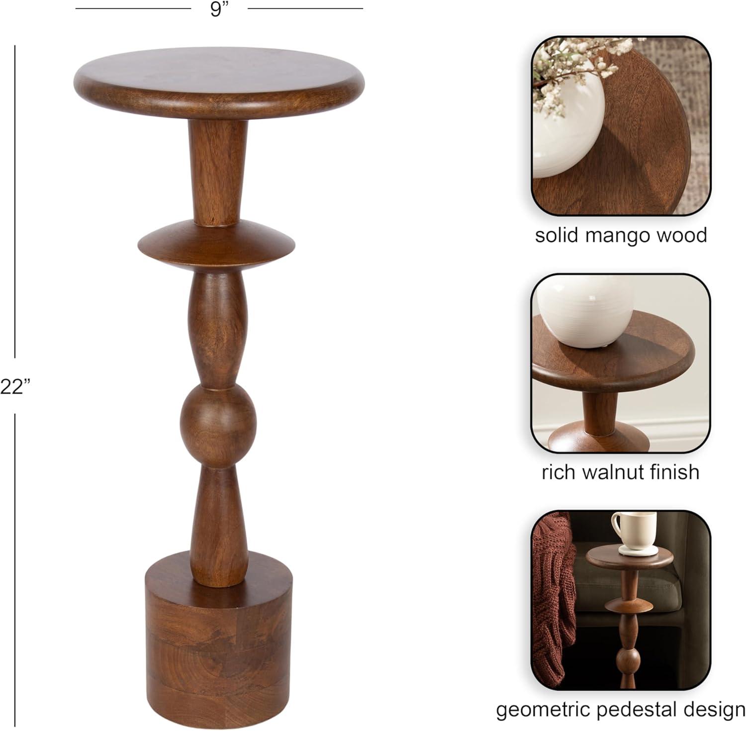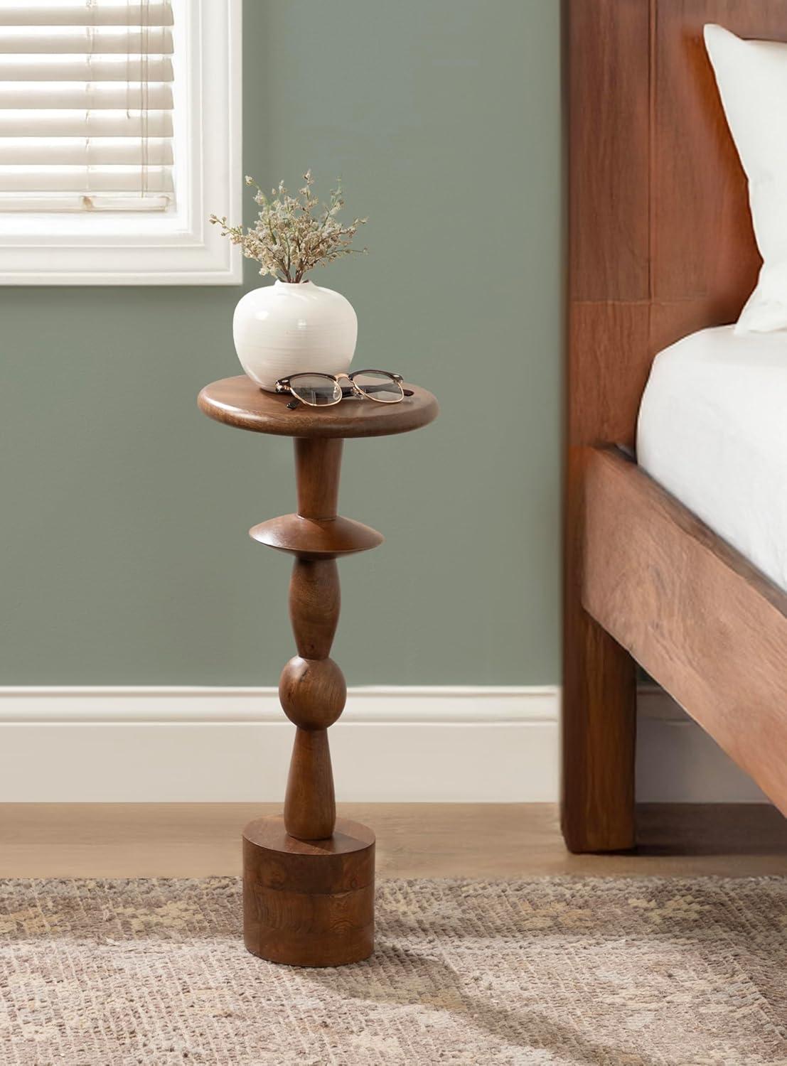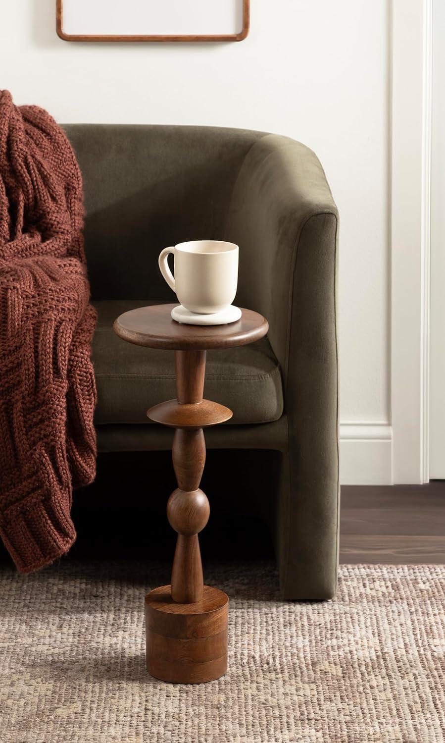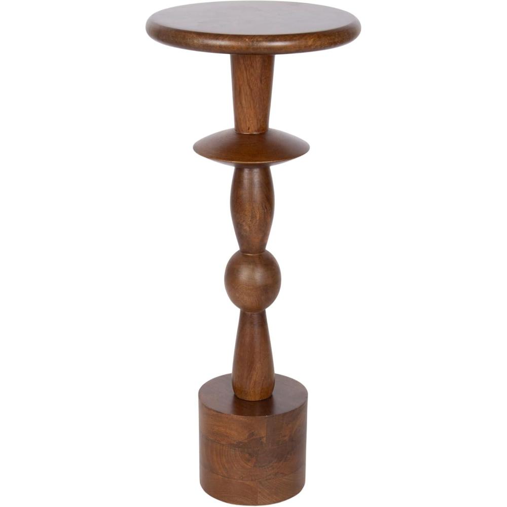 Introducing our beautifully crafted Avenal drink table, the perfect addition to any living room, home office, or sunroom. Made from high-quality mango wood, this mini table offers a stylish turned leg and a sturdy, reliable surface to hold your drinks, plants, or any items you may need within reach. Measuring 22 inches in height and 9 inches in diameter, this martini table is the perfect size to fit next to your favorite armchair or couch. The walnut brown finish of the wood provides a warm look that complements a variety of decor styles. Not only is this wooden side table functional and stylish, but it's also durable and long-lasting. The mango wood construction ensures that it can withstand regular use and will feature unique variations within the woodgrain based on its organic wood structure. Plus, its compact size makes it easy to move around and store when not in use. This versatile table is perfect for enjoying a relaxing evening at home or hosting a gathering with friends and family. The two-step assembly is quick and easy with no hardware needed. The instructions are clear and concise, making it a breeze to put together in just seconds.