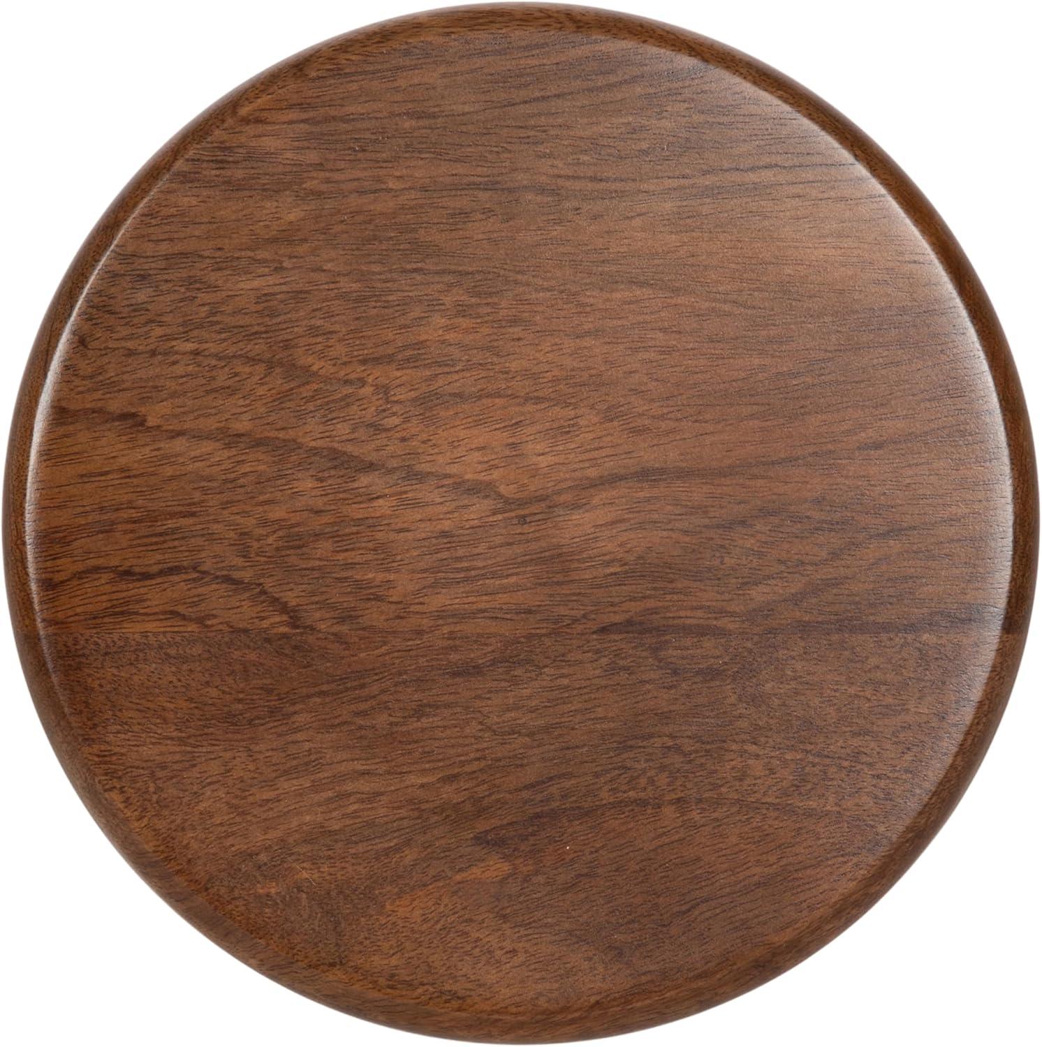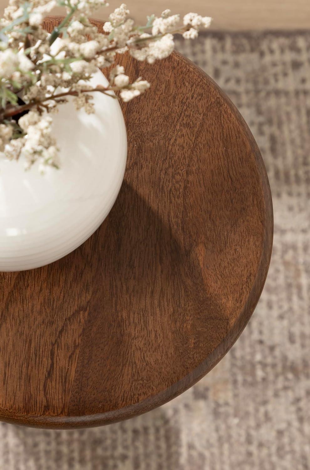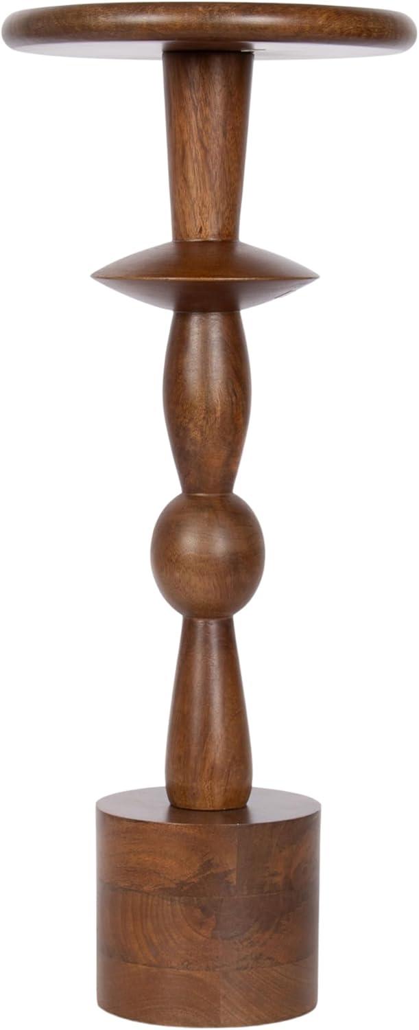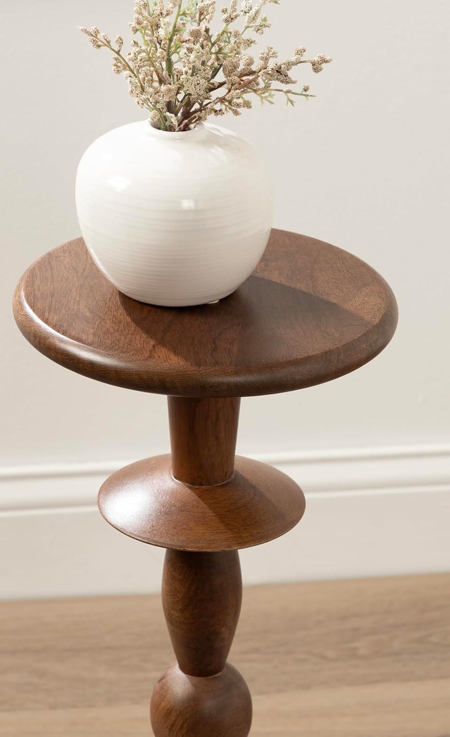 Introducing our beautifully crafted Avenal drink table, the perfect addition to any living room, home office, or sunroom. Made from high-quality mango wood, this mini table offers a stylish turned leg and a sturdy, reliable surface to hold your drinks, plants, or any items you may need within reach. Measuring 22 inches in height and 9 inches in diameter, this martini table is the perfect size to fit next to your favorite armchair or couch. The walnut brown finish of the wood provides a warm look that complements a variety of decor styles. Not only is this wooden side table functional and stylish, but it's also durable and long-lasting. The mango wood construction ensures that it can withstand regular use and will feature unique variations within the woodgrain based on its organic wood structure. Plus, its compact size makes it easy to move around and store when not in use. This versatile table is perfect for enjoying a relaxing evening at home or hosting a gathering with friends and family. The two-step assembly is quick and easy with no hardware needed. The instructions are clear and concise, making it a breeze to put together in just seconds.
