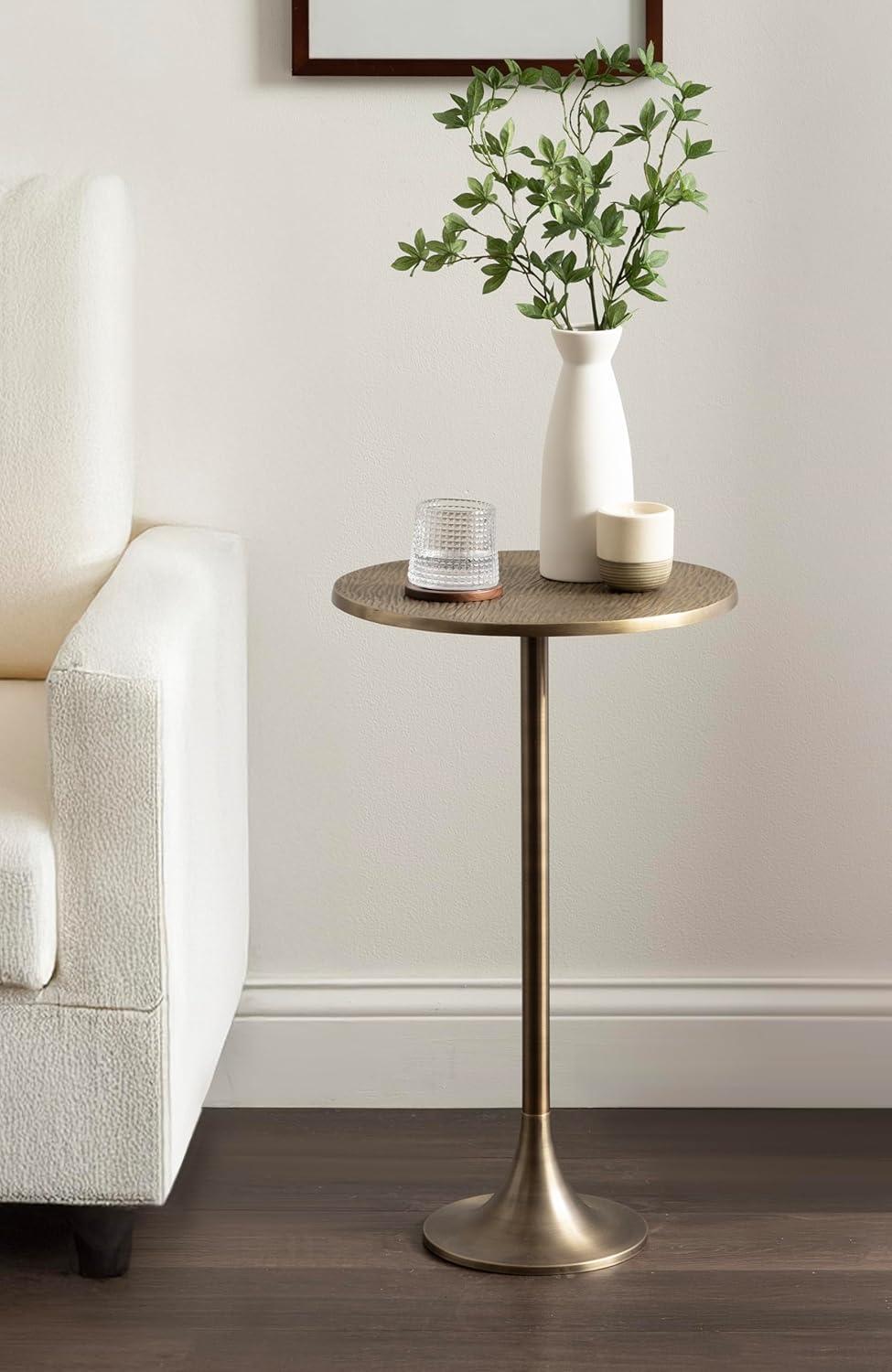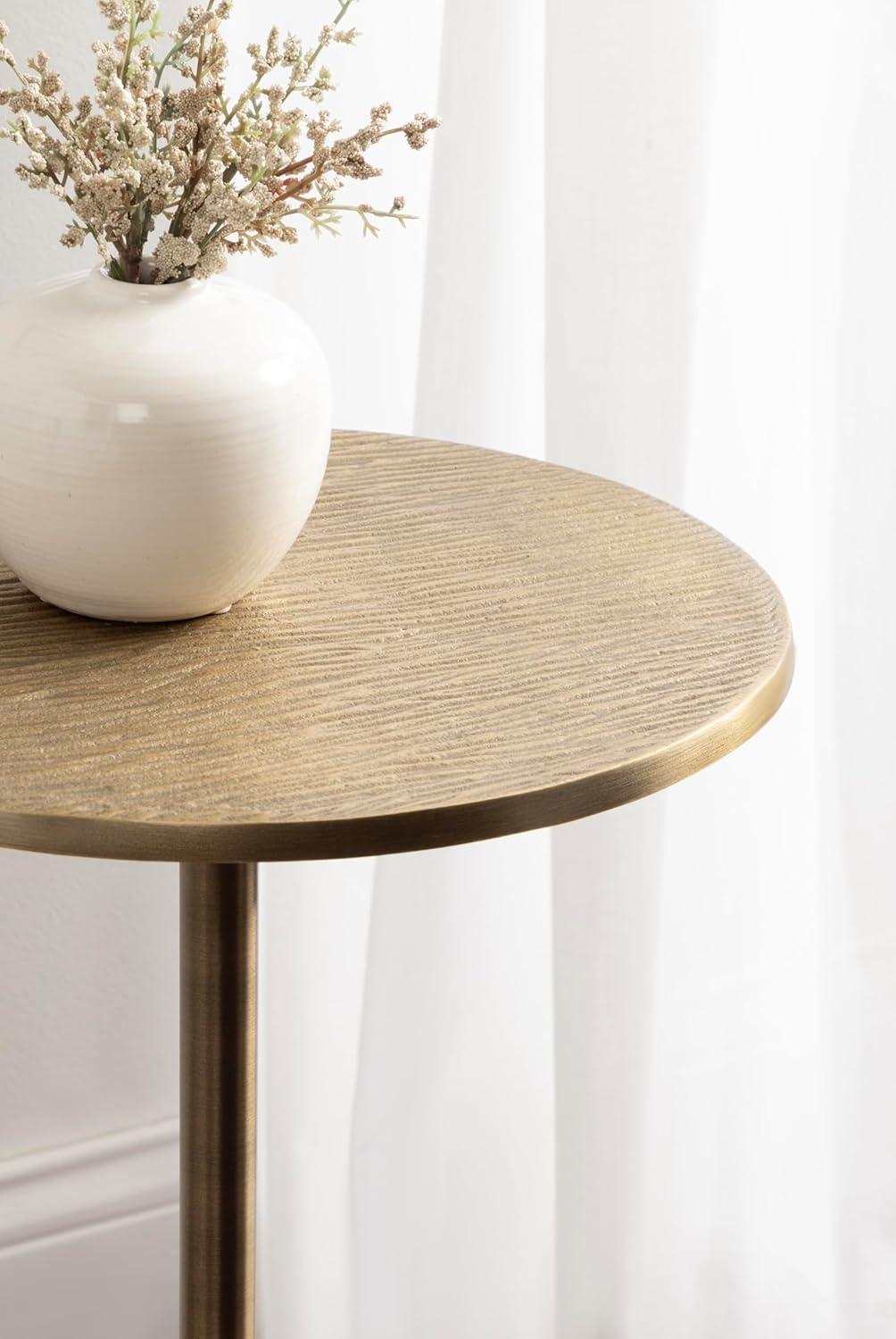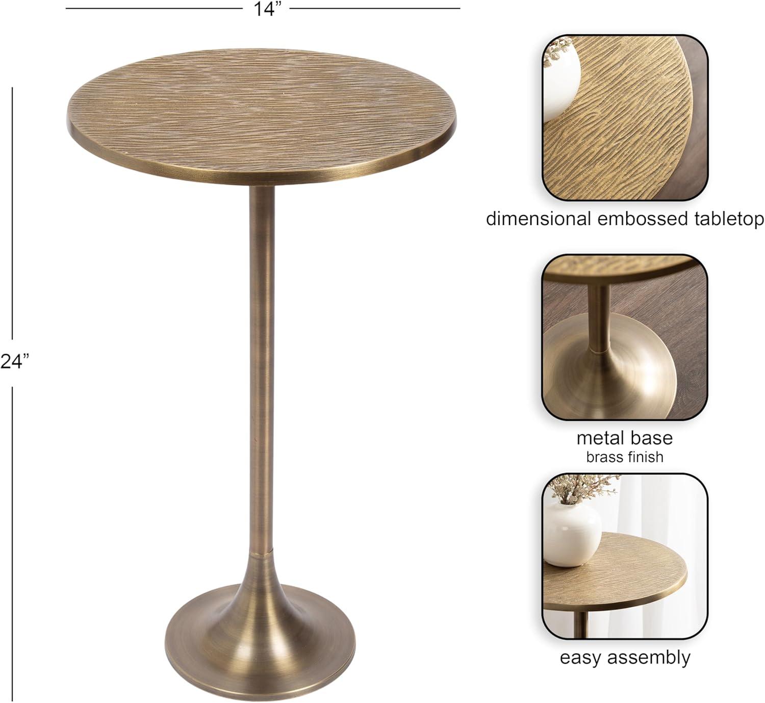 Introducing the Kate and Laurel Baronet round side table, a captivating blend of modern glam and natural elegance. The antique brass table's striking combination of the cast aluminum tabletop and the stunning iron base creates a luxurious aesthetic that is sure to impress. That cast aluminum tabletop features a unique texture that sets this table apart and makes it a charming place to set your drinks or a tabletop lamp. This delightful cocktail table is a beautiful accent for serving and placing drinks when friends are around due to its sturdy metal base. Its versatile size and round tabletop allow for easy placement and rearrangement to suit your needs. This exquisite circular end table boasts dimensions of 14 inches in diameter by 24 inches high, making it the perfect addition to your living room, bedroom, or any space in need of a stylish accent piece. Whether you place it next to your sofa, by your bedside, or in a cozy reading nook, this versatile drink table effortlessly enhances any space. The circular shape promotes a harmonious flow. It also offers ample surface area for holding drinks, snacks, or a good book within arm's reach.