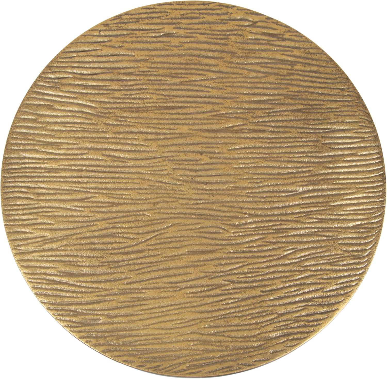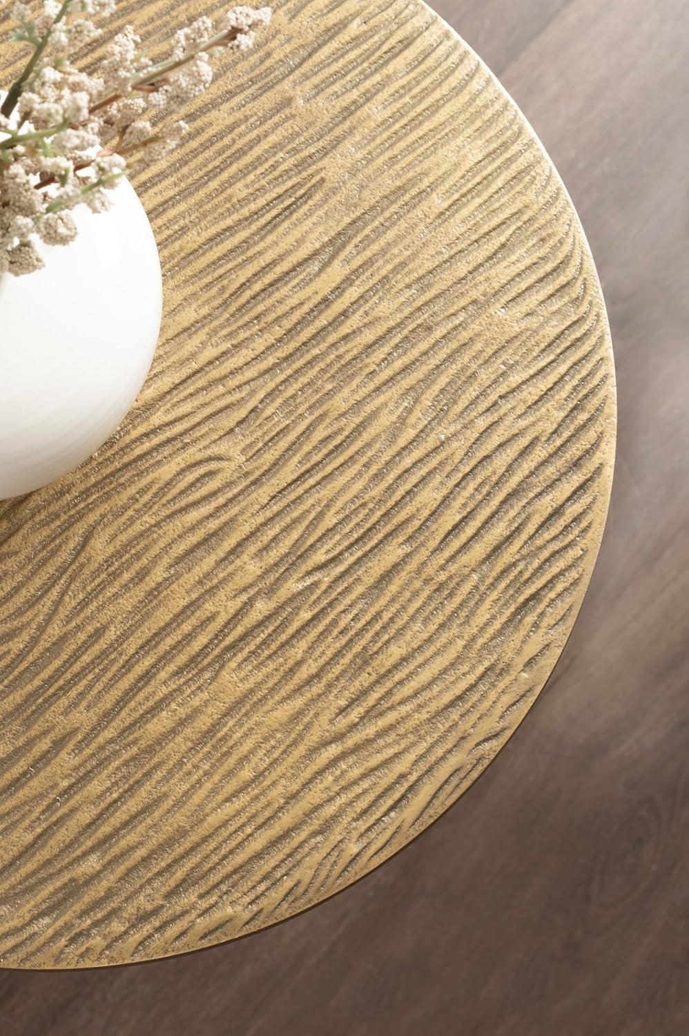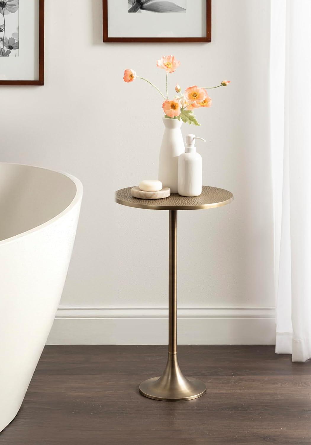 Introducing the Kate and Laurel Baronet round side table, a captivating blend of modern glam and natural elegance. The antique brass table's striking combination of the cast aluminum tabletop and the stunning iron base creates a luxurious aesthetic that is sure to impress. That cast aluminum tabletop features a unique texture that sets this table apart and makes it a charming place to set your drinks or a tabletop lamp. This delightful cocktail table is a beautiful accent for serving and placing drinks when friends are around due to its sturdy metal base. Its versatile size and round tabletop allow for easy placement and rearrangement to suit your needs. This exquisite circular end table boasts dimensions of 14 inches in diameter by 24 inches high, making it the perfect addition to your living room, bedroom, or any space in need of a stylish accent piece. Whether you place it next to your sofa, by your bedside, or in a cozy reading nook, this versatile drink table effortlessly enhances any space. The circular shape promotes a harmonious flow. It also offers ample surface area for holding drinks, snacks, or a good book within arm's reach.