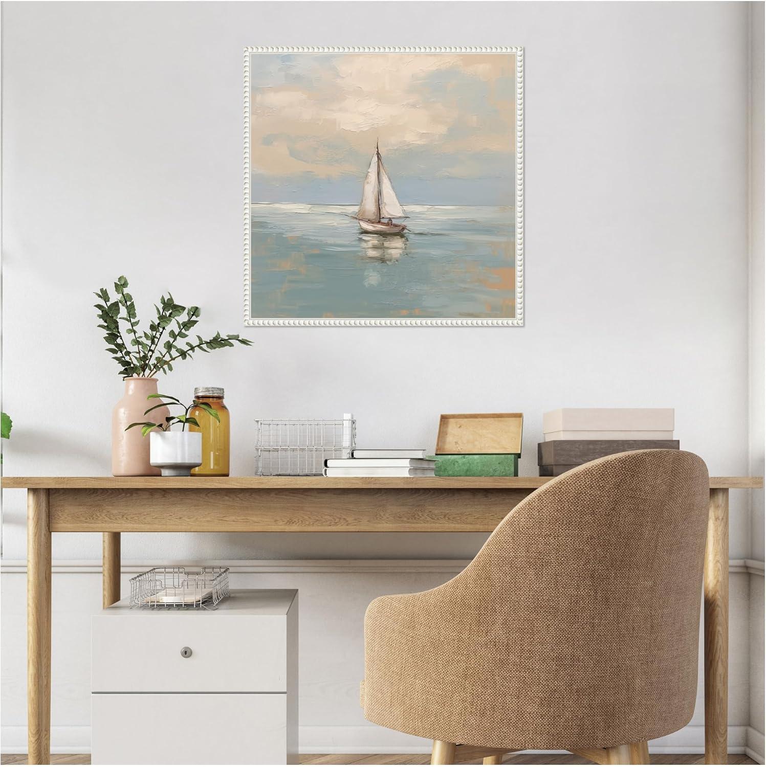 Kate and Laurel Calm Pastel Sailboat Landscape Framed Canvas Wall Art by The Creative Bunch Studio 22 x 22 Sylvie Beaded White, Coastal, Beach, Landscapes Art for Wall Decor, Living Room, Bedroom(Natural)