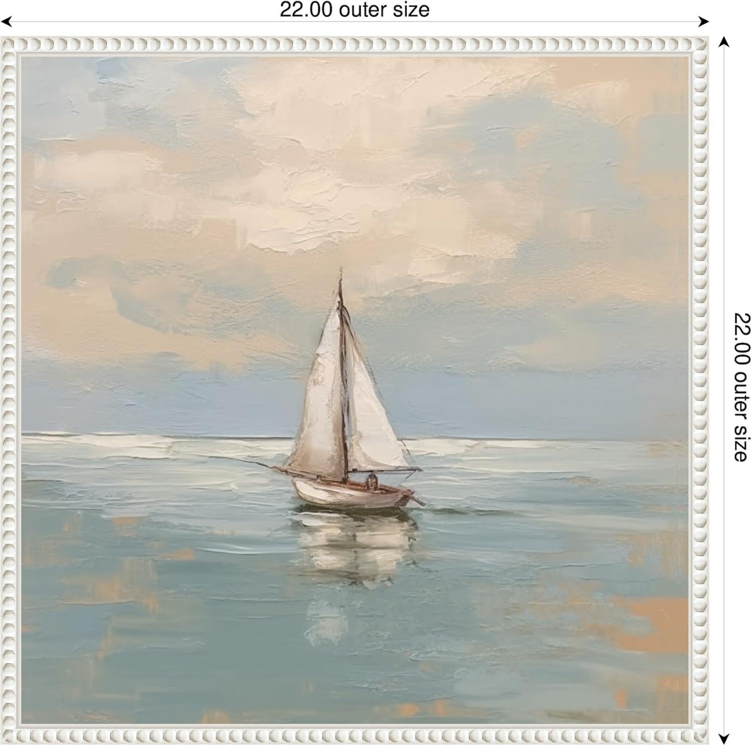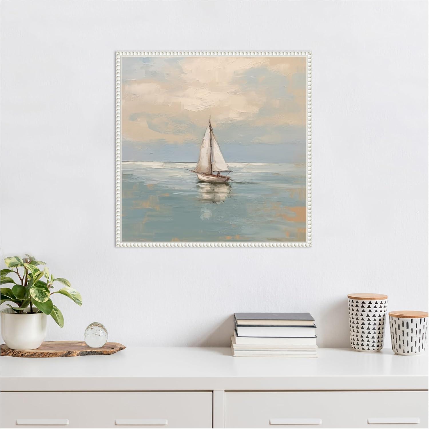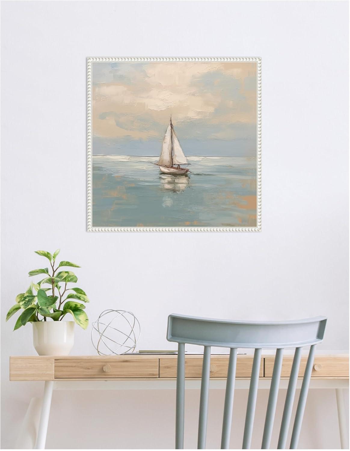Kate and Laurel Calm Pastel Sailboat Landscape Framed Canvas Wall Art by The Creative Bunch Studio 22 x 22 Sylvie Beaded White, Coastal, Beach, Landscapes Art for Wall Decor, Living Room, Bedroom(Beaded White)