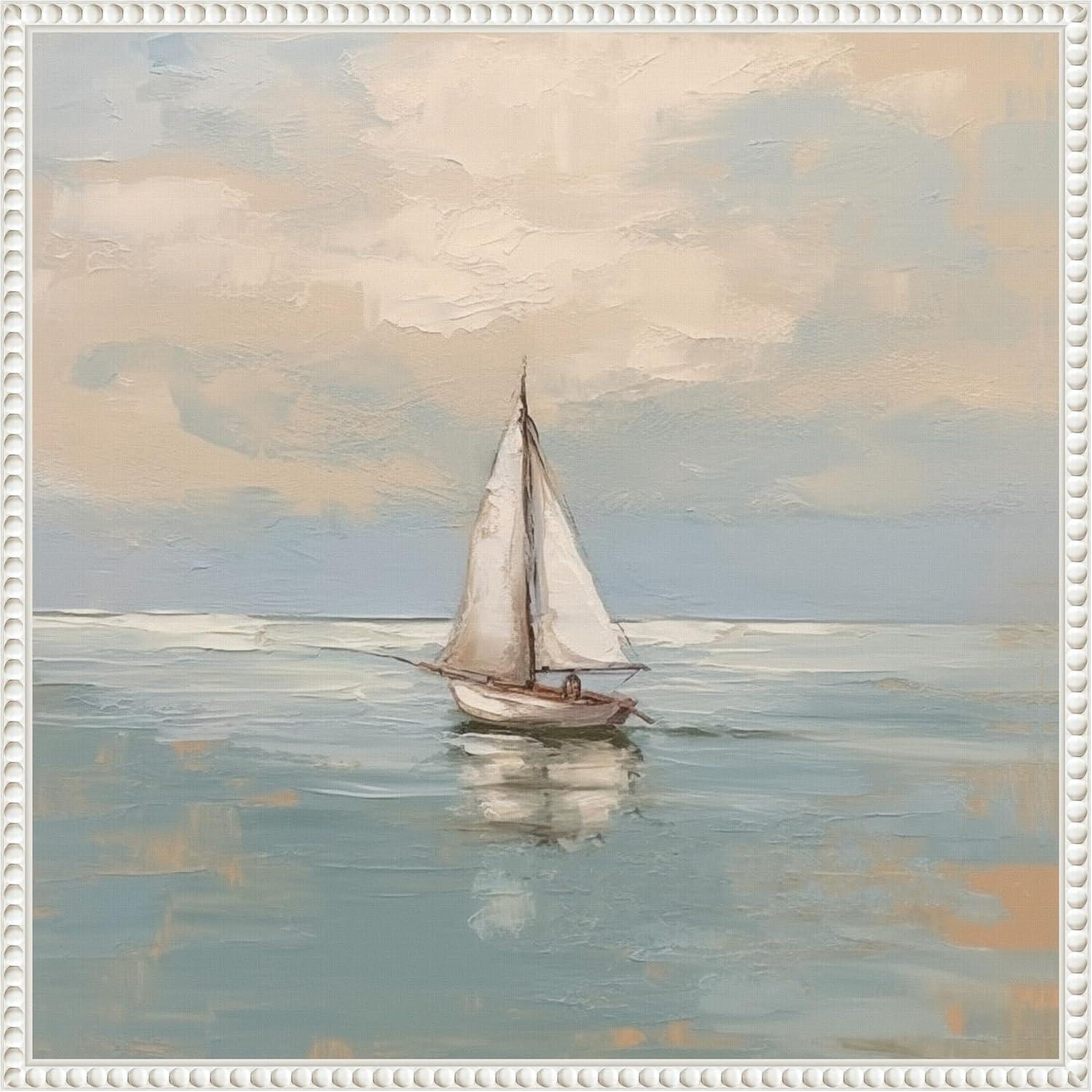 Art Description: A lone sailboat gracefully glides across a calm ocean, capturing a moment of serene tranquility. The soft colors of the sky and water blend harmoniously, reflecting the peaceful ambiance of the scene. Gentle brushstrokes create a sense of movement and light, enhancing the soothing atmosphere.