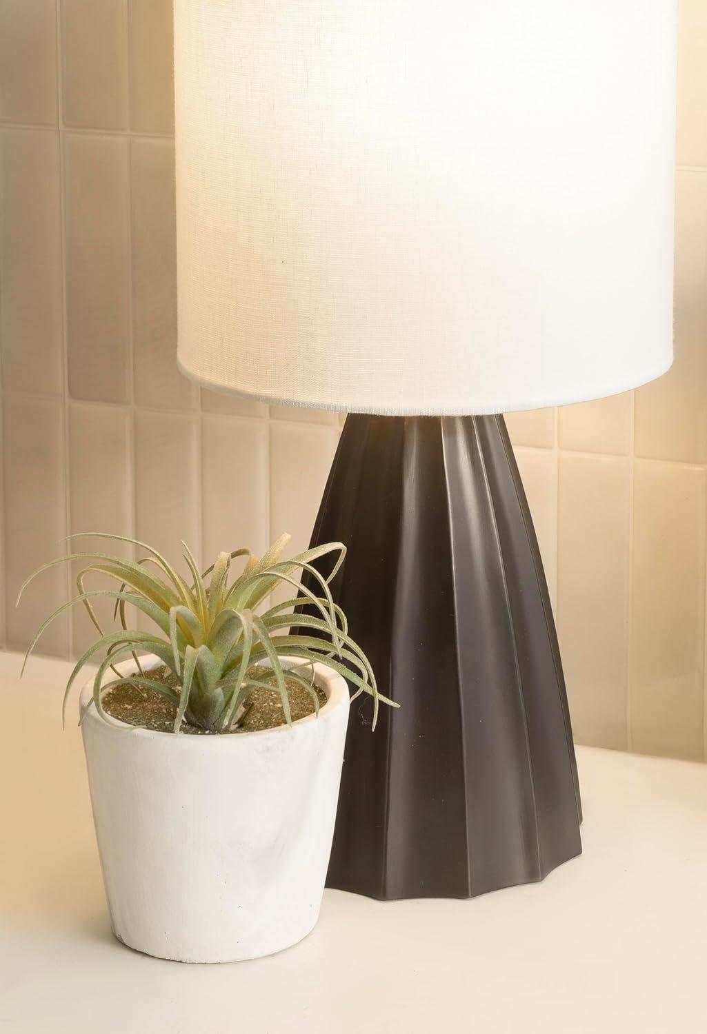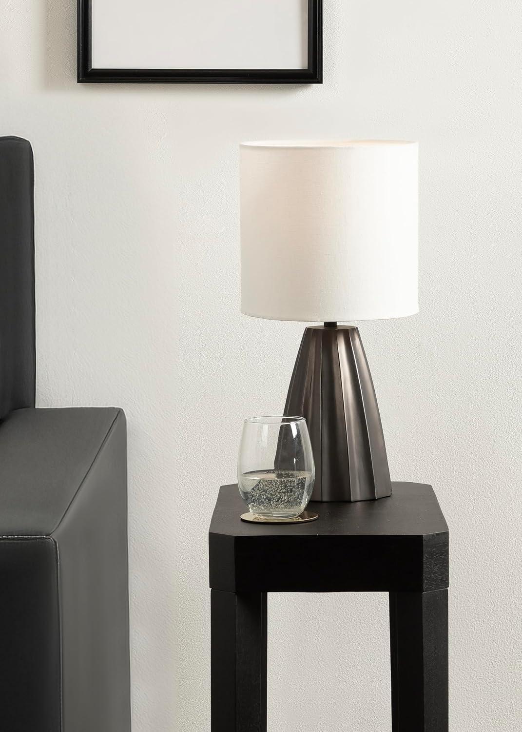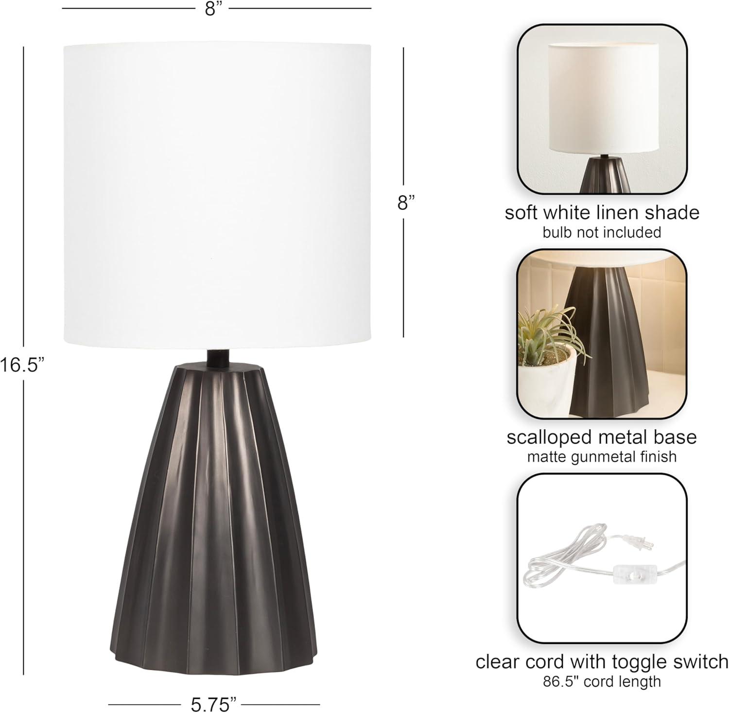 Elevate your home lighting with the Ciji bedside table lamp from Kate and Laurel—a sculptural piece that blends functional design with contemporary decor. Standing 16.5 inches tall, this compact yet eye-catching lamp features a sturdy 8-inch diameter with a sleek gunmetal finish, offering a modern aesthetic that complements a variety of decor styles, from minimalist to transitional. The scalloped, geometric metal base adds an artistic flair, making it as much a decorative object as a source of light. Topped with a soft white linen drum shade, the Ciji lamp diffuses light softly, creating a warm and inviting atmosphere perfect for bedrooms, living rooms, or home offices. Whether placed on a nightstand, console table, or desk, this lamp provides both style and substance. Designed for easy use with a standard E26 bulb (not included) that is up to 60 watts for an incandescent bulb or a 9W LED bulb, it's the perfect balance of practicality and elevated design. A UL-Certified product, this tabletop lamp can be used without worry. Add a modern edge to your space with this bold yet refined lighting piece.