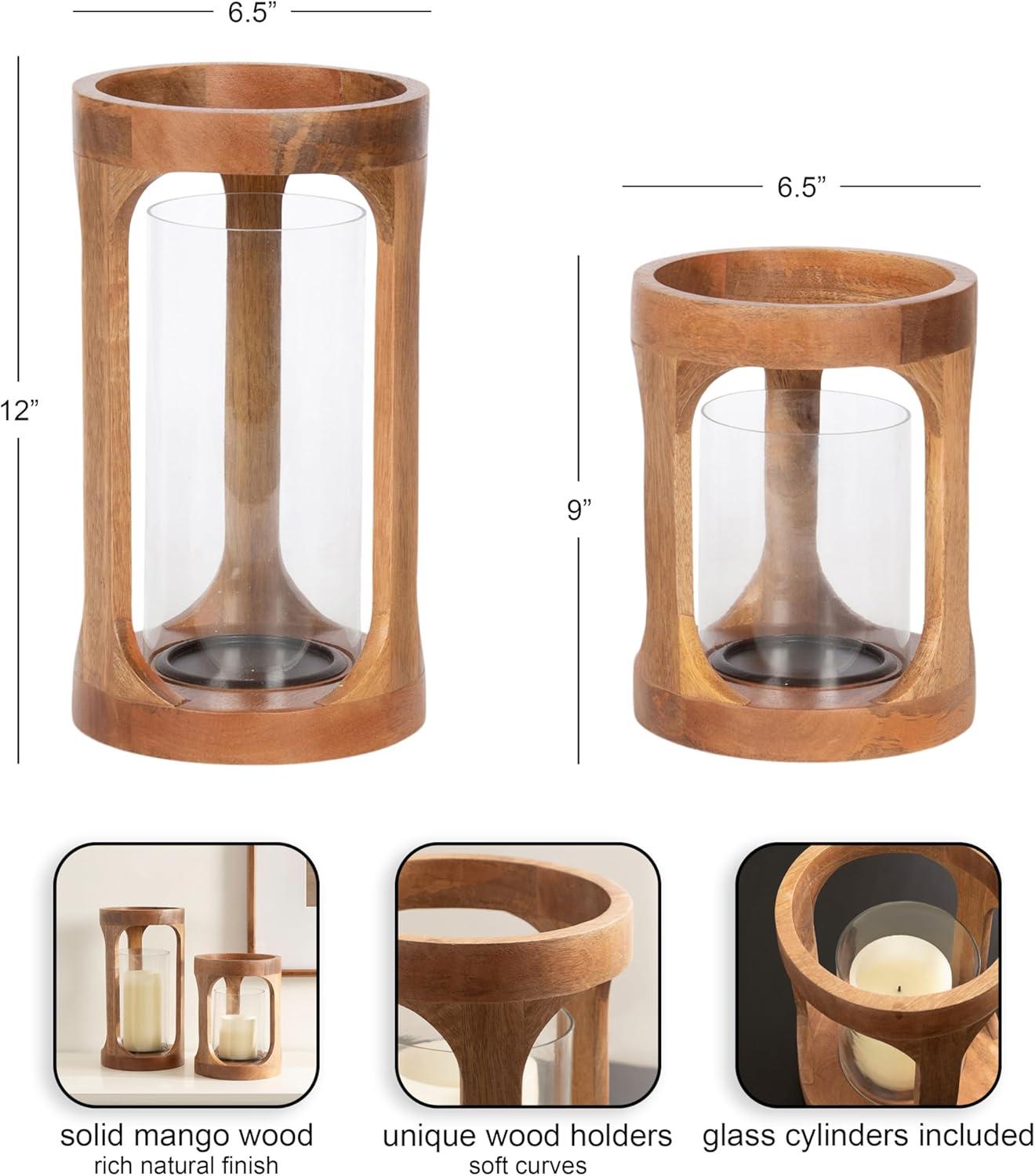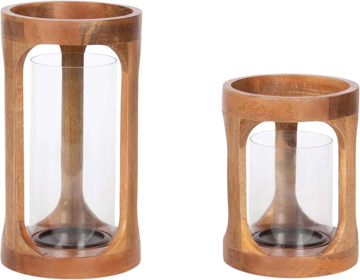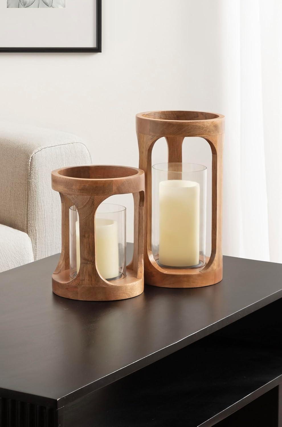 Upscale your hearth room with this modern Dahl two-piece candle holder set from Kate and Laurel. This set features two stunning candle holders designed to enhance any space with their geometric negative space design. With their natural wood finish, these candle holders add a touch of elegance and warmth to your fireplace mantel display, dining room, or coffee table. The sturdy wood bases provide durability, while the curved wood framing creates lovely additions of negative space. These candle holders have a lantern design with attractive handles to create a stylish way to showcase your favorite candles. The larger candle holder is 6.5 inches in diameter by 12 inches tall, while the smaller candle holder is 6.5 inches in diameter by 8.5 inches tall. Each candle holder comes with a 4-inch-wide glass cylinder built to hold flameless candles. The spacious glass cylinders allow the warm candlelight to glow beautifully, creating a cozy ambiance in any room. Whether you use them to display flameless candles for relaxation or simply as decorative pieces, these holders bring an effortless touch of tranquility to your living space.