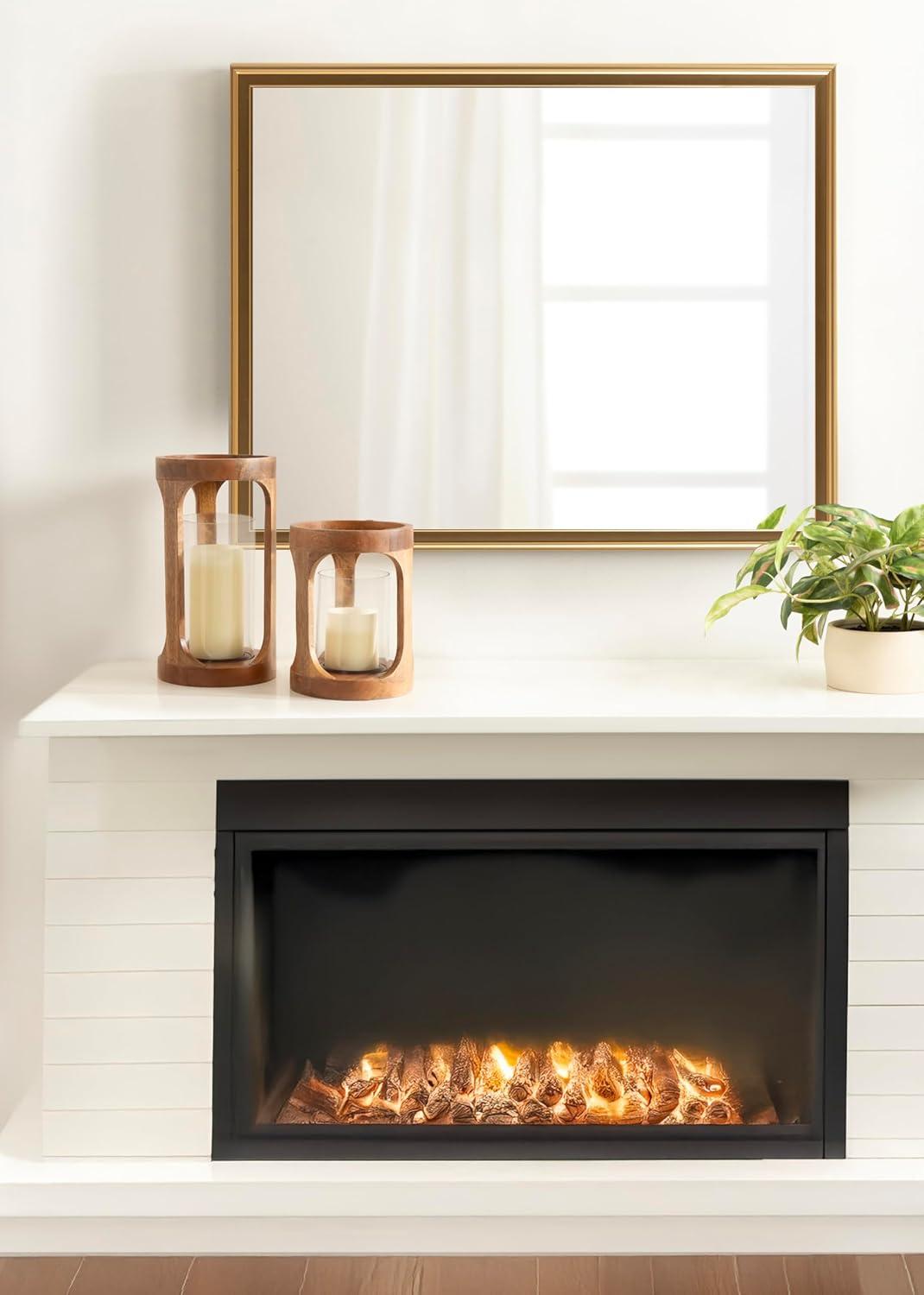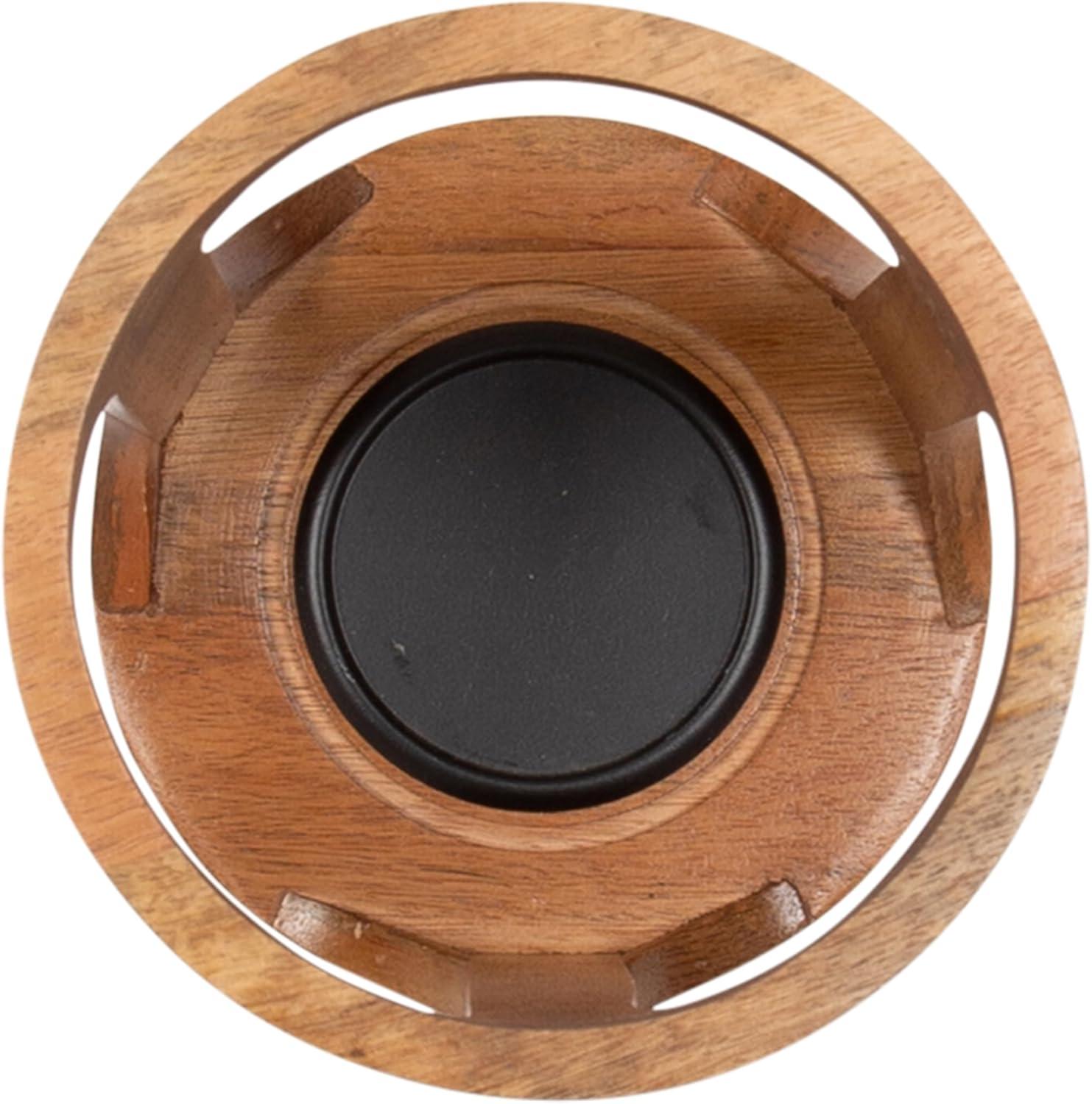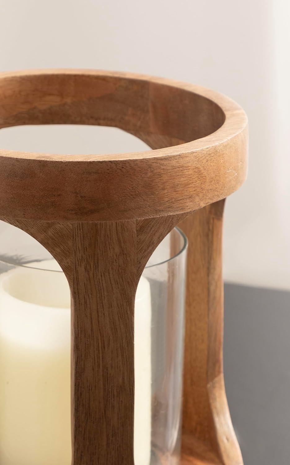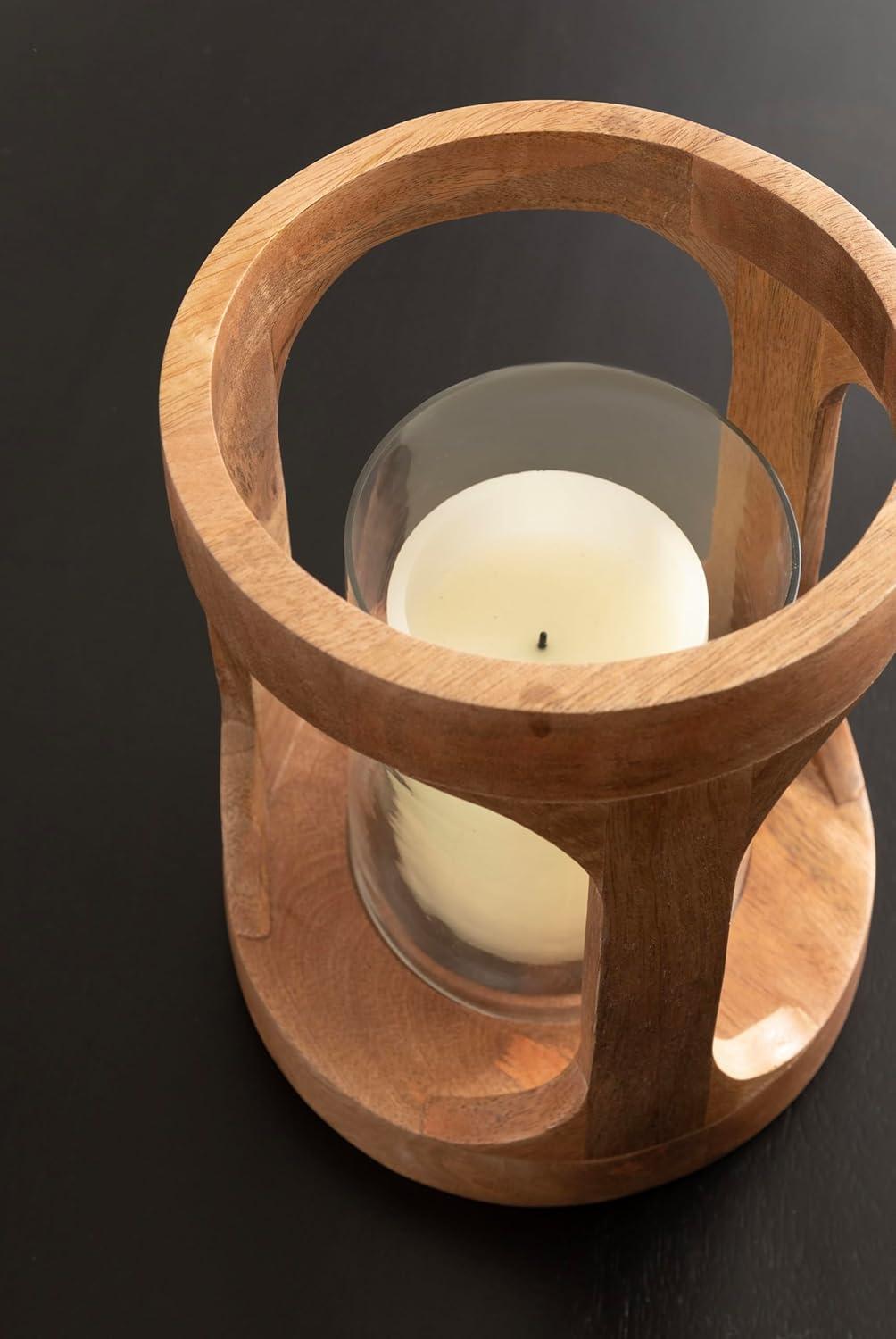 Upscale your hearth room with this modern Dahl two-piece candle holder set from Kate and Laurel. This set features two stunning candle holders designed to enhance any space with their geometric negative space design. With their natural wood finish, these candle holders add a touch of elegance and warmth to your fireplace mantel display, dining room, or coffee table. The sturdy wood bases provide durability, while the curved wood framing creates lovely additions of negative space. These candle holders have a lantern design with attractive handles to create a stylish way to showcase your favorite candles. The larger candle holder is 6.5 inches in diameter by 12 inches tall, while the smaller candle holder is 6.5 inches in diameter by 8.5 inches tall. Each candle holder comes with a 4-inch-wide glass cylinder built to hold flameless candles. The spacious glass cylinders allow the warm candlelight to glow beautifully, creating a cozy ambiance in any room. Whether you use them to display flameless candles for relaxation or simply as decorative pieces, these holders bring an effortless touch of tranquility to your living space.