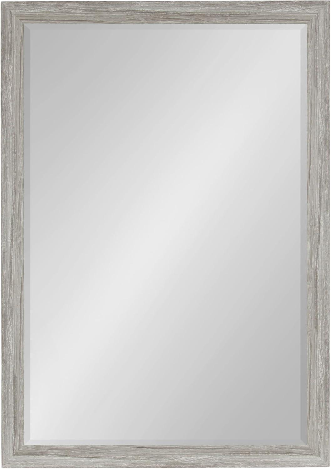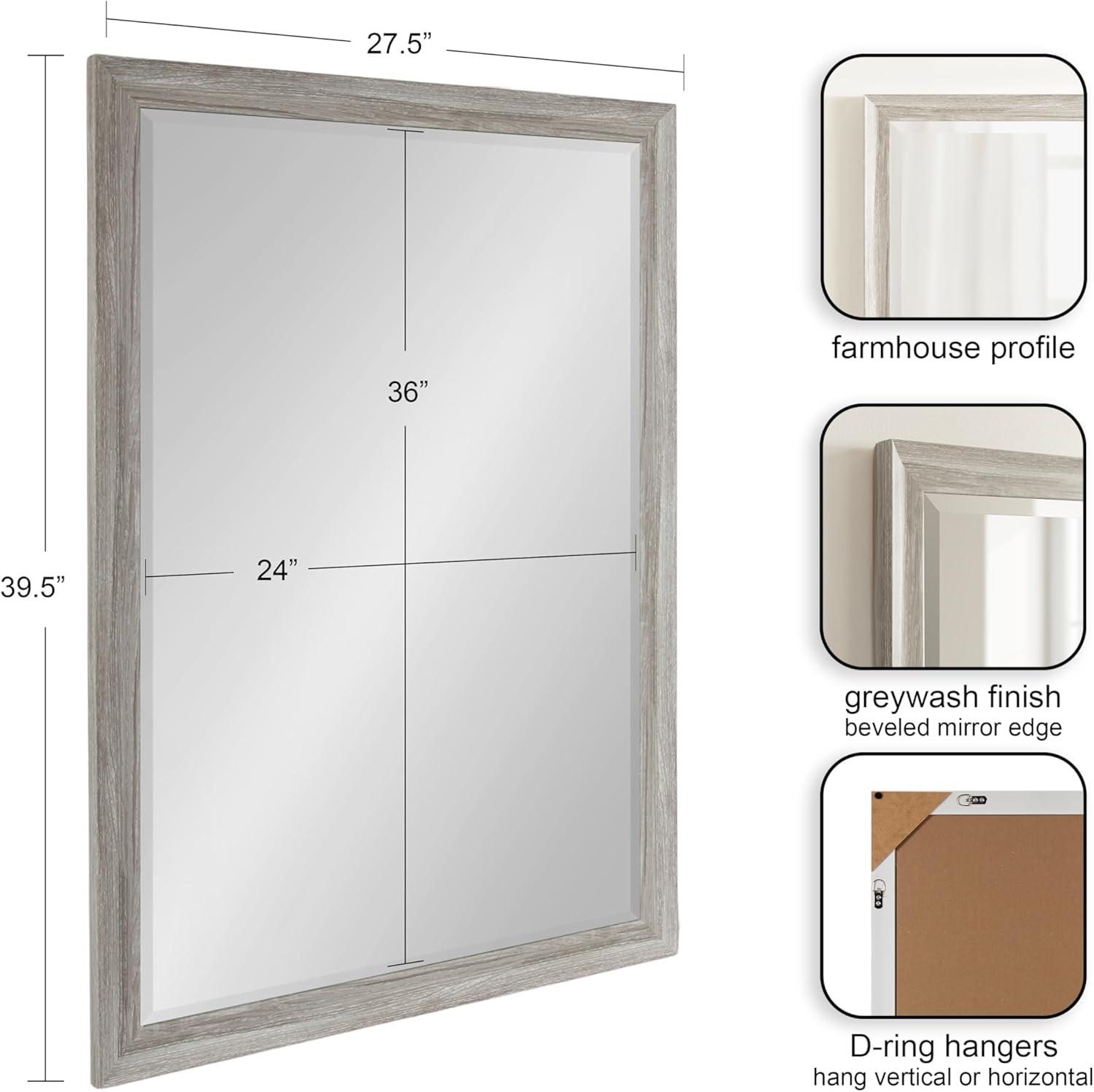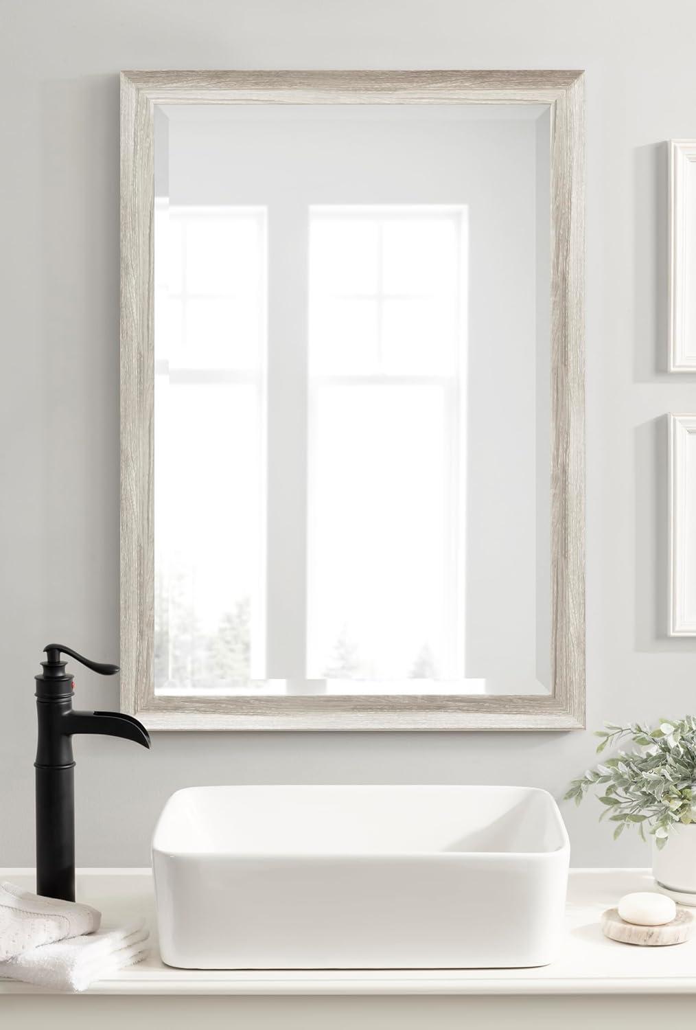 Farmhouse Beveled Bathroom Mirror Design: The Dalphia wall mirror features a beveled glass mirror edge and a distressed wood grain style frame that makes it a rustic farmhouse statement piece