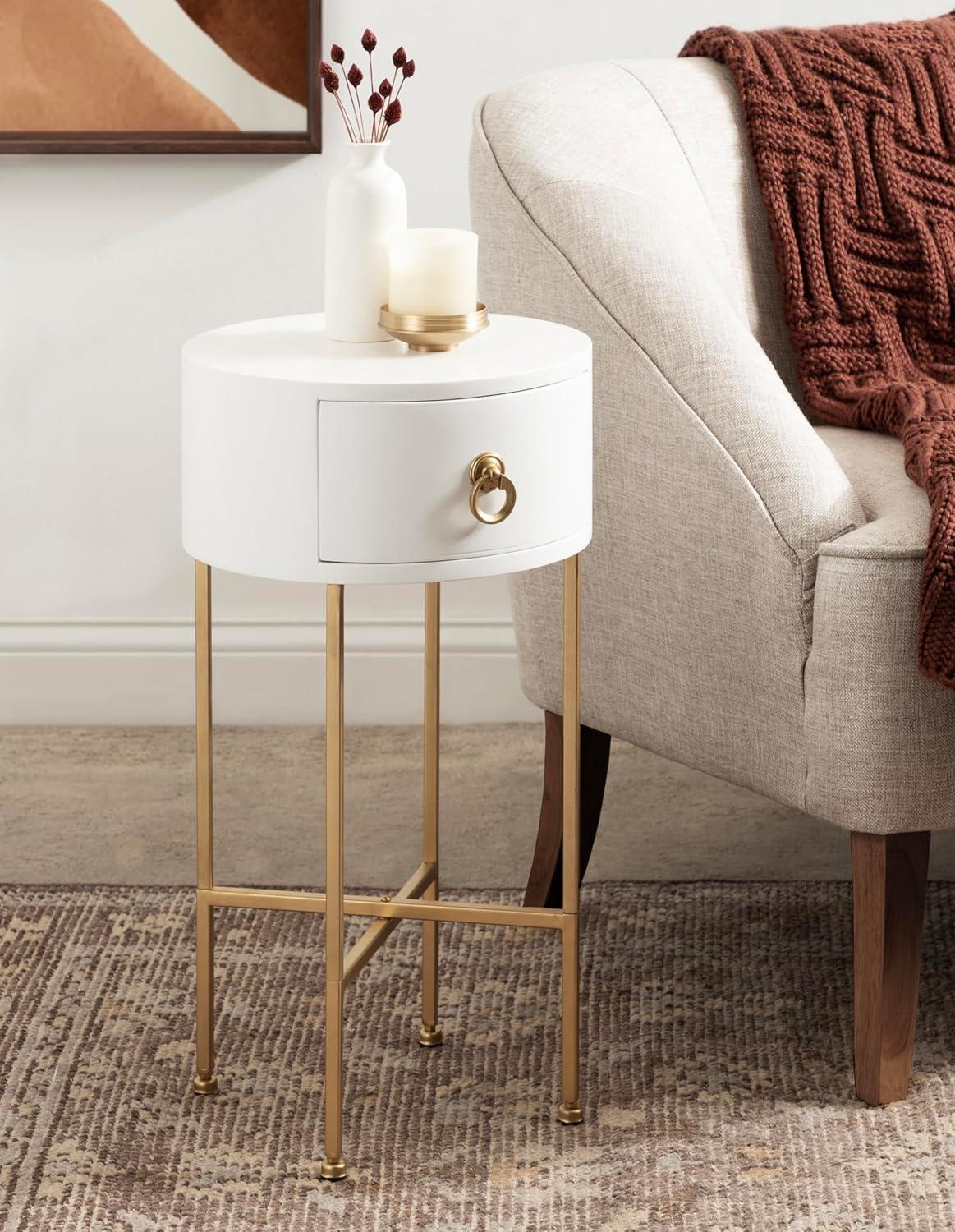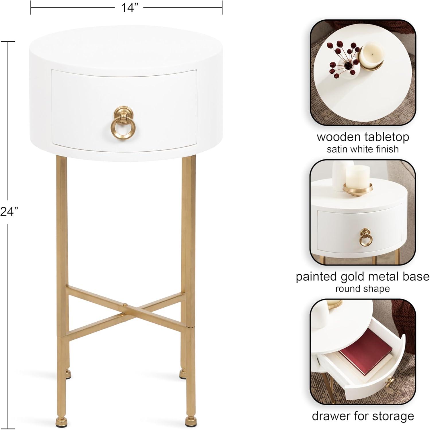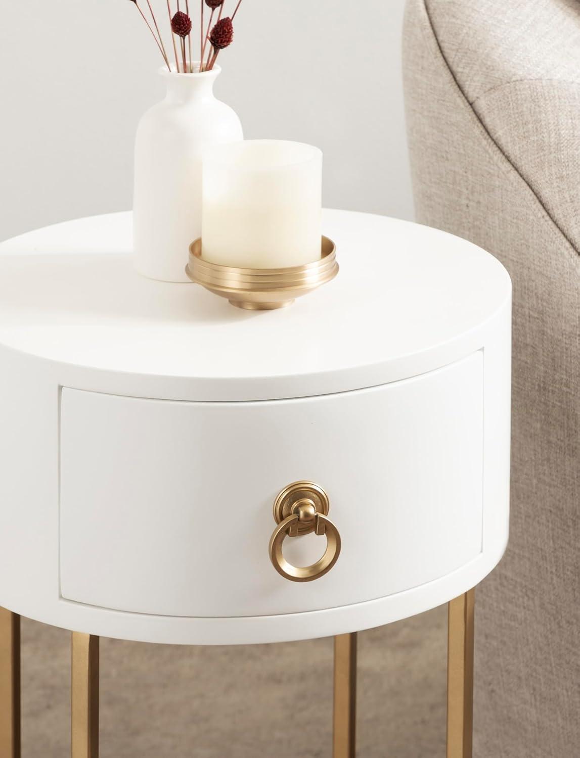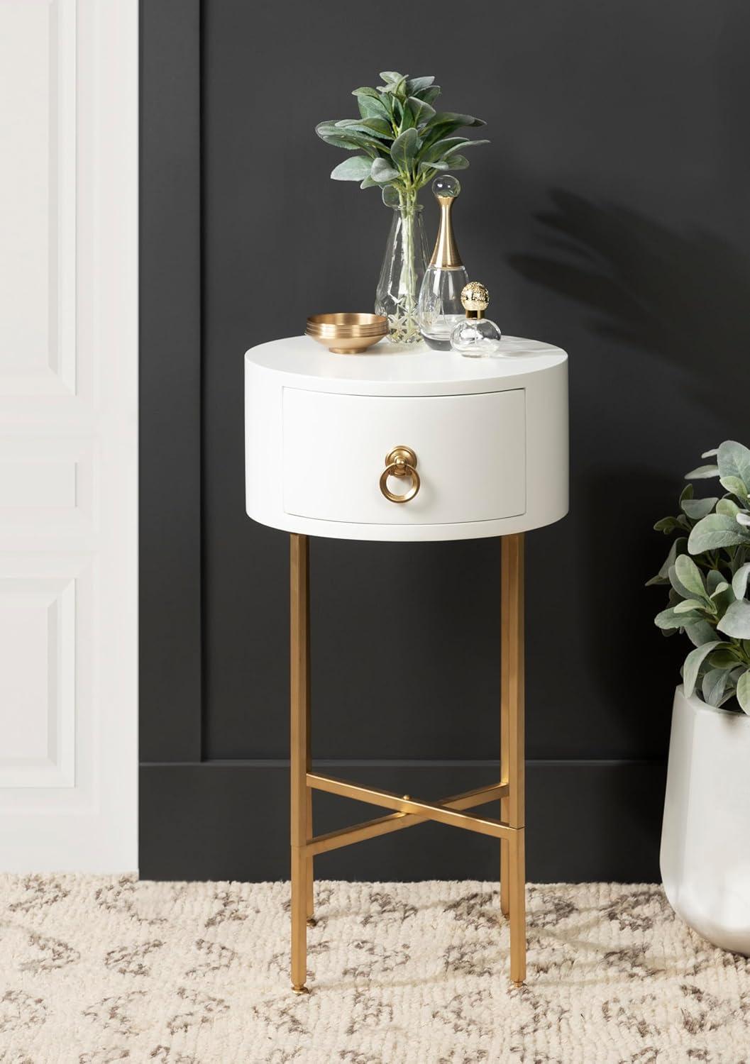 The Decklyn side table provides modern glam design and functional storage for any room. This lovely living room table is handcrafted from a resilient wooden material, giving you a timeless accent that is perfect for storage and display. This edition of the Decklyn table has a satin white finish with a gold base and accenting, designed to provide a transitional look that blends into any room. The minimal design is perfect for saving floor space, while the size makes it fit perfectly as bathroom decor or next to a bed, sofa, or in an entryway. The overall dimensions are 14 inches in diameter by 24 inches tall, giving it an appropriate surface for small storage and display. It's perfect for a lamp, some books, a decorative collection of photos, or an aesthetically pleasing succulent. The Decklyn also features a convenient storage drawer, allowing you to stow away some coasters or other household necessities while keeping them within arm's reach. Assembly is very simple with just a few steps needed before you can showcase this table in your bedroom or bathroom.