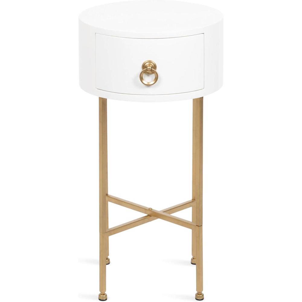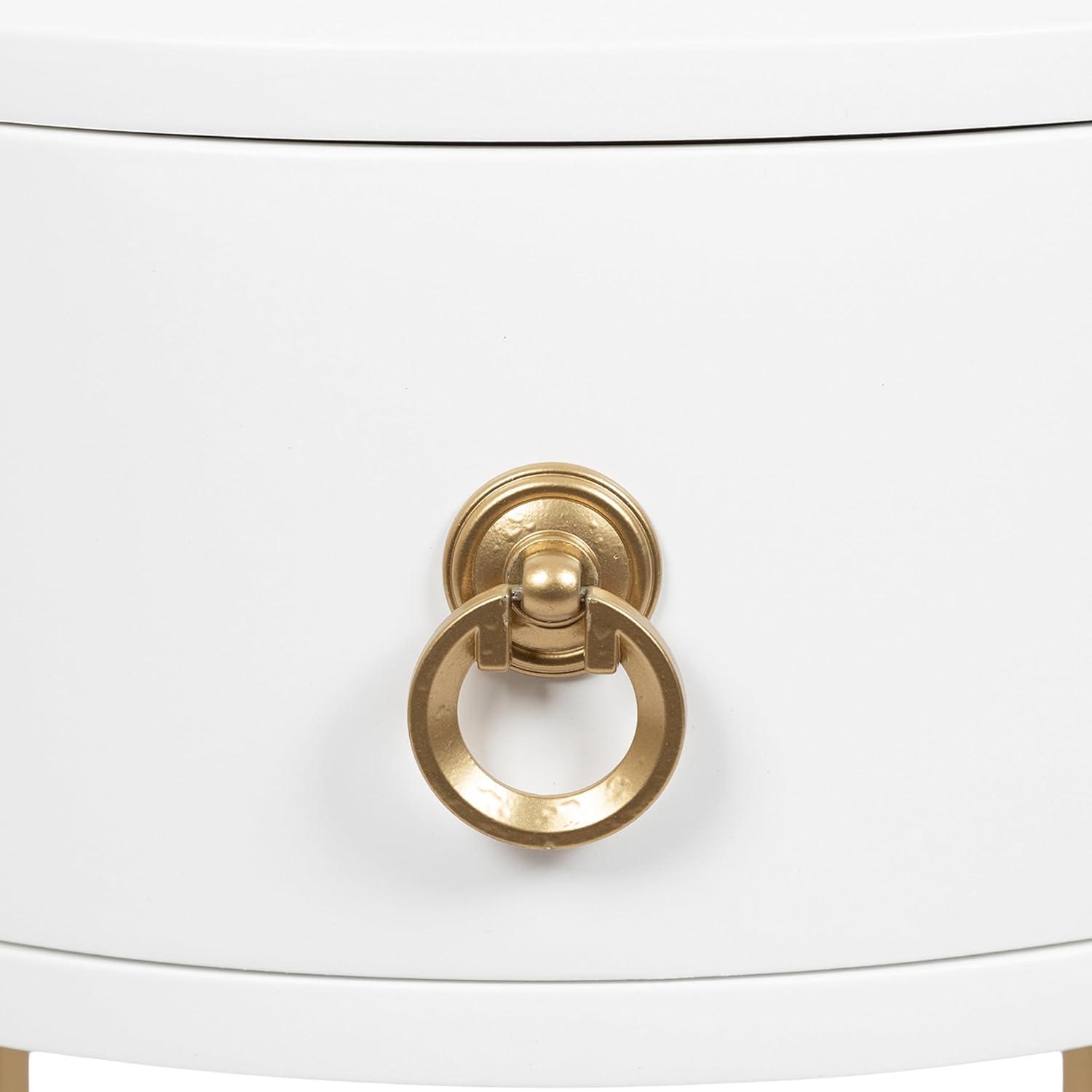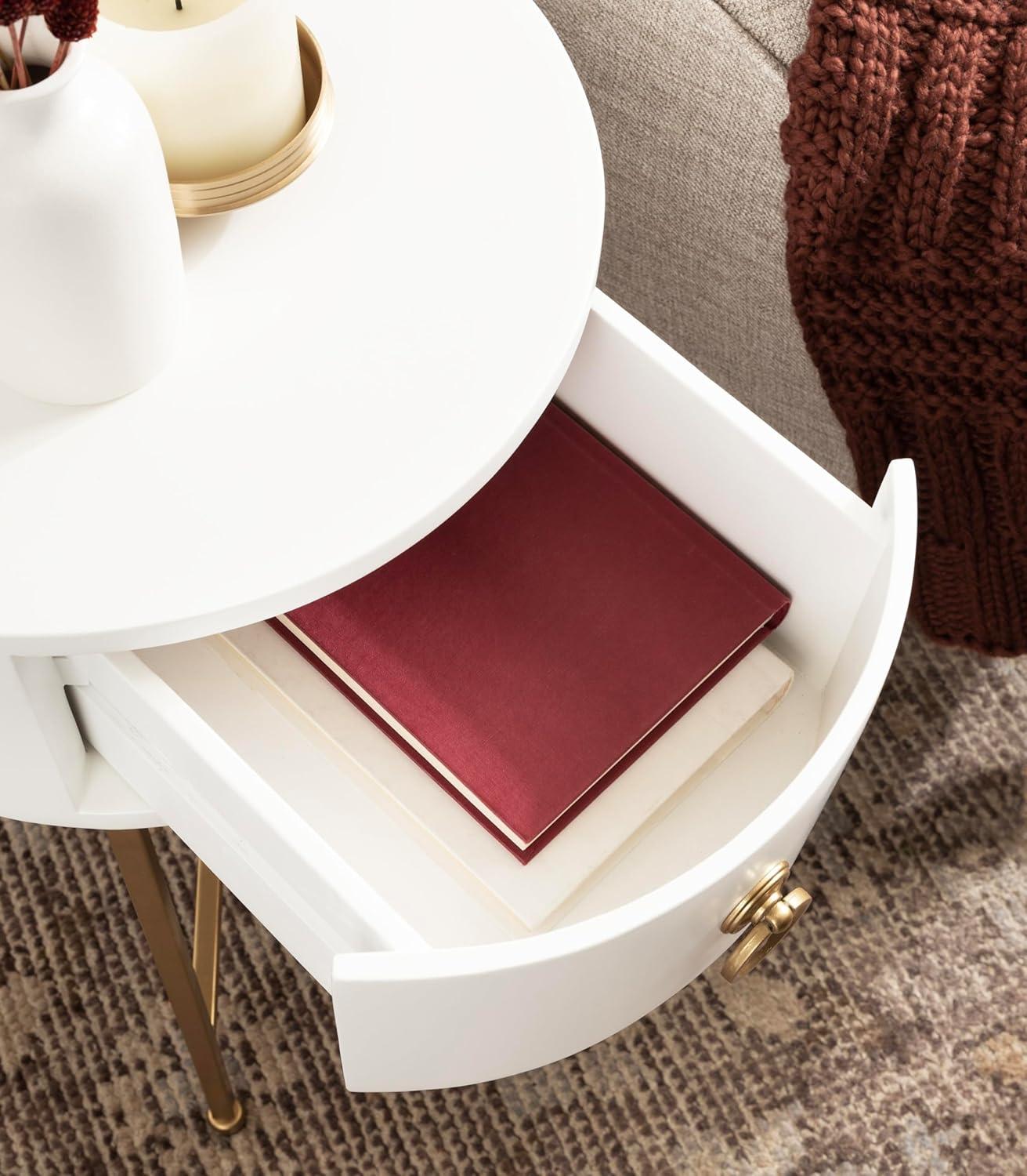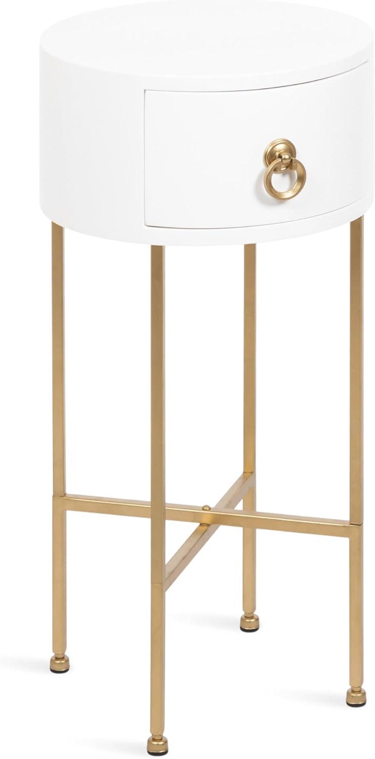 The Decklyn side table provides modern glam design and functional storage for any room. This lovely living room table is handcrafted from a resilient wooden material, giving you a timeless accent that is perfect for storage and display. This edition of the Decklyn table has a satin white finish with a gold base and accenting, designed to provide a transitional look that blends into any room. The minimal design is perfect for saving floor space, while the size makes it fit perfectly as bathroom decor or next to a bed, sofa, or in an entryway. The overall dimensions are 14 inches in diameter by 24 inches tall, giving it an appropriate surface for small storage and display. It's perfect for a lamp, some books, a decorative collection of photos, or an aesthetically pleasing succulent. The Decklyn also features a convenient storage drawer, allowing you to stow away some coasters or other household necessities while keeping them within arm's reach. Assembly is very simple with just a few steps needed before you can showcase this table in your bedroom or bathroom.