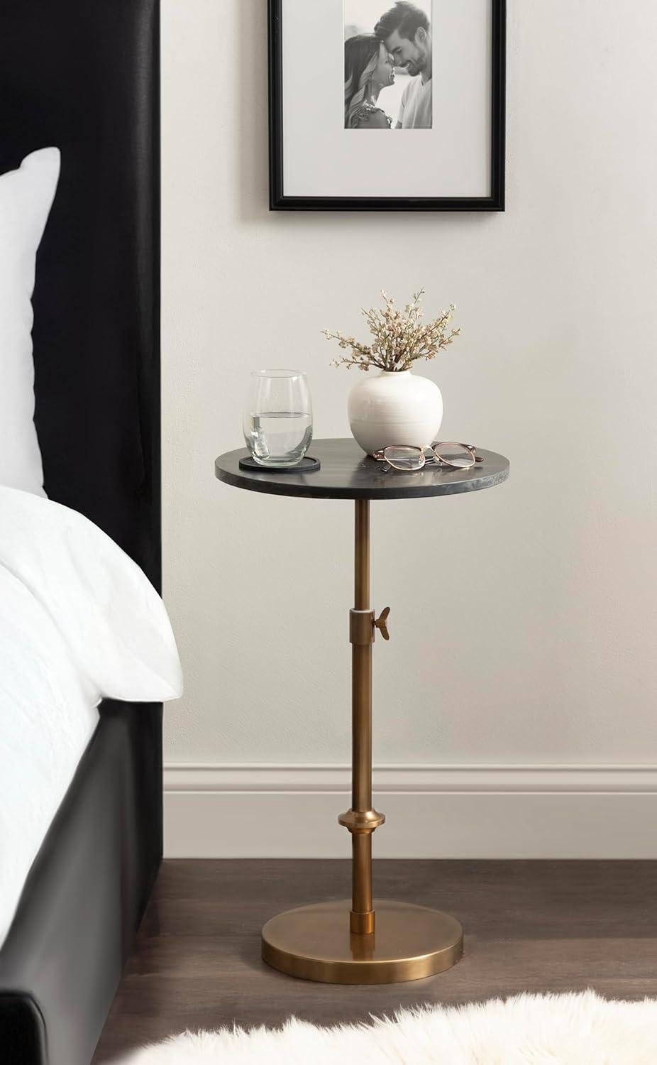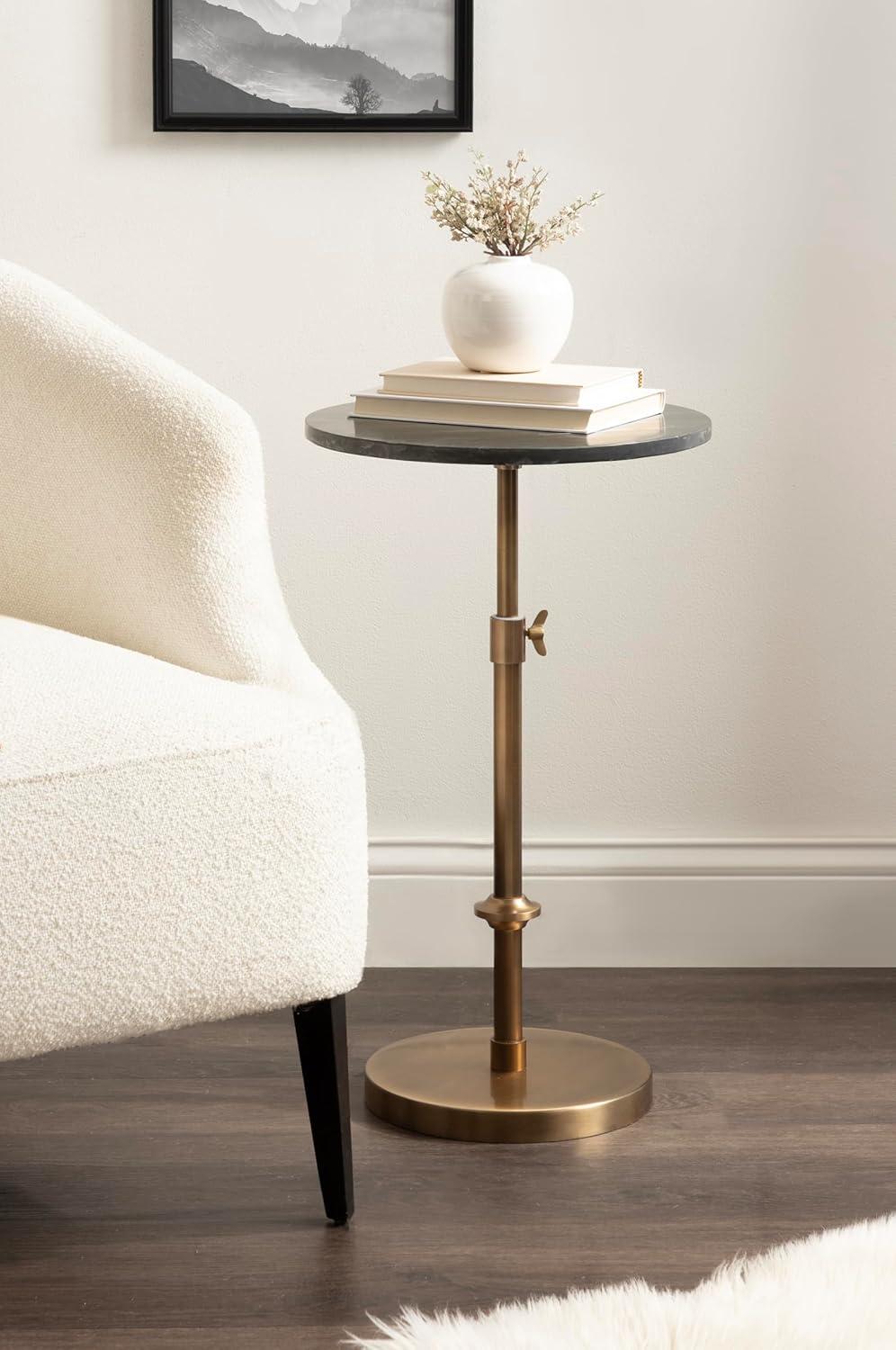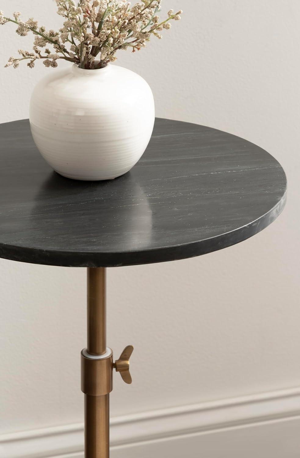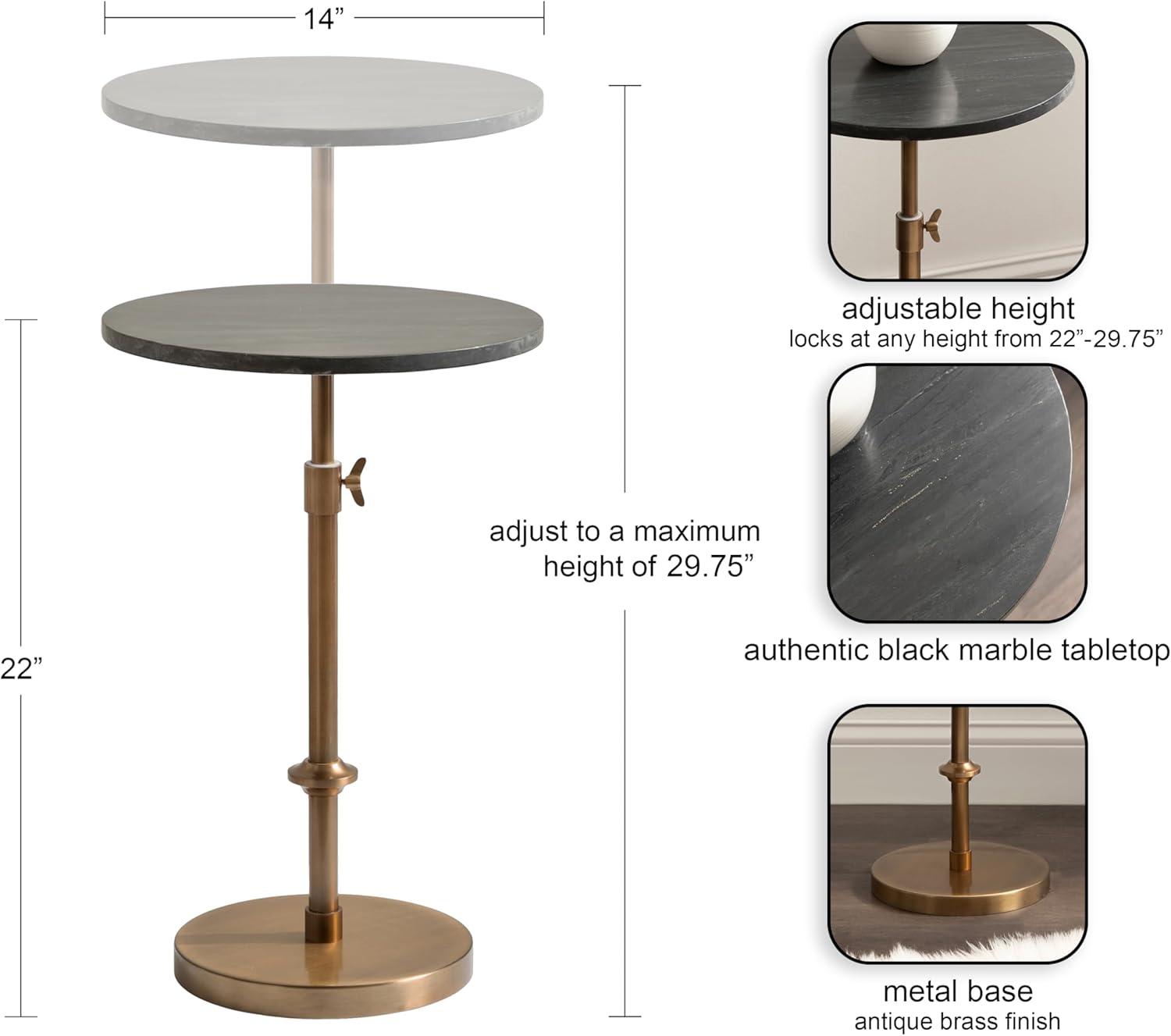 This charming one-of-a-kind accent table makes a bold impression with its handcrafted traditional style. The Engles side table has a sophisticated design, with an authentic black marble tabletop. This round end table features a unique telescope design, which allows you to adjust the height anywhere from 22 inches to 29.75 inches tall. This means that you can make it fit whatever height works best for your space. The table base is constructed from a metal material featuring an antique brass finish to give it an aesthetic reminiscent of traditional style. This elegant end table's overall dimensions are 14 inches wide by 14 inches deep by 29.75 inches tall when fully extended, making it a fantastic addition to a couch, armchair, ottoman, or bed. The Engles pedestal table looks great serving drinks on coasters, acting as a catch-all for small household items, or displaying a sprawling house plant as a plant stand. The versatile size makes it fantastic for small spaces or corners as well. Assemble this beautiful side table in a matter of minutes with an easy-to-follow, 3-step assembly process.