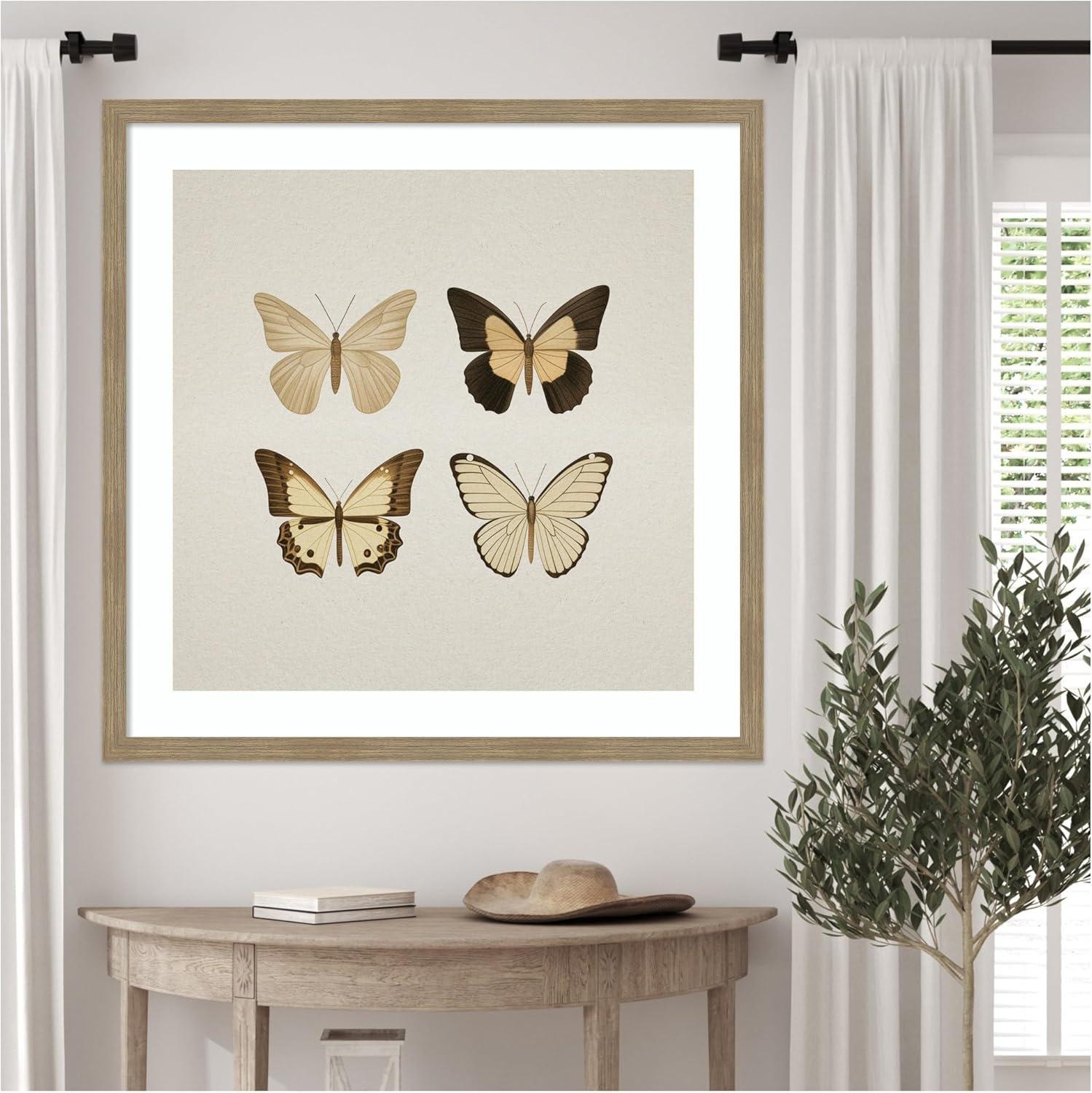 Authentic Artist Collaboration: 'Vintage Style Butterflies in Neutral Tones' is an officially licensed work by independent artist The Creative Bunch Studio, thoughtfully presented in our Woodgrain Stripe Mocha molding. The finished piece measures 34 x 34, offering a sophisticated statement for your space. Visual Story: This artwork features four intricately illustrated butterflies, each showcasing a distinct pattern and palette of natural colors. The butterflies are symmetrically arranged on a textured background, giving the piece a vintage and elegant feel. The subtle details in the wings highlight the beauty and diversity of these delicate creatures.