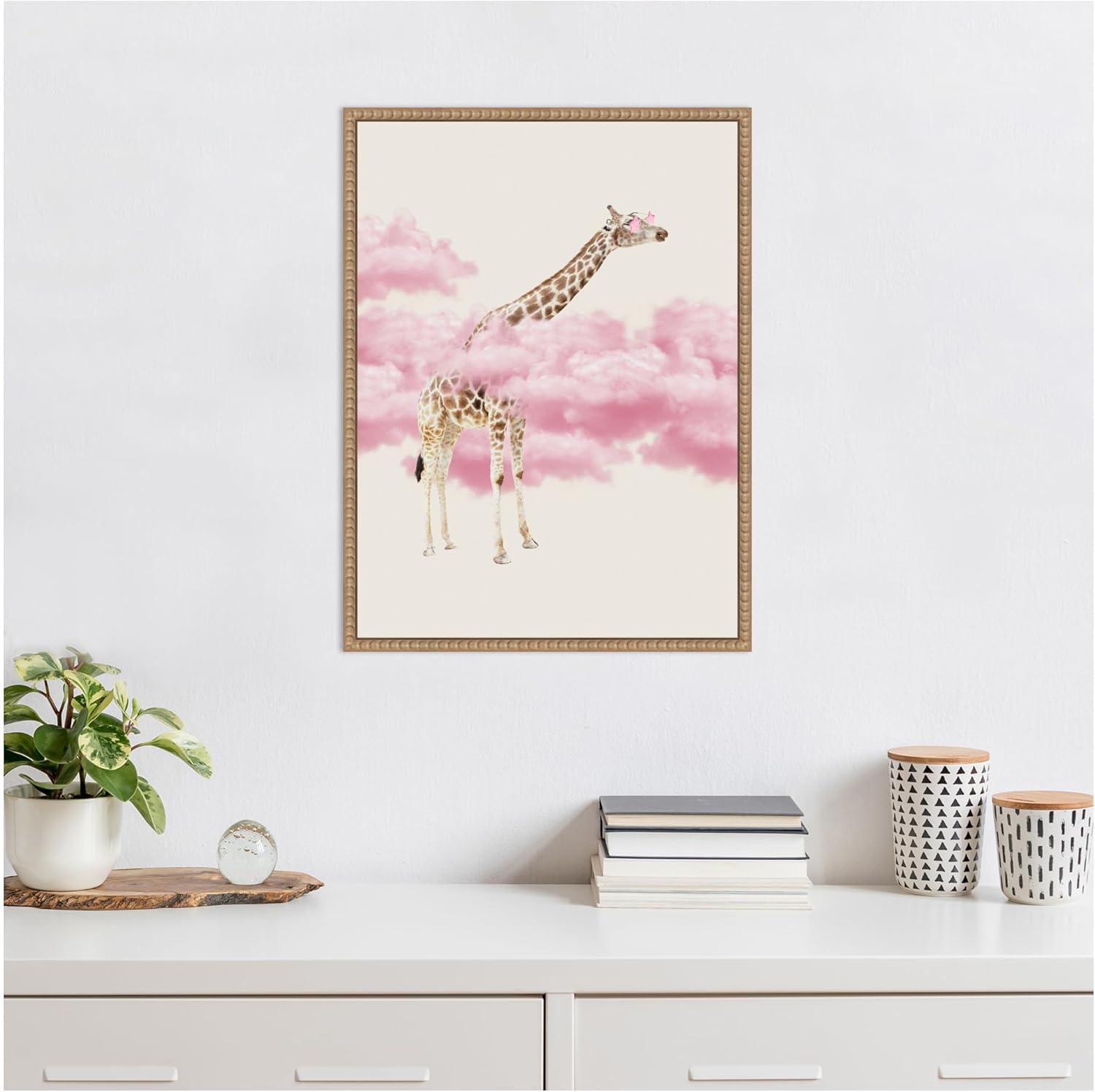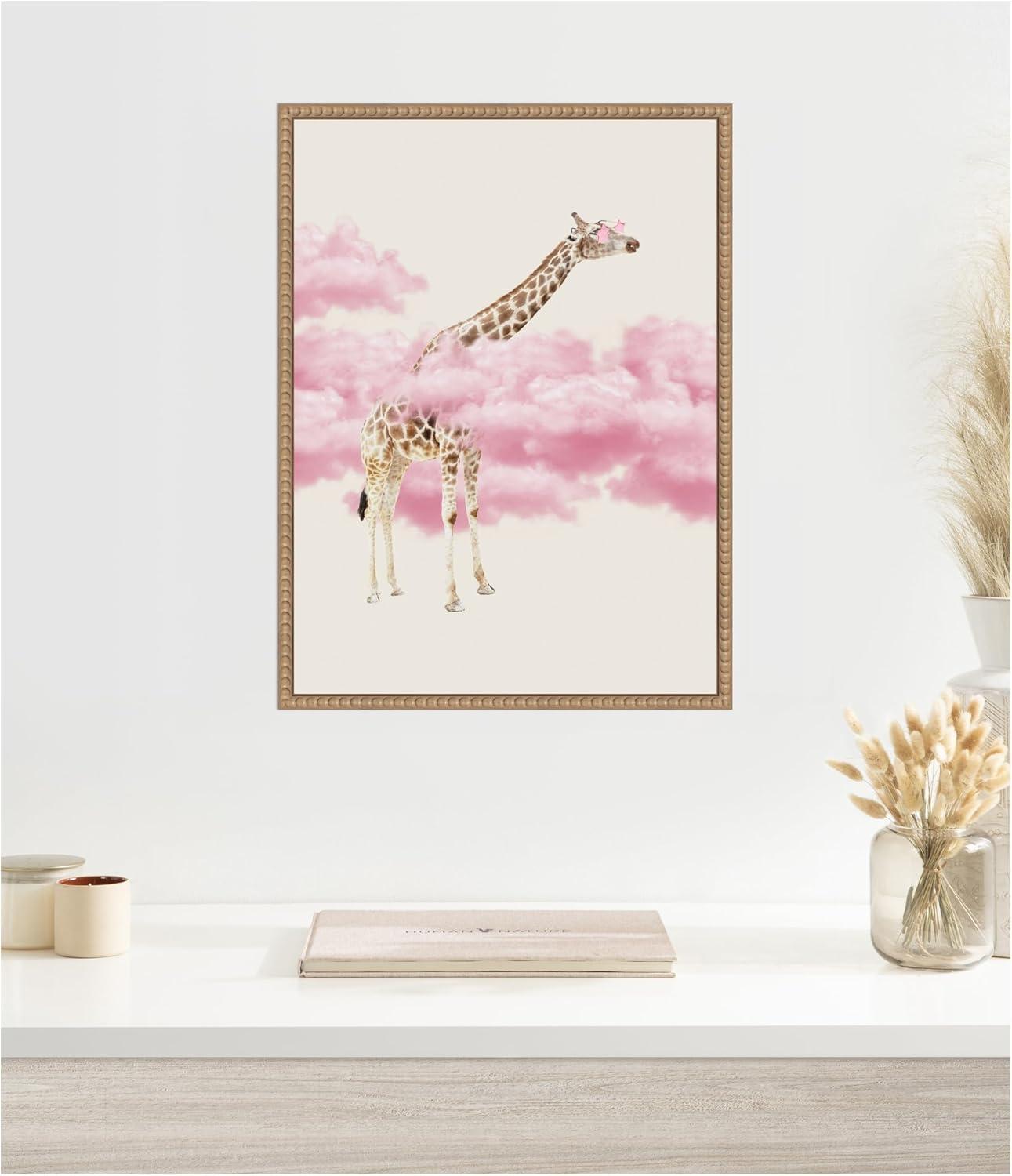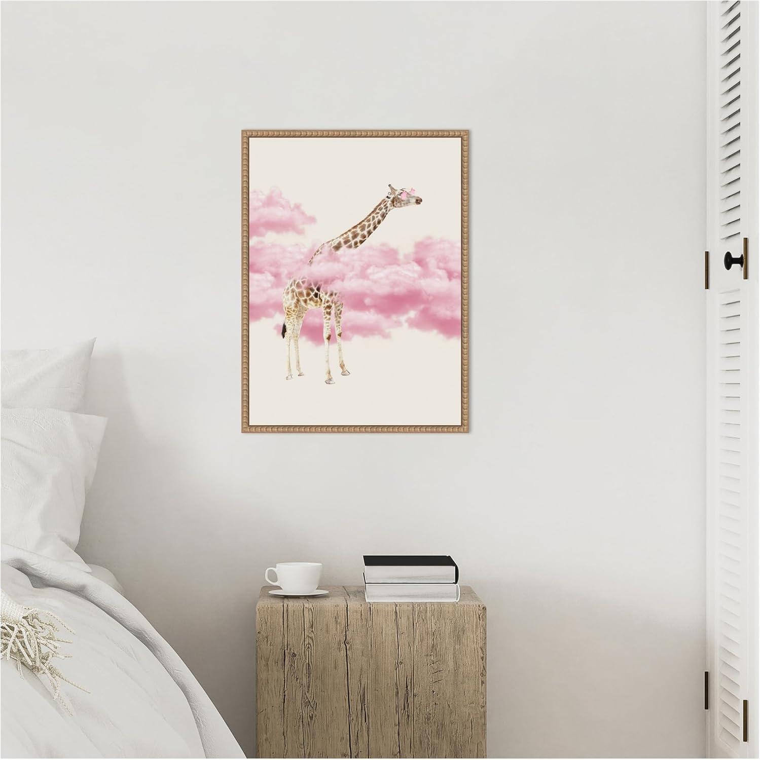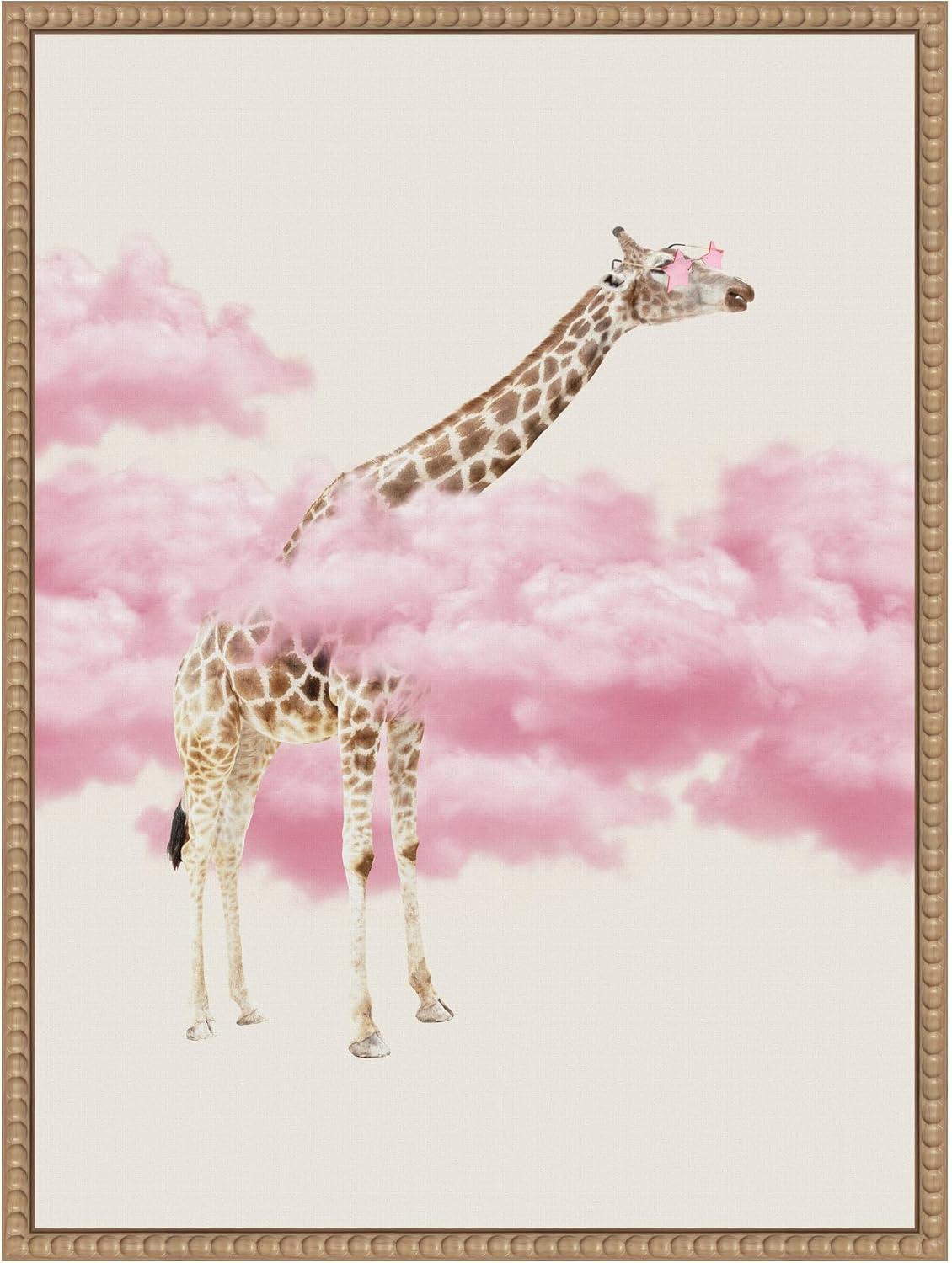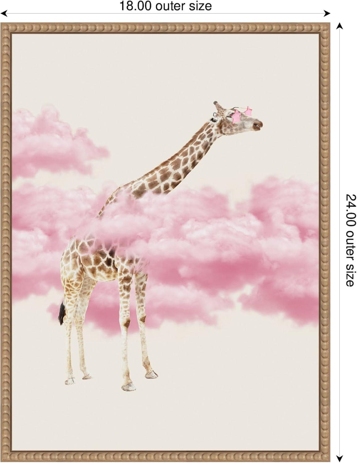 The artwork features a giraffe standing amidst fluffy, pink clouds, wearing stylish star-shaped sunglasses. The whimsical nature of the image creates a playful and surreal atmosphere, blending reality with dreamlike elements. This imaginative piece invites viewers into a fantastical world. This Kate and Laurel canvas art print was created by July Art Prints and printed by Kate and Laurel in Waunakee WI. This modern floating canvas art is sure to bring joy to your space. Our design team curates art that will fit perfectly in any room of your home. Showcase this art in your living room, bedroom, home office, kitchen, bathroom, nursery, or anywhere you want to bring a little beauty and charm to your walls. Specializing in home decor, we are continually bringing timeless works of art for the traditional decorator as well as trend-forward pieces for that eclectic art lover. Our high-quality framed canvas art also makes excellent gifts for birthdays, holidays, or housewarming parties. Printed on gallery-wrapped canvas and framed with a simple gallery frame this wall art is easy to display on the wall and will match with any decor style. The outside display dimensions are 18 in x 24 in by 1.6 in Print Name: “Giraffe In Pink Clouds”
