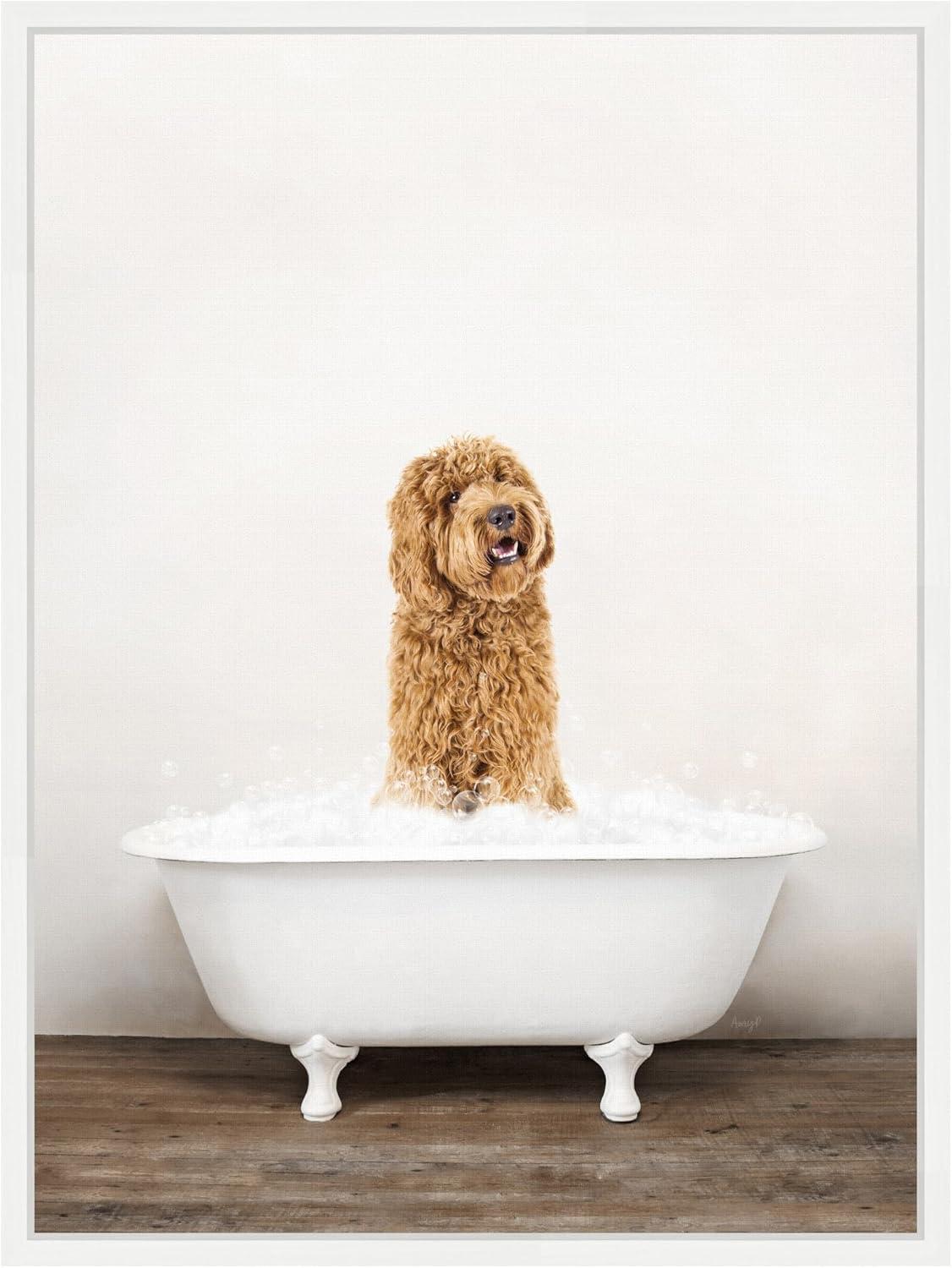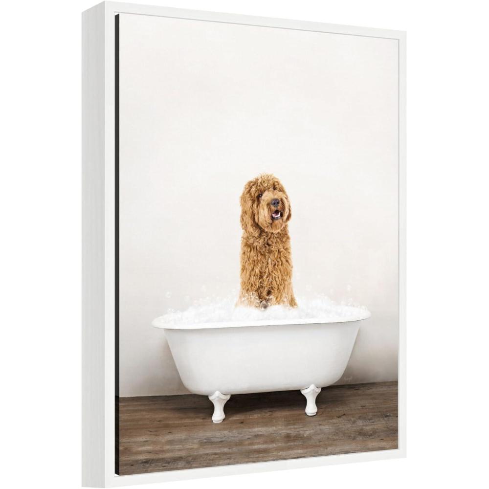This artwork features a fluffy brown dog playfully standing in a white clawfoot bathtub full of bubbles. The background is a simple, neutral wall, emphasizing the joyful expression of the dog. The scene captures a lighthearted moment that exudes charm and warmth. This Kate and Laurel canvas art print was created by Amy Peterson and printed by Kate and Laurel in Waunakee WI. This modern floating canvas art is sure to bring joy to your space. Our design team curates art that will fit perfectly in any room of your home. Showcase this art in your living room, bedroom, home office, kitchen, bathroom, nursery, or anywhere you want to bring a little beauty and charm to your walls. Specializing in home decor, we are continually bringing timeless works of art for the traditional decorator as well as trend-forward pieces for that eclectic art lover. Our high-quality framed canvas art also makes excellent gifts for birthdays, holidays, or housewarming parties. Printed on gallery-wrapped canvas and framed with a simple gallery frame this wall art is easy to display on the wall and will match with any decor style. The outside display dimensions are 18 in x 24 in by 1.6 in Print Name: “Golden Labradoodle in Rustic Bath Style”