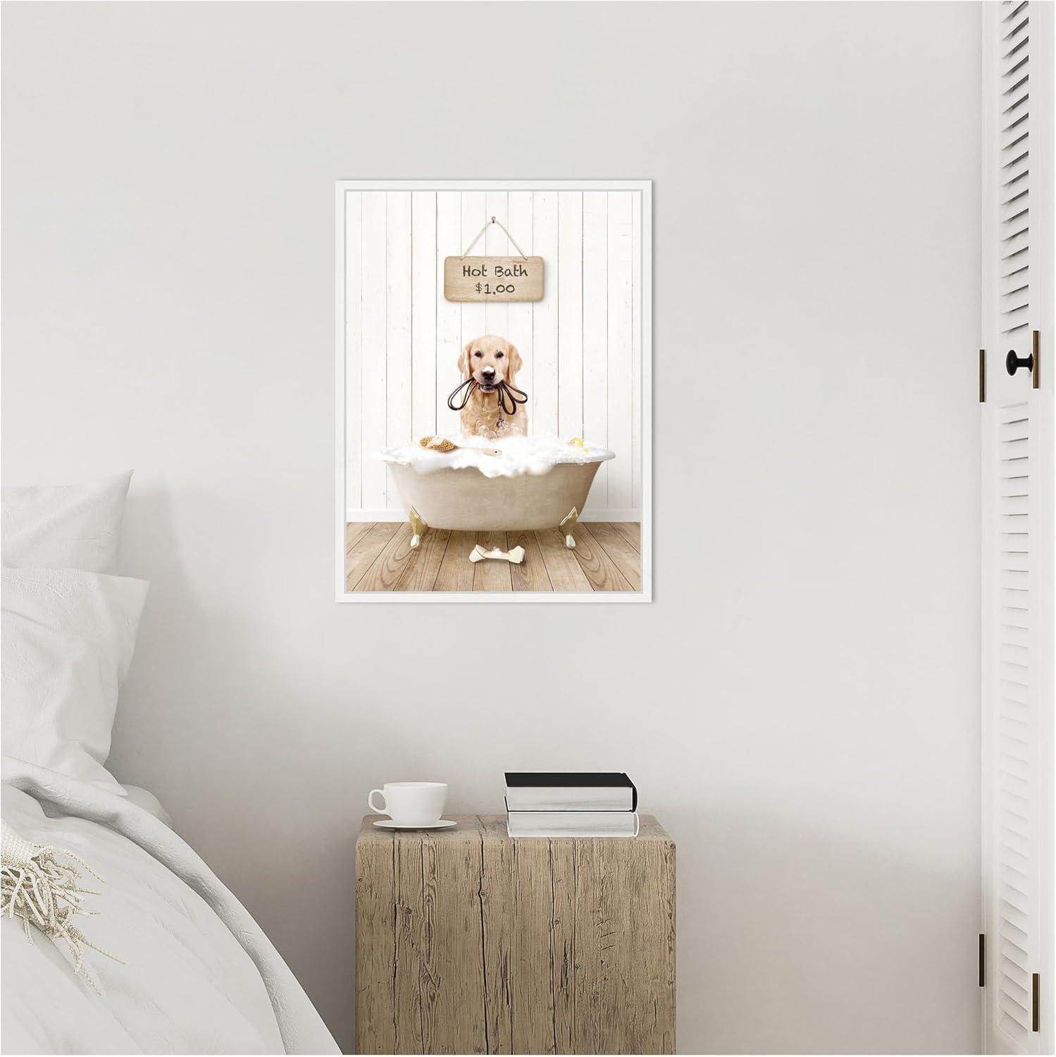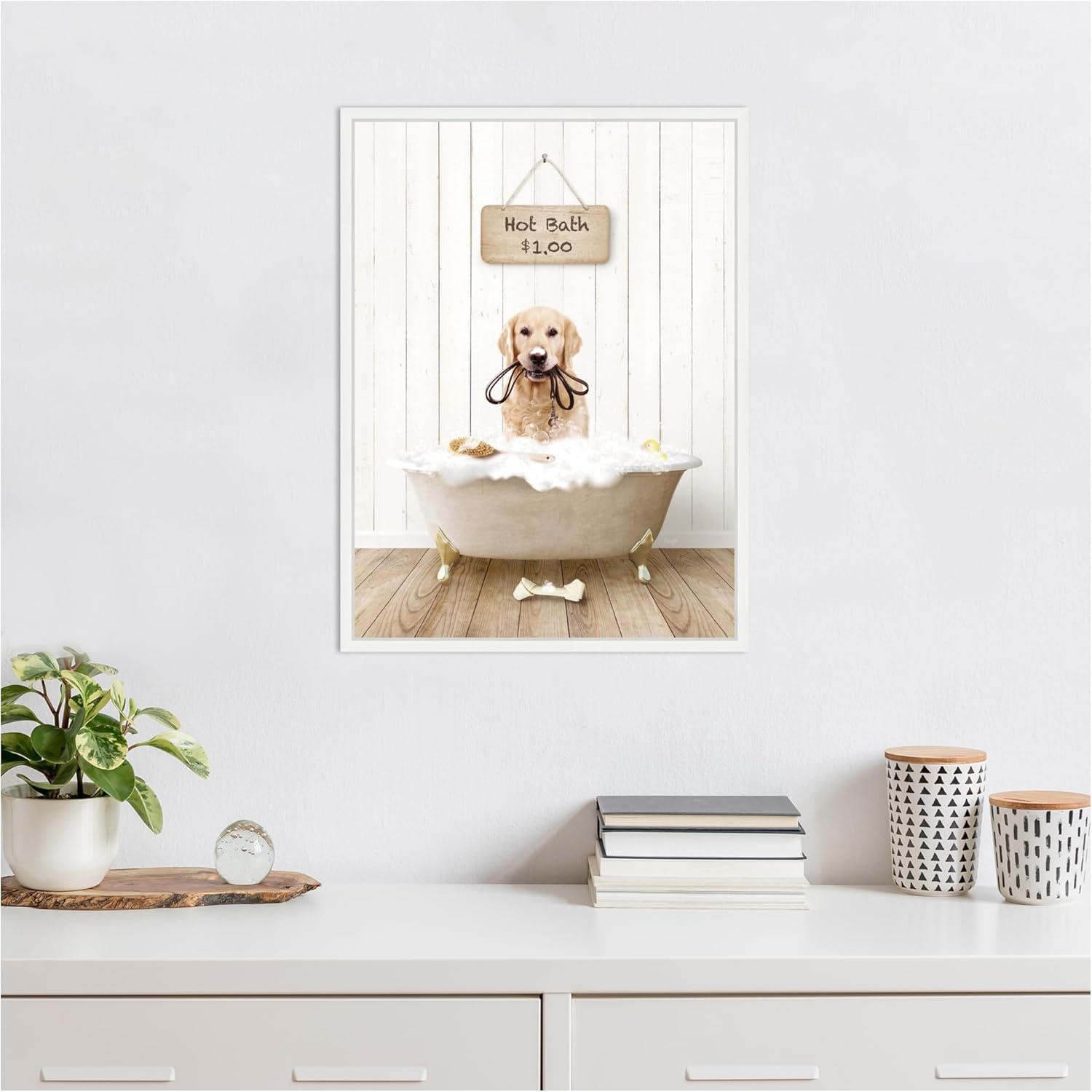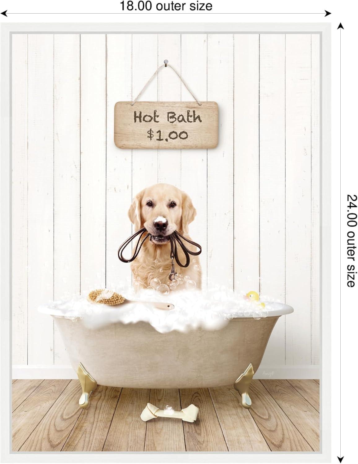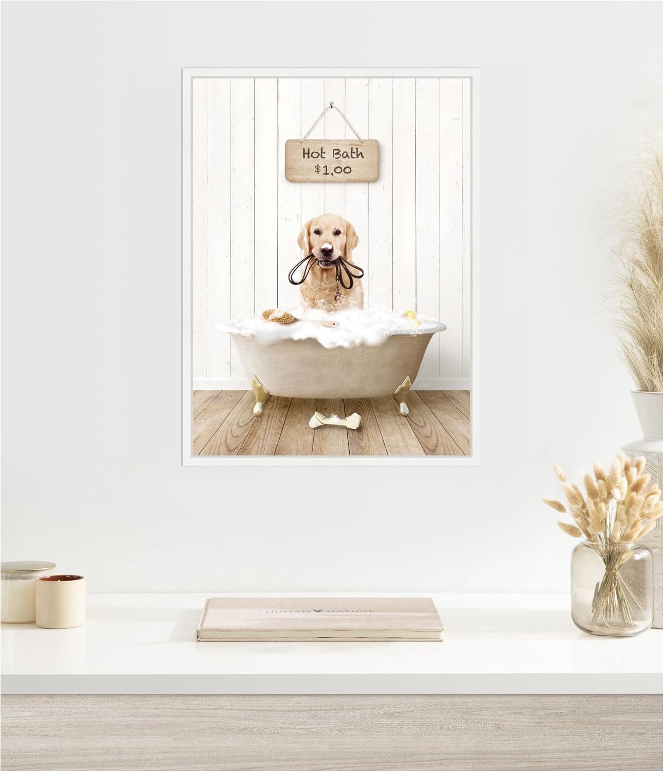 A golden retriever is sitting in a bubble-filled bathtub, holding a leash in its mouth. The sign above reads “Hot Bath $1.00” and the bathroom has a rustic, wooden theme. There is a brush on the edge of the tub and a rubber ducky floating in the bubbles. This Kate and Laurel canvas art print was created by Amy Peterson and printed by Kate and Laurel in Waunakee WI. This modern floating canvas art is sure to bring joy to your space. Our design team curates art that will fit perfectly in any room of your home. Showcase this art in your living room, bedroom, home office, kitchen, bathroom, nursery, or anywhere you want to bring a little beauty and charm to your walls. Specializing in home decor, we are continually bringing timeless works of art for the traditional decorator as well as trend-forward pieces for that eclectic art lover. Our high-quality framed canvas art also makes excellent gifts for birthdays, holidays, or housewarming parties. Printed on gallery-wrapped canvas and framed with a simple gallery frame this wall art is easy to display on the wall and will match with any decor style. The outside display dimensions are 18 in x 24 in by 1.6 in Print Name: “Golden Retriever in Hot Bath”