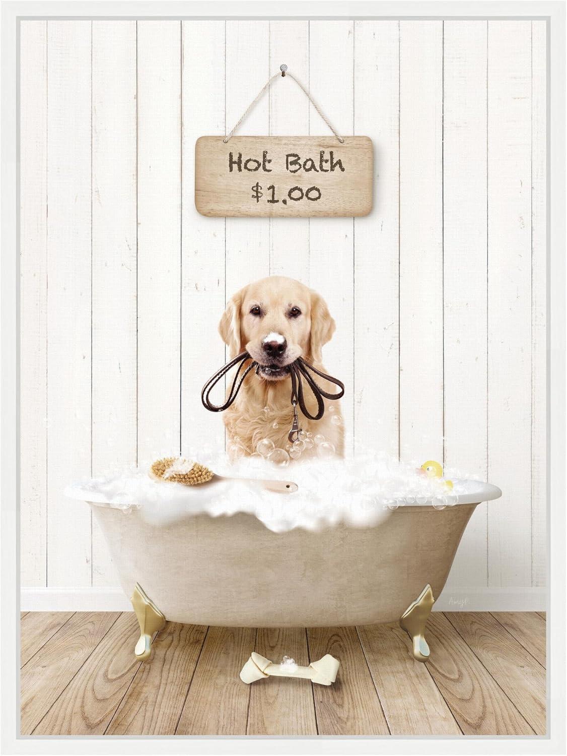 Art Description: A golden retriever is sitting in a bubble-filled bathtub, holding a leash in its mouth. The sign above reads “Hot Bath $1.00” and the bathroom has a rustic, wooden theme. There is a brush on the edge of the tub and a rubber ducky floating in the bubbles.