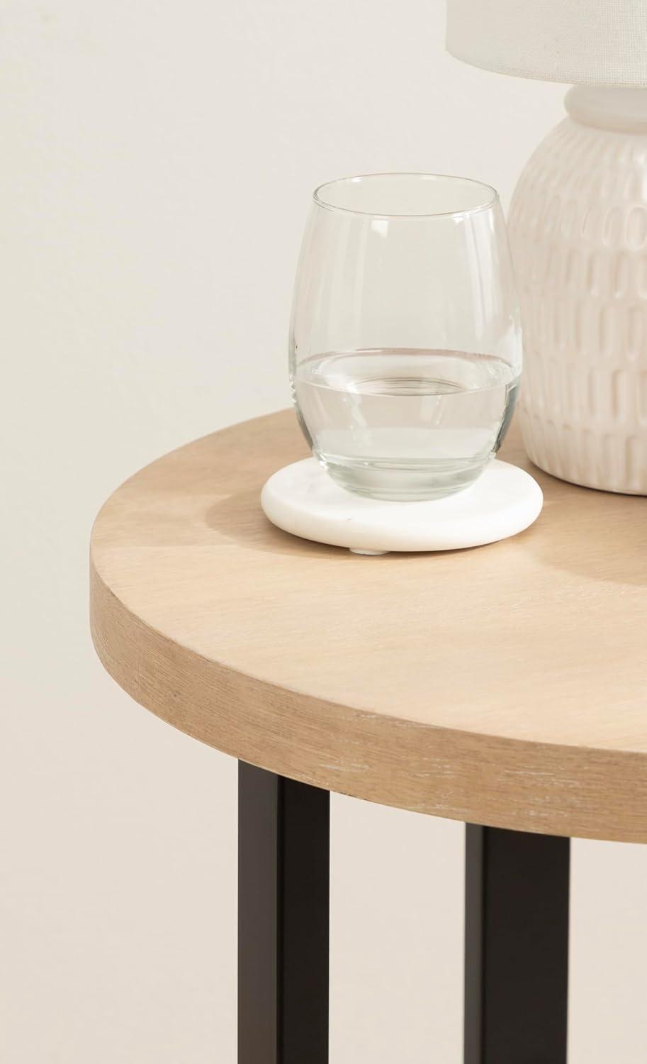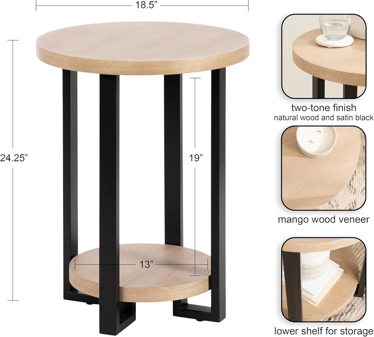 Showcase your transitional-inspired style with the Hendricks round side table from Kate and Laurel. The soft and elegant finish of the wood adds a touch of sophistication to any space, while the simple and clean lines of the design make it easy to blend seamlessly with any decor style. The light natural tabletop finish also lends itself to organic modern design, giving it that look of transitional, timeless decor. This beautiful end table is crafted from a sturdy wooden material with a mango wood veneer, creating a statement that is as durable as it is beautiful. Its overall dimensions are 18.5 inches in diameter with a height of 24.25 inches, allowing the Hendricks to function well as a living room focal point. The top wooden tier is perfect for creating a lovely display area for candles, small lamps, and other accents. The bottom tier of the side table is great for storing your favorite household accessories, from blankets and pillows to everyday essentials. Assemble this table in only a matter of minutes with a simple, three-step assembly process.