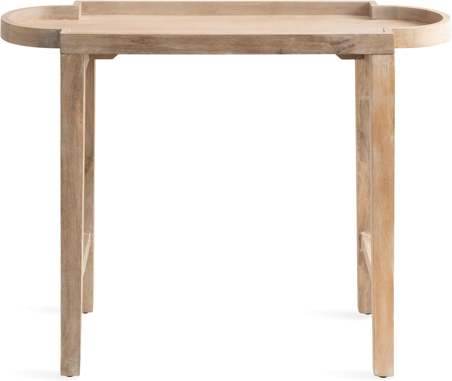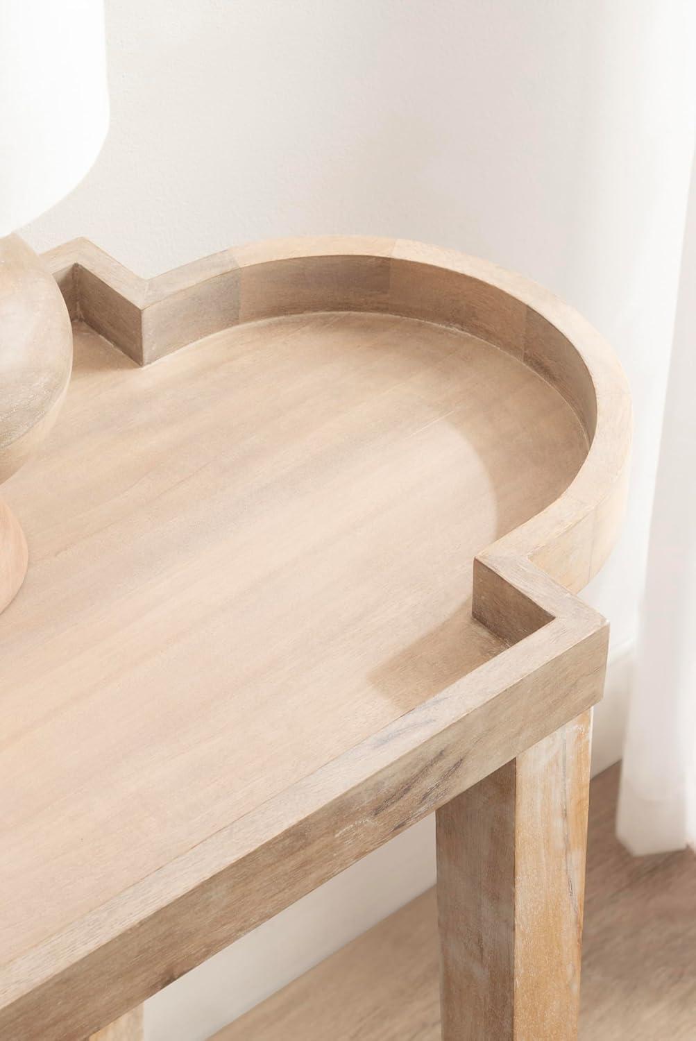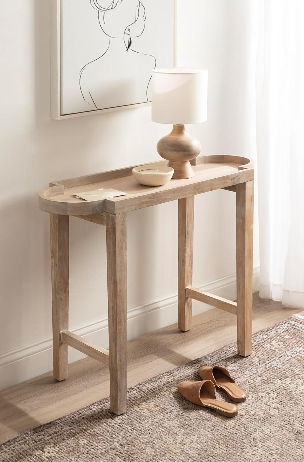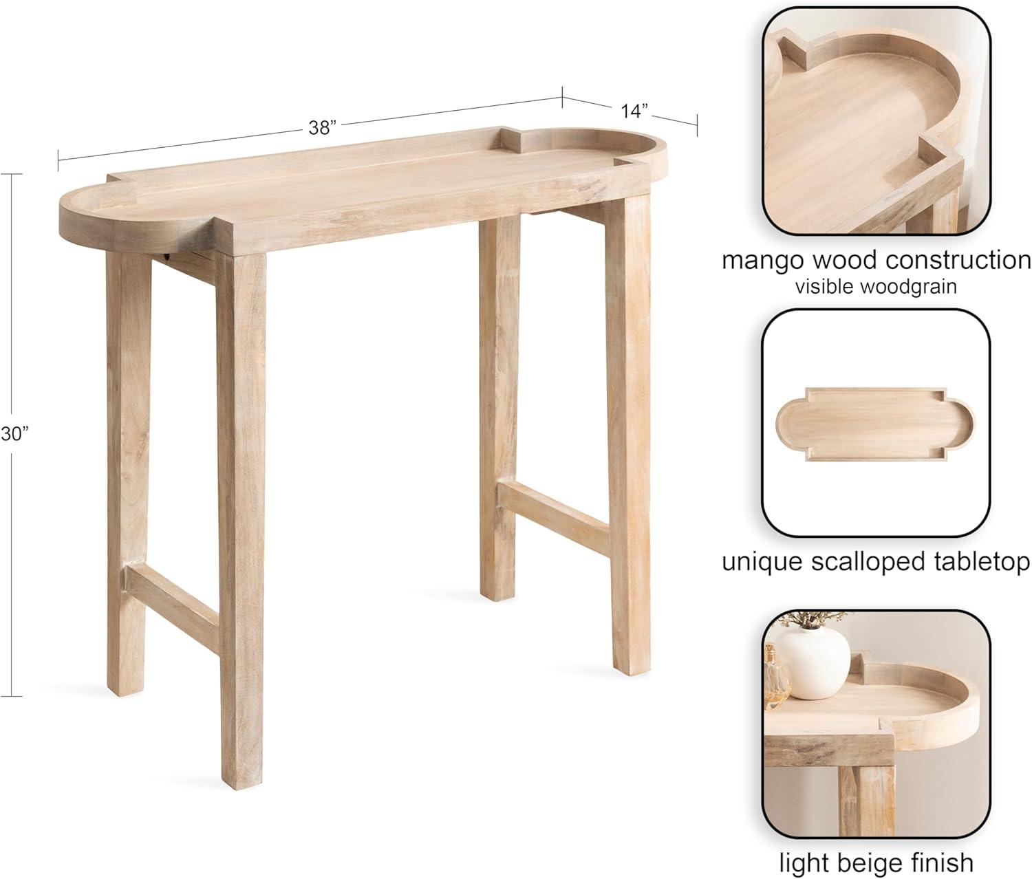 Showcase your transitional-inspired style with the trendy Jovie console table from Kate and Laurel. The natural wood finish of the table adds a touch of sophistication to any space, while the scalloped tabletop makes a youthful statement in your entryway. The versatile light natural wood finish also lends itself to various design styles for that look of transitional, timeless decor. This beautiful entryway table is crafted of solid mango wood with a wood veneer for the inset tabletop, creating a statement that is as durable as it is charming. Due to its versatile design, you can easily showcase it behind your living room couch or on an available bedroom wall. Its overall dimensions are 38 inches wide by 14 inches deep by 30 inches tall, allowing the Jovie to function well as an entryway focal point. The tabletop is perfect for creating a spacious display area for candles, small lamps, and other decor accents. Or, use it as a “getting-ready” station before you head out the front door. Assemble this table in only a matter of minutes with a straightforward, two-step assembly process.