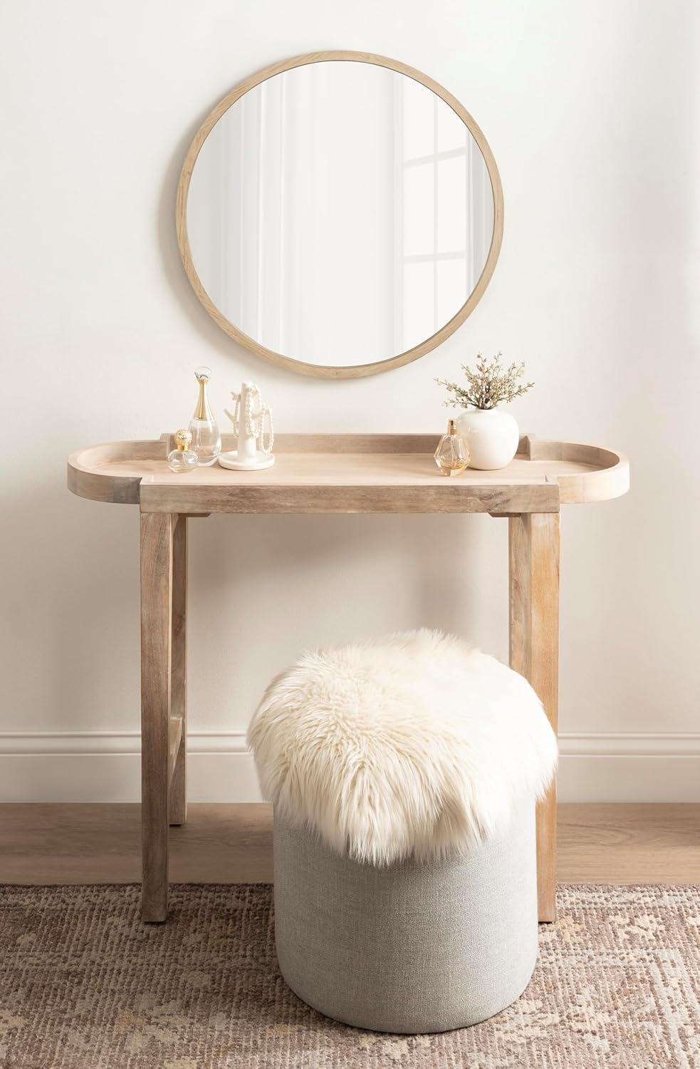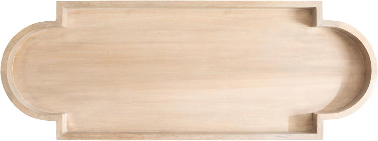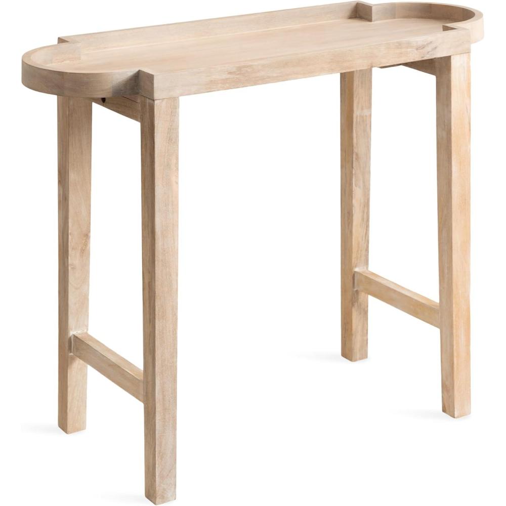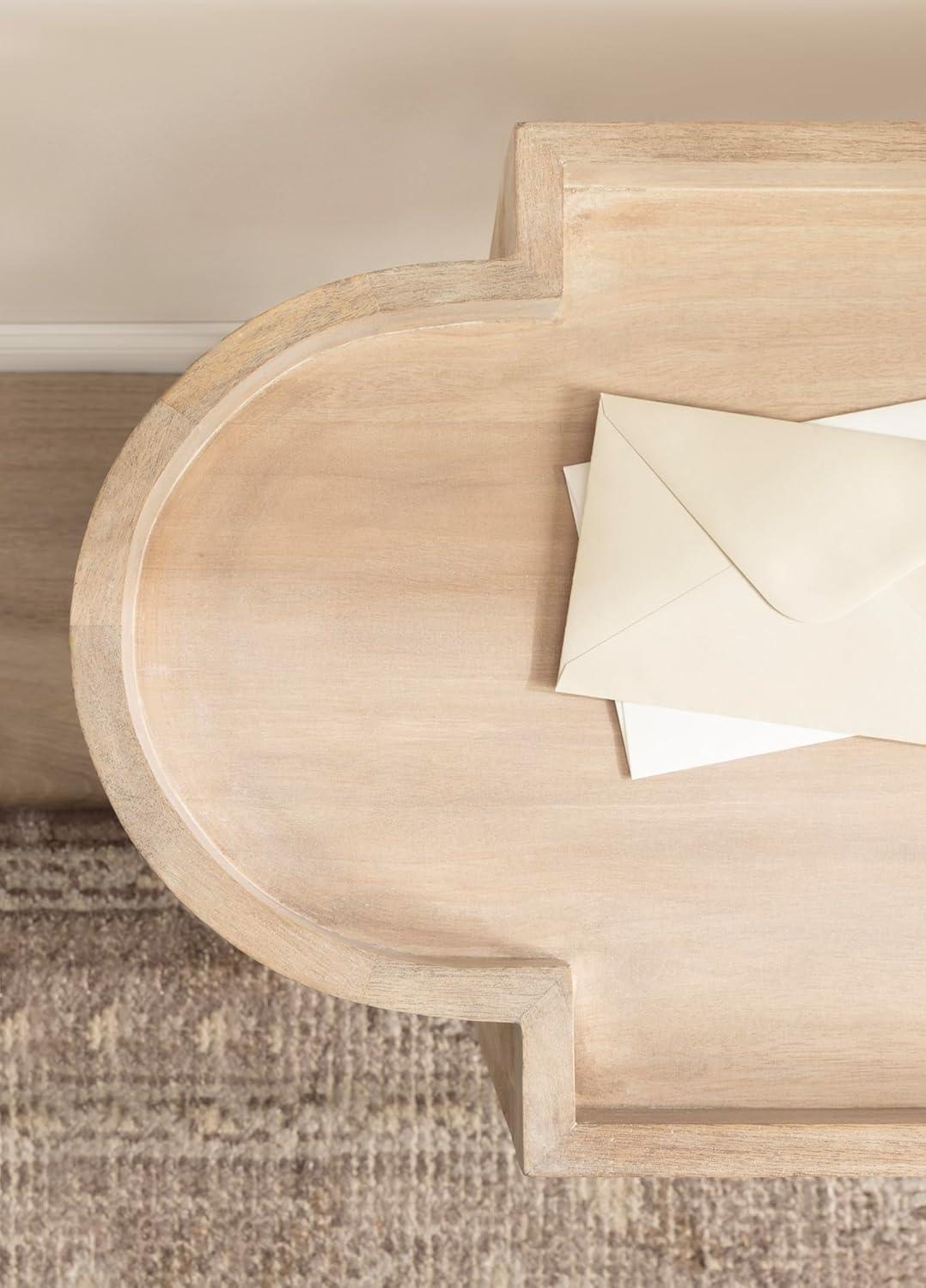 Showcase your transitional-inspired style with the trendy Jovie console table from Kate and Laurel. The natural wood finish of the table adds a touch of sophistication to any space, while the scalloped tabletop makes a youthful statement in your entryway. The versatile light natural wood finish also lends itself to various design styles for that look of transitional, timeless decor. This beautiful entryway table is crafted of solid mango wood with a wood veneer for the inset tabletop, creating a statement that is as durable as it is charming. Due to its versatile design, you can easily showcase it behind your living room couch or on an available bedroom wall. Its overall dimensions are 38 inches wide by 14 inches deep by 30 inches tall, allowing the Jovie to function well as an entryway focal point. The tabletop is perfect for creating a spacious display area for candles, small lamps, and other decor accents. Or, use it as a “getting-ready” station before you head out the front door. Assemble this table in only a matter of minutes with a straightforward, two-step assembly process.