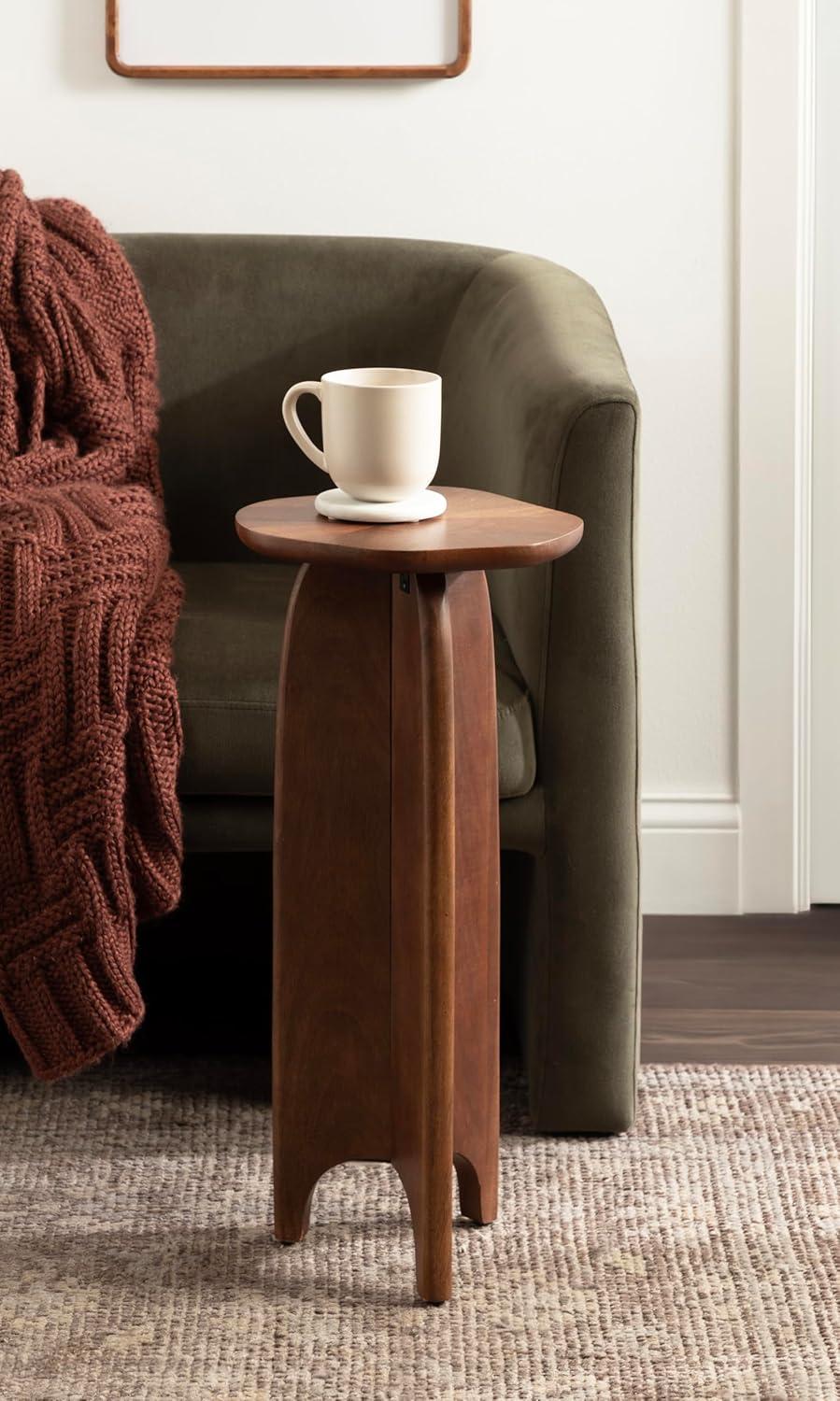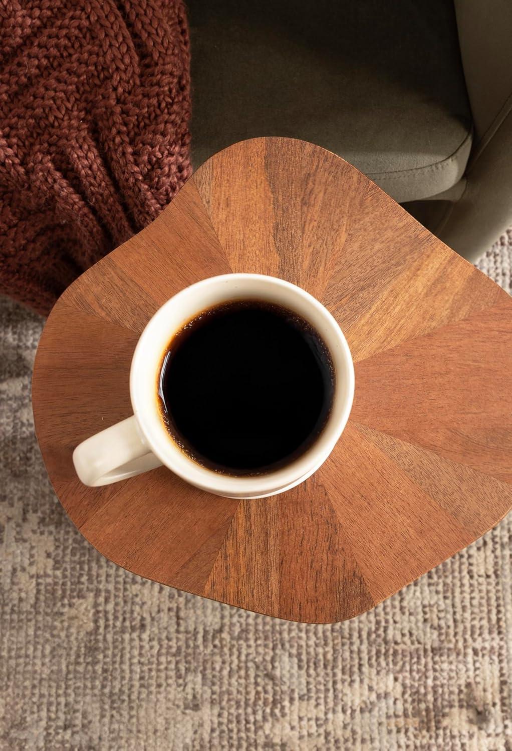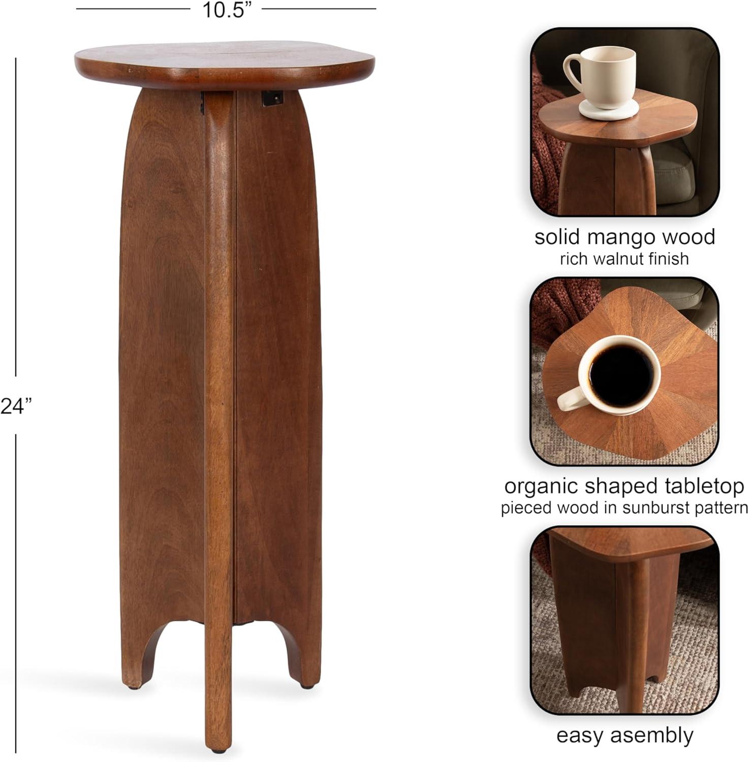 Showcase your modern-inspired style with the Kanna round drink table from Kate and Laurel. The organic and natural finish of the wood adds a touch of sophistication to any space, while the unique curvature of the tabletop makes it easy to blend seamlessly with any decor style. The pieced wood tabletop creates a sunburst look atop its wavy profile. The walnut brown finish also lends itself to modern design, giving it that look of transitional yet contemporary decor. Crafted from solid mango wood, the mini table creates a statement that is as durable as it is beautiful. Its overall dimensions are 10.5 inches in diameter by 24 inches tall, allowing the Kanna to function well in small corners, next to a bed, near an entryway, or paired with living room furniture. The irregular tabletop boasts an organic shape and is perfect for creating a curated display area for candles, small lamps, and other accents. This accent table features a simple, two-step assembly process, so you can begin enjoying it minutes out of the packaging.