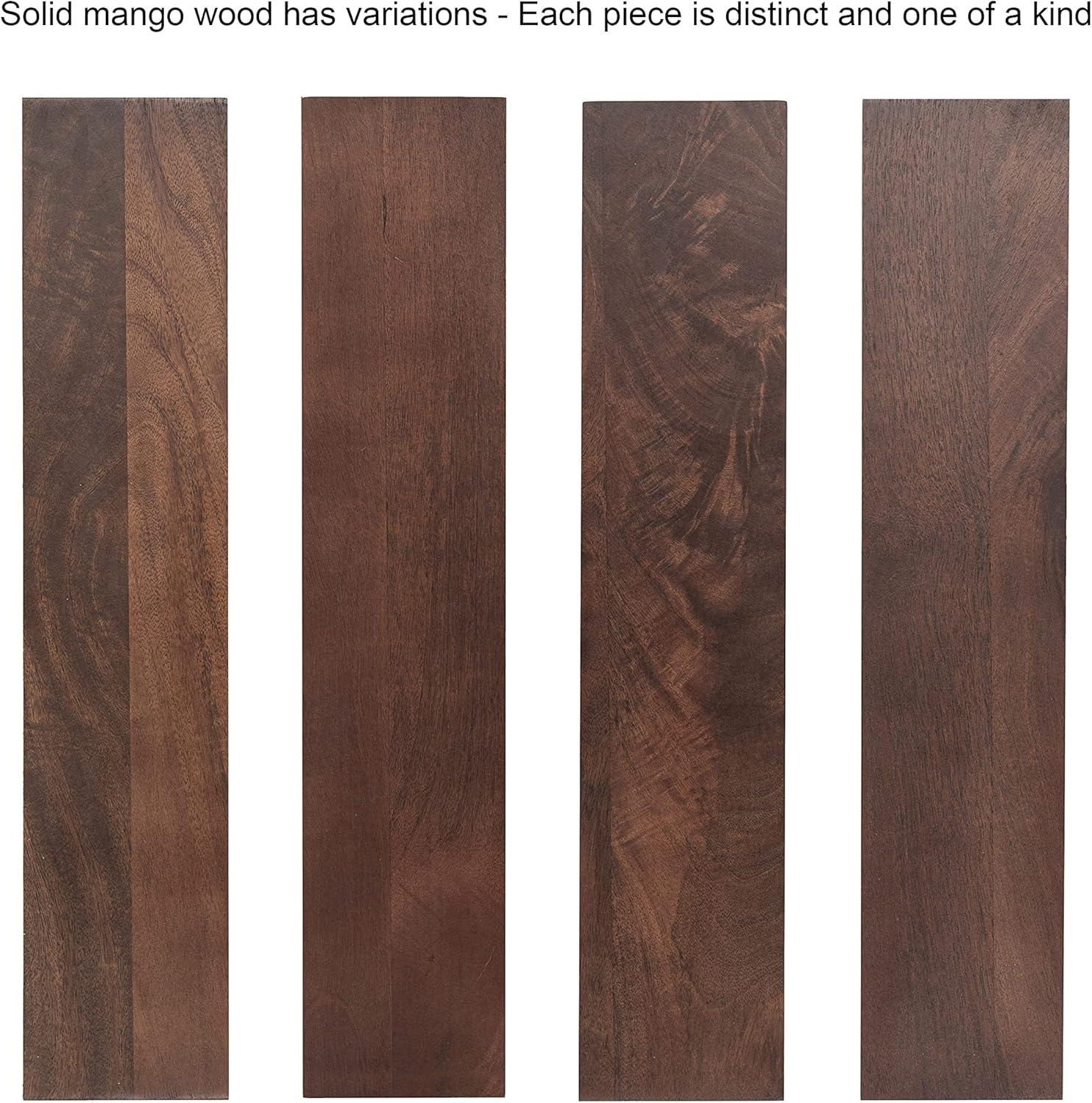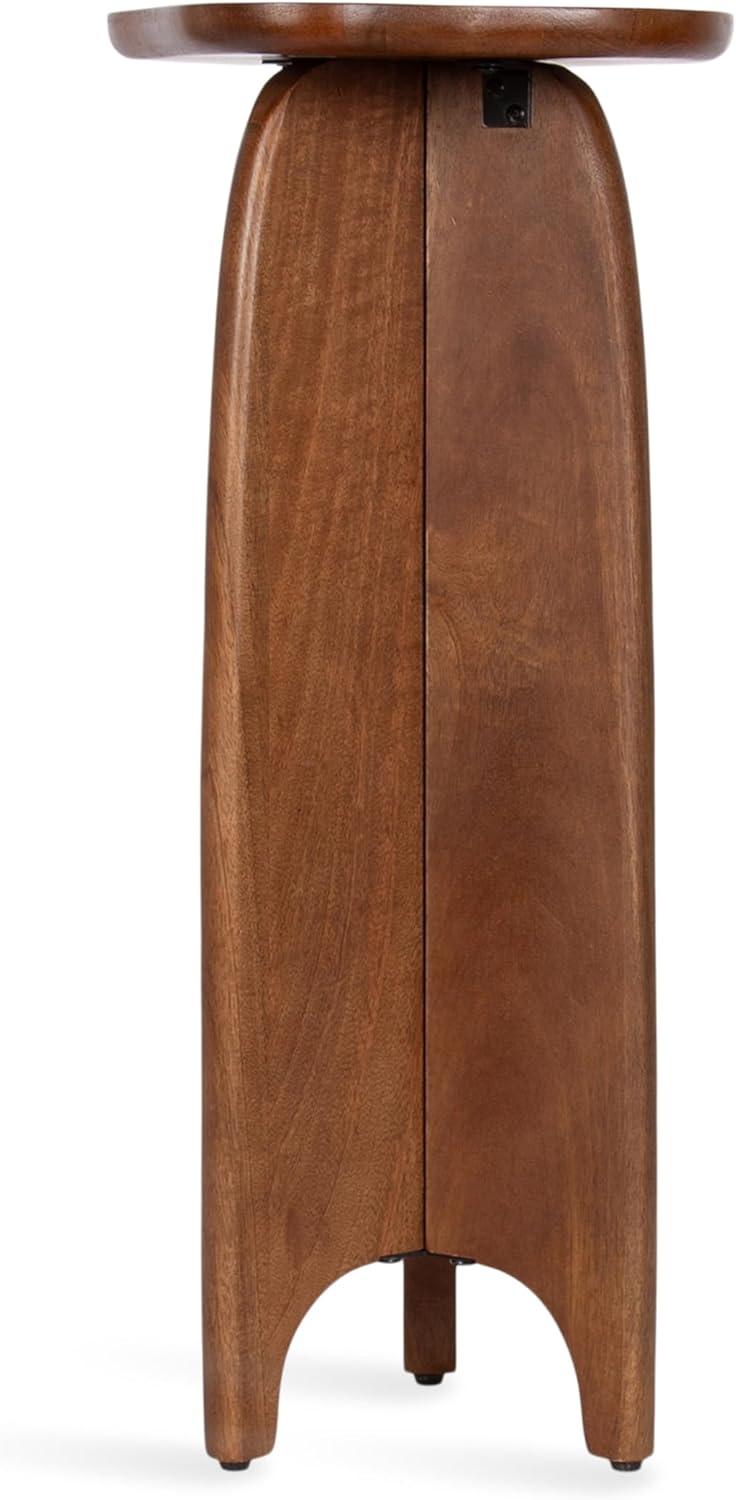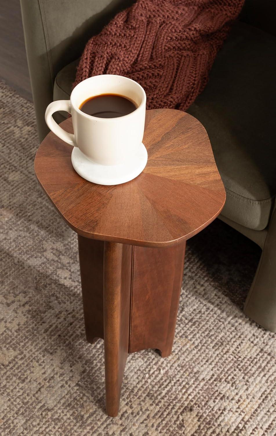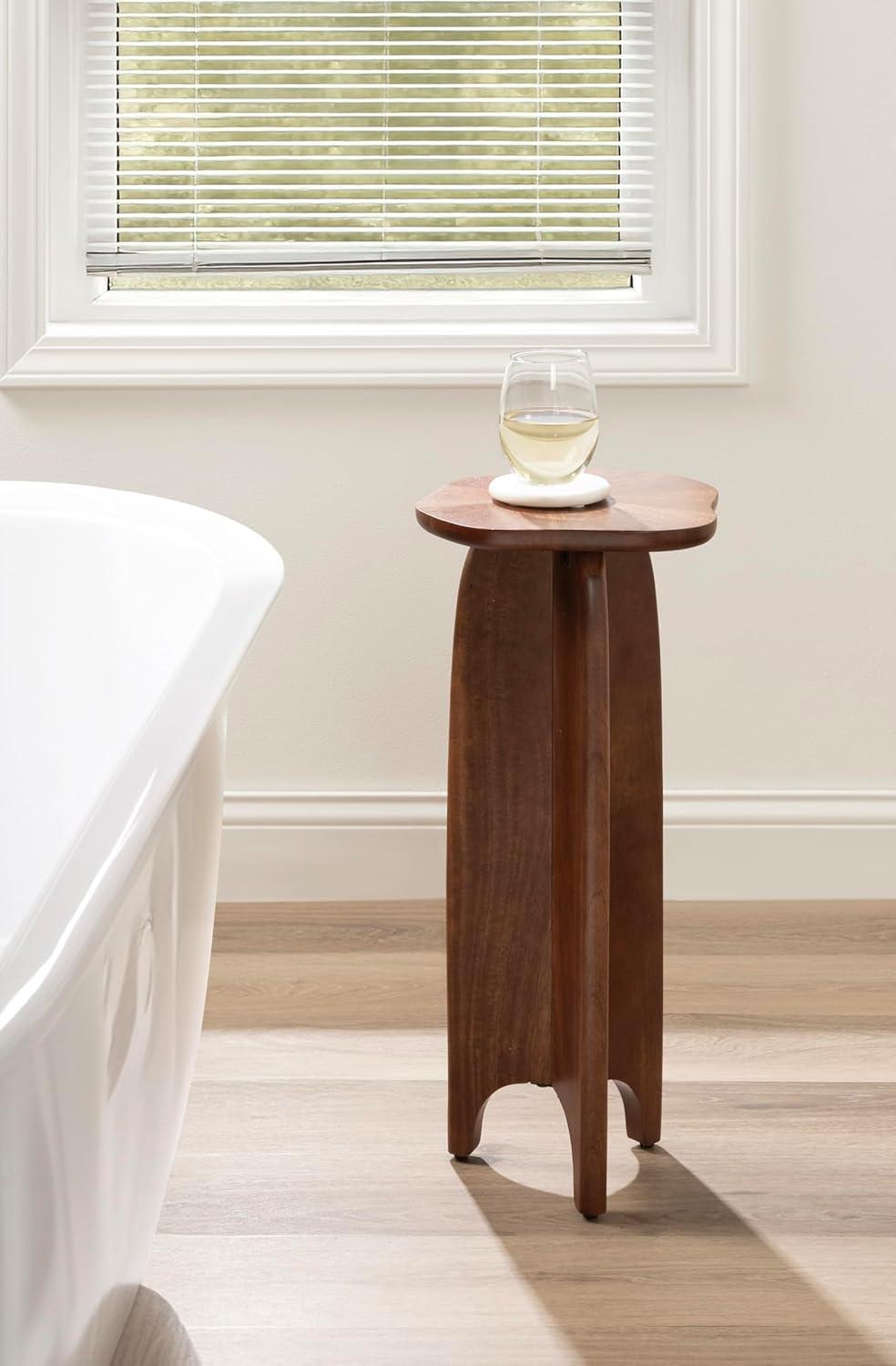 Showcase your modern-inspired style with the Kanna round drink table from Kate and Laurel. The organic and natural finish of the wood adds a touch of sophistication to any space, while the unique curvature of the tabletop makes it easy to blend seamlessly with any decor style. The pieced wood tabletop creates a sunburst look atop its wavy profile. The walnut brown finish also lends itself to modern design, giving it that look of transitional yet contemporary decor. Crafted from solid mango wood, the mini table creates a statement that is as durable as it is beautiful. Its overall dimensions are 10.5 inches in diameter by 24 inches tall, allowing the Kanna to function well in small corners, next to a bed, near an entryway, or paired with living room furniture. The irregular tabletop boasts an organic shape and is perfect for creating a curated display area for candles, small lamps, and other accents. This accent table features a simple, two-step assembly process, so you can begin enjoying it minutes out of the packaging.