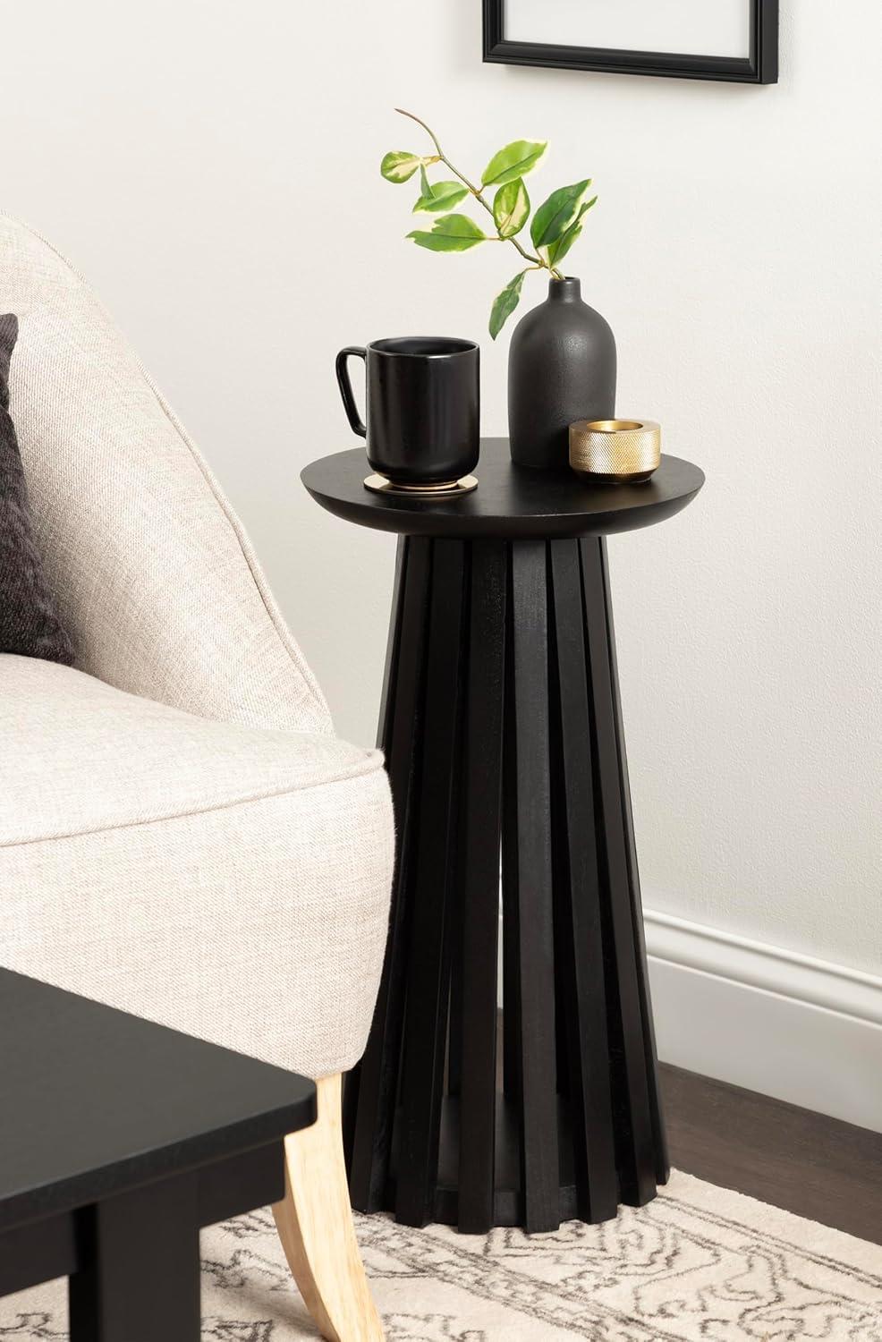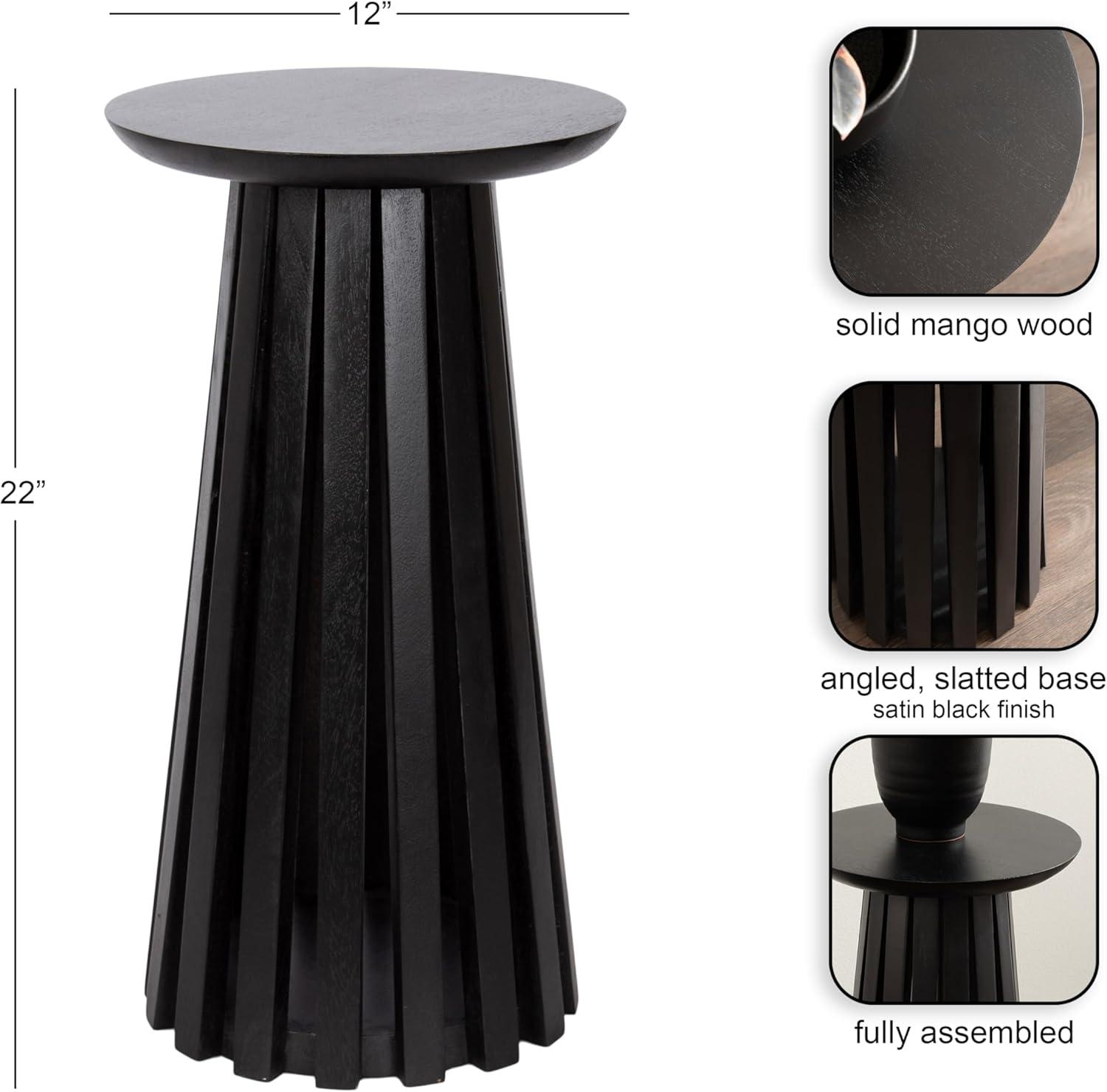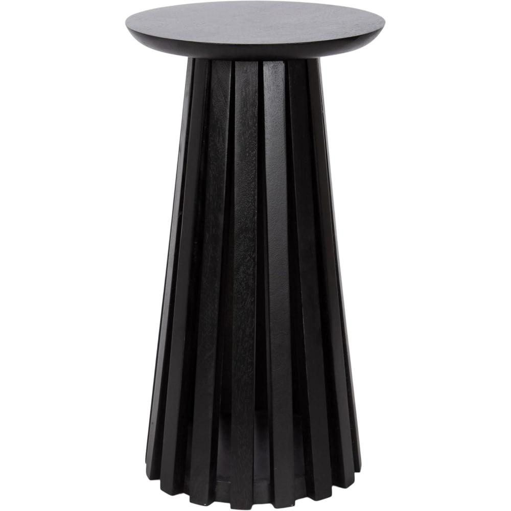 Introducing our beautifully crafted Klarc wooden drink table, the perfect addition to any living room, home office, or sunroom. Made from high-quality mango wood, this table offers a stylish slatted wood base and a sturdy, reliable surface to hold your drinks, plants, or any items you may need within reach. The table base is narrowest at the top and widens out toward the bottom of the table. Measuring 22 inches in height and 12 inches in diameter, this table is the perfect size to fit next to your favorite armchair or couch. The walnut brown finish of the wood provides an elegant and timeless look that complements any decor style. Not only is this wooden side table functional and stylish, but it's also durable and long-lasting. The mango wood construction ensures that it can withstand regular use and will feature unique variations within the woodgrain based on its organic wood structure. Plus, its compact size makes it easy to move around and store when not in use. This versatile table is perfect for enjoying a relaxing evening at home or hosting a gathering with friends and family. This uber-functional drink table comes fully assembled, so you can begin enjoying it right out of the packaging.