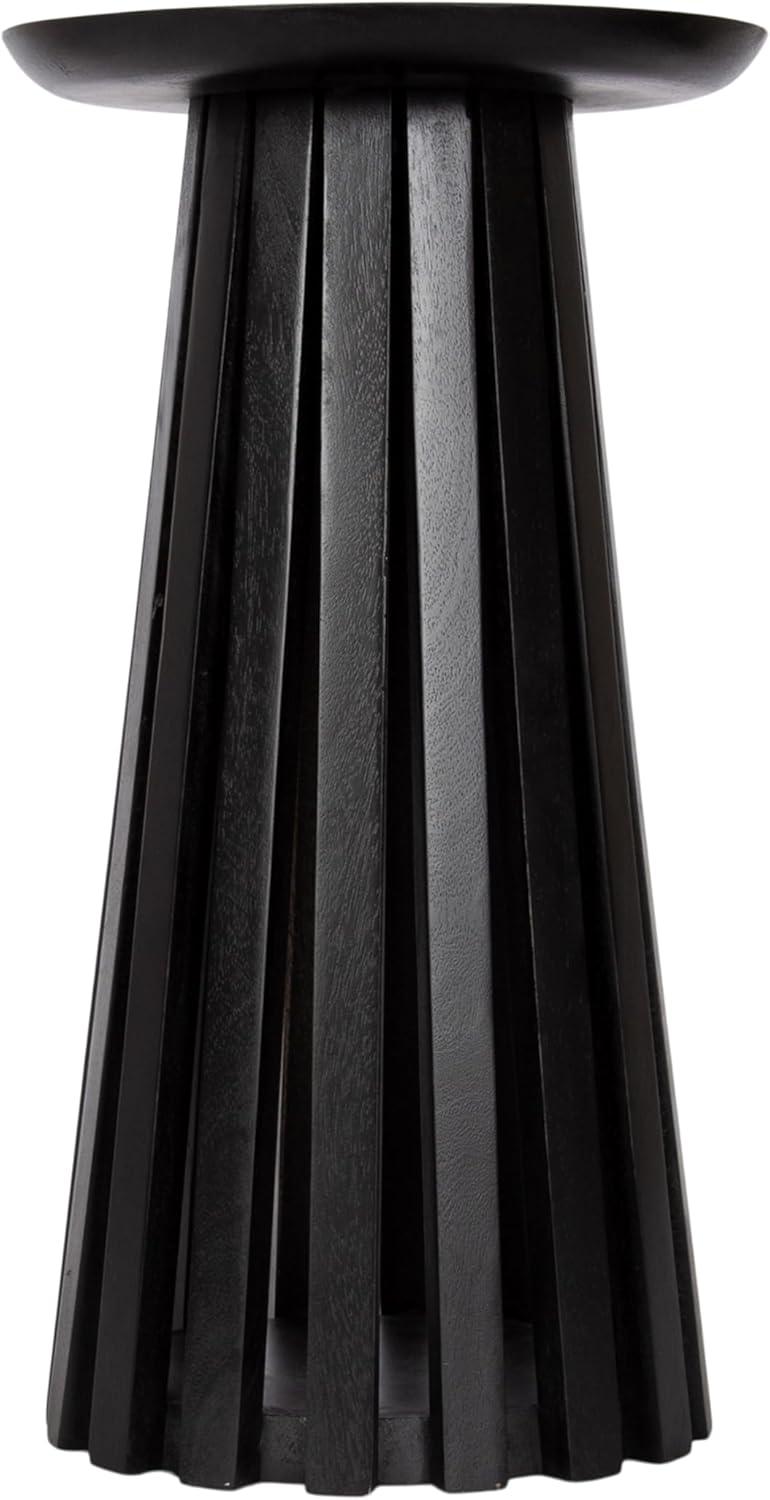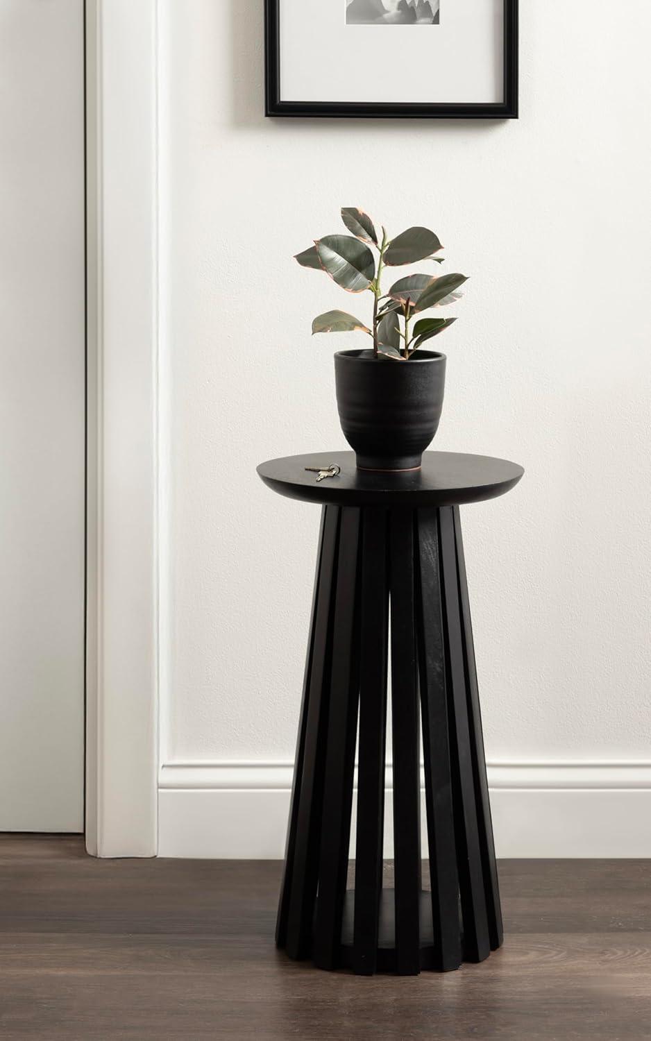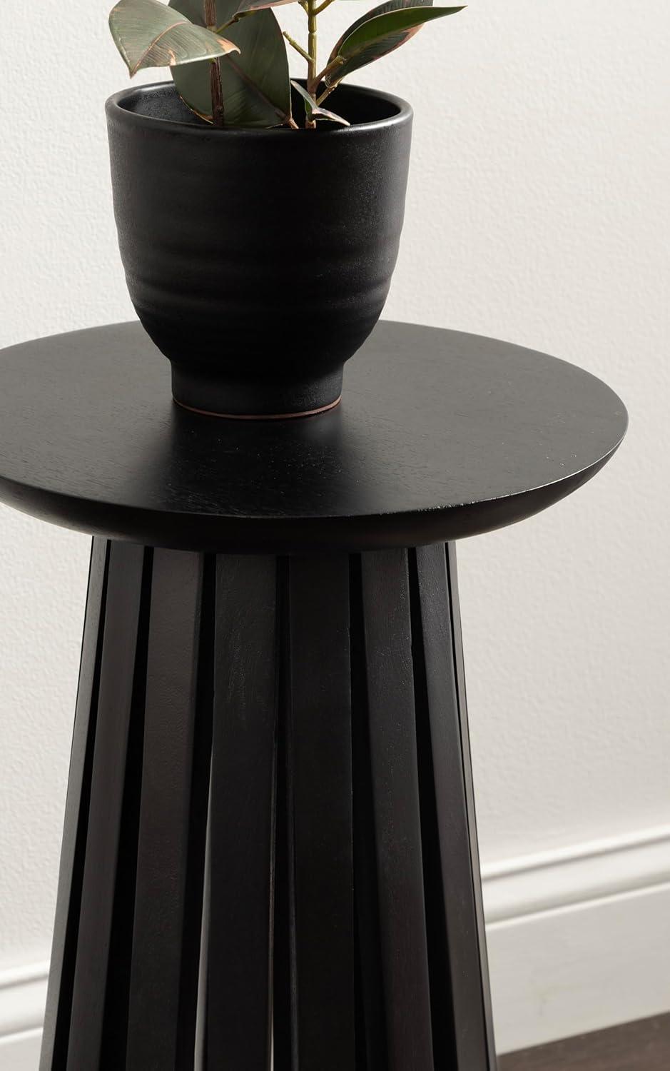 Introducing our beautifully crafted Klarc wooden drink table, the perfect addition to any living room, home office, or sunroom. Made from high-quality mango wood, this table offers a stylish slatted wood base and a sturdy, reliable surface to hold your drinks, plants, or any items you may need within reach. The table base is narrowest at the top and widens out toward the bottom of the table. Measuring 22 inches in height and 12 inches in diameter, this table is the perfect size to fit next to your favorite armchair or couch. The walnut brown finish of the wood provides an elegant and timeless look that complements any decor style. Not only is this wooden side table functional and stylish, but it's also durable and long-lasting. The mango wood construction ensures that it can withstand regular use and will feature unique variations within the woodgrain based on its organic wood structure. Plus, its compact size makes it easy to move around and store when not in use. This versatile table is perfect for enjoying a relaxing evening at home or hosting a gathering with friends and family. This uber-functional drink table comes fully assembled, so you can begin enjoying it right out of the packaging.