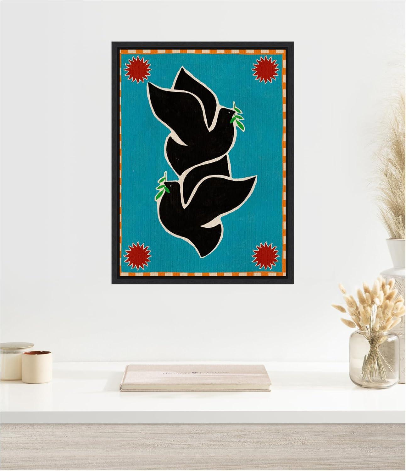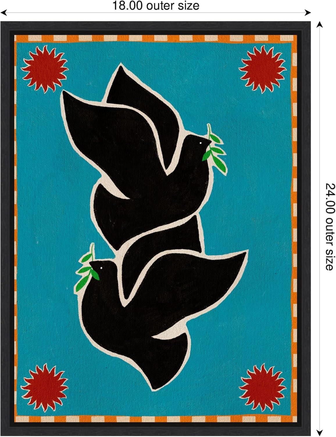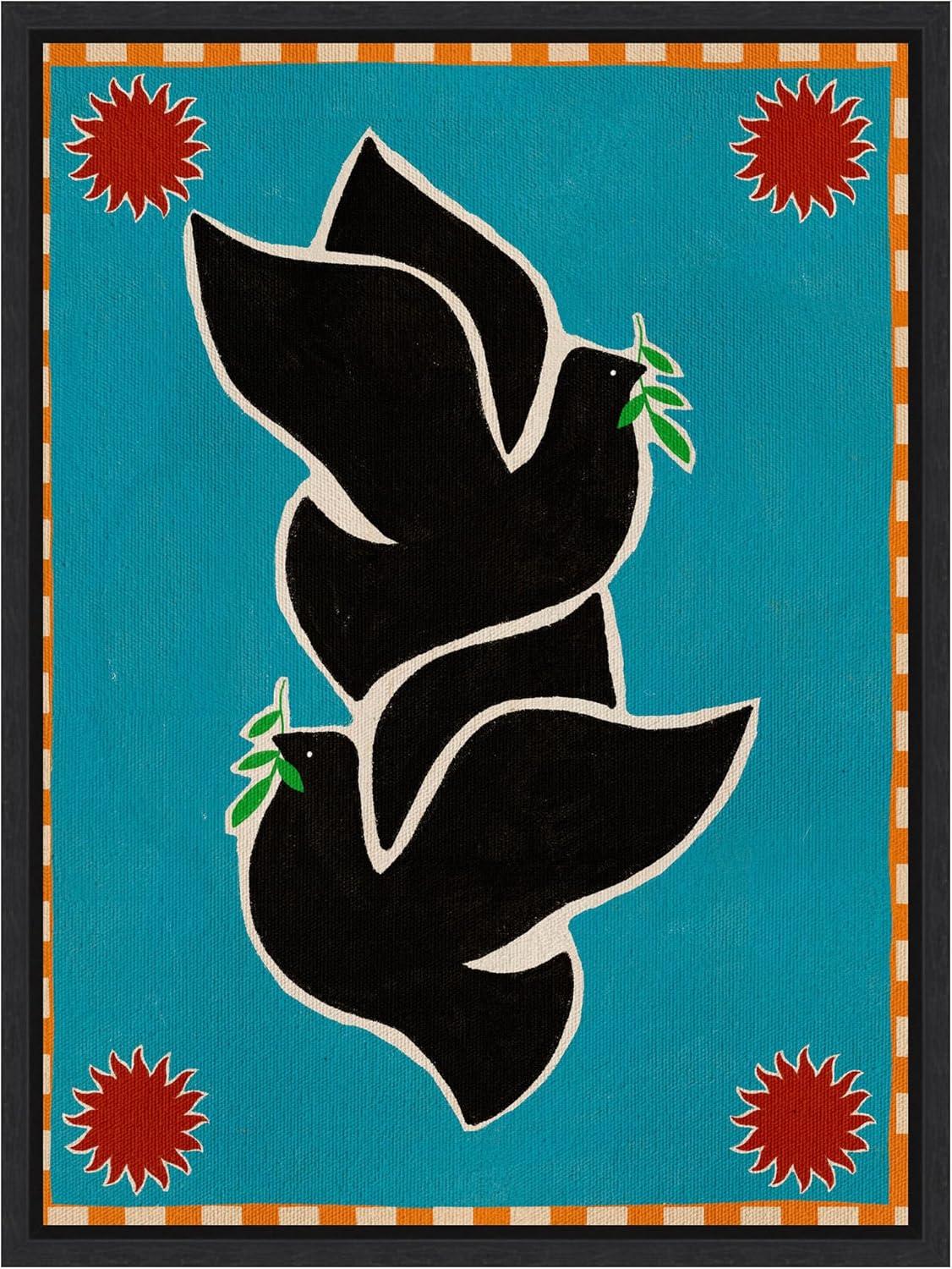 The artwork depicts two stylized black doves holding green leaves, set against a bright blue background. The composition is framed with a checkered orange and white border, with red sun-like shapes in the corners. The contrast of colors and geometric patterns creates a vibrant and harmonious visual impact. This Kate and Laurel canvas art print was created by Shatha Al Dafai and printed by Kate and Laurel in Waunakee WI. This modern floating canvas art is sure to bring joy to your space. Our design team curates art that will fit perfectly in any room of your home. Showcase this art in your living room, bedroom, home office, kitchen, bathroom, nursery, or anywhere you want to bring a little beauty and charm to your walls. Specializing in home decor, we are continually bringing timeless works of art for the traditional decorator as well as trend-forward pieces for that eclectic art lover. Our high-quality framed canvas art also makes excellent gifts for birthdays, holidays, or housewarming parties. Printed on gallery-wrapped canvas and framed with a simple gallery frame this wall art is easy to display on the wall and will match with any decor style. The outside display dimensions are 18 in x 24 in by 1.6 in Print Name: “Lush Duo 4 Birds”