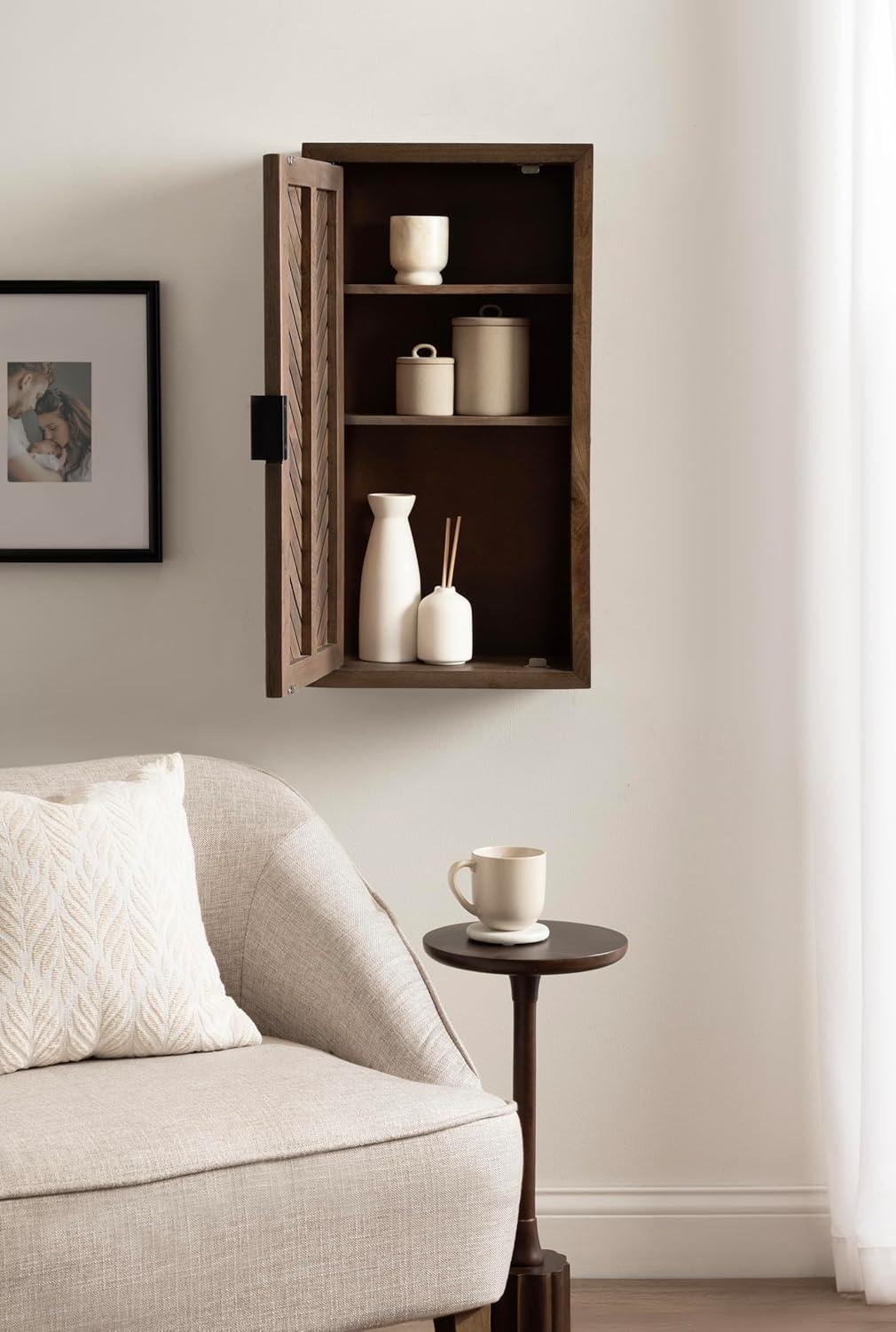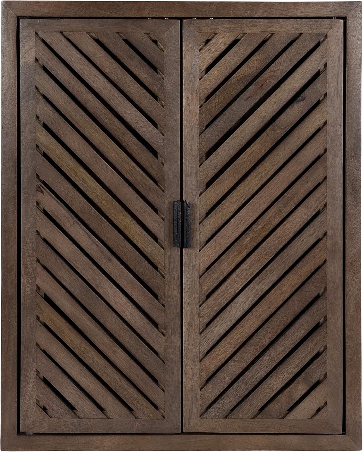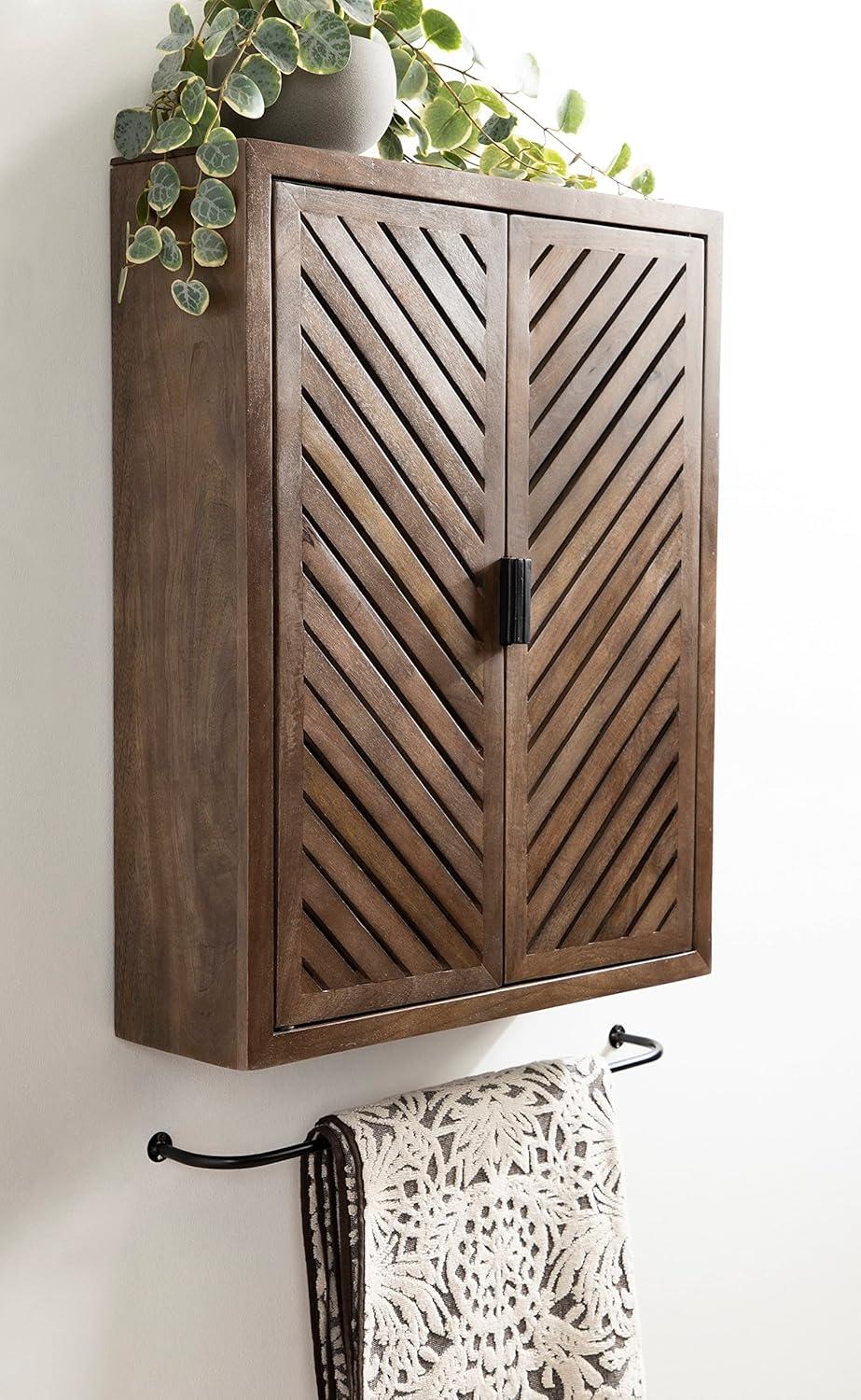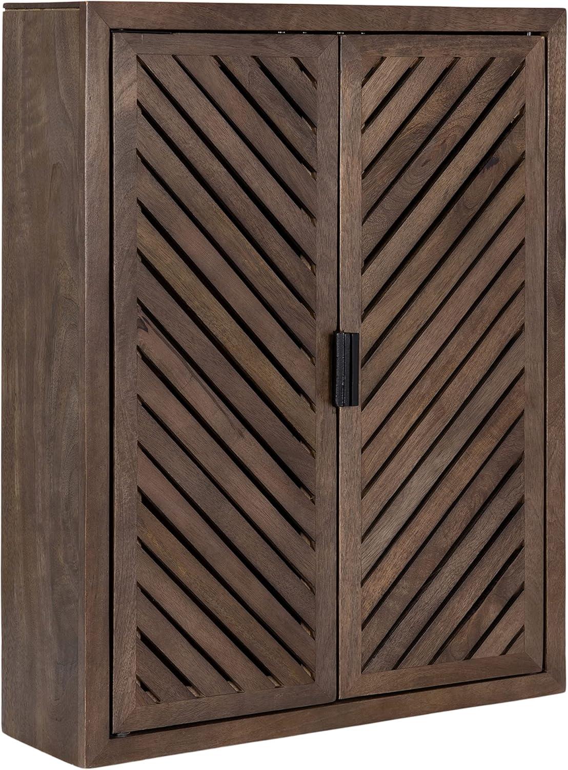 Kate and Laurel Mezzeta Decorative Modern One-Door Floating Bathroom Cabinet, 15 x 7 x 28, White, Decorative Over Toilet Storage Cabinet Made from Solid Mango Wood with Slatted Chevron Design(Brown)