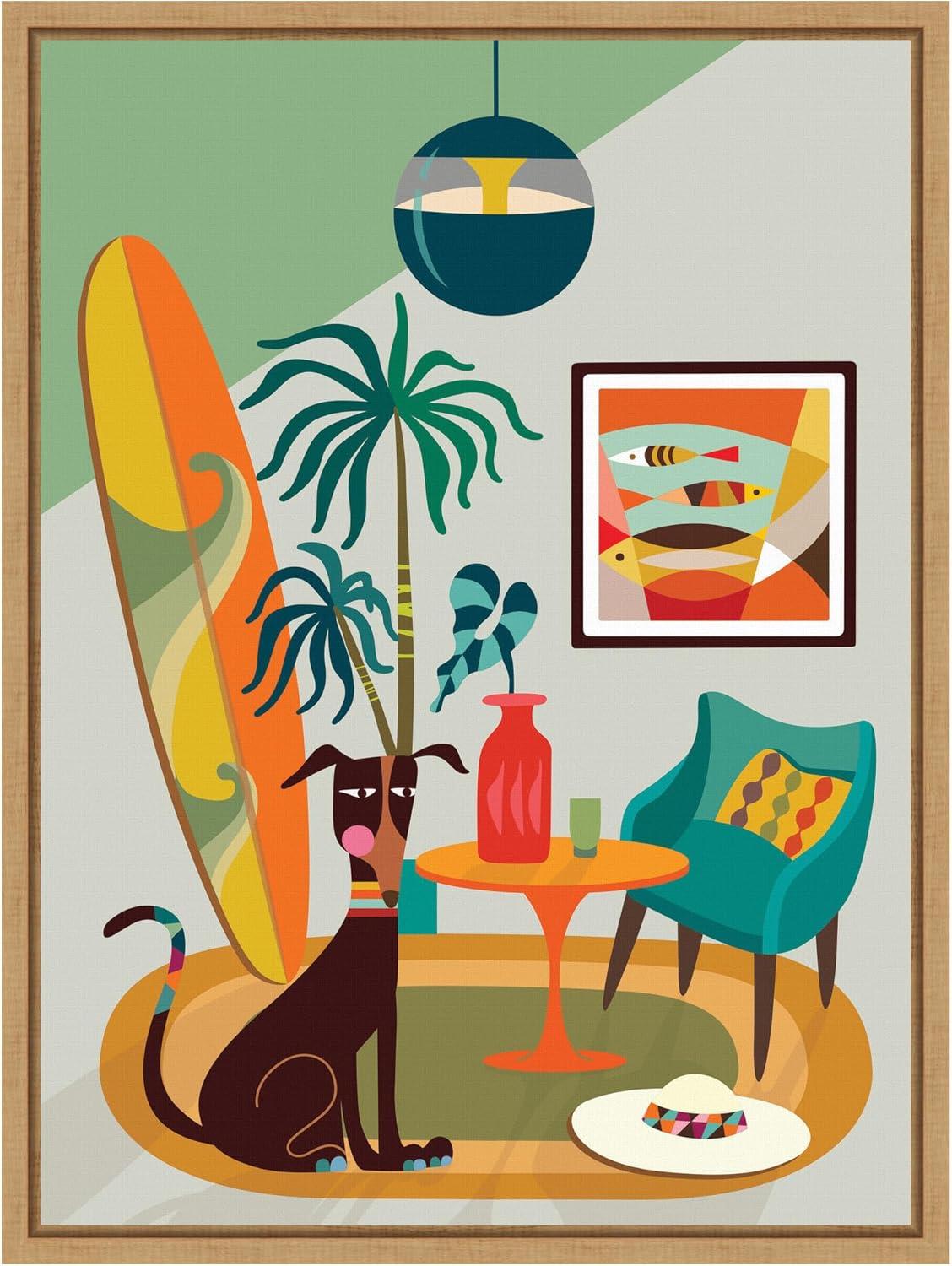The artwork features a stylized interior setting with a colorful surfboard, a sleek dog, and a teal armchair. A decorative plant adds a touch of greenery, and a modern abstract painting hangs on the wall. The room exudes a retro yet vibrant atmosphere, with bold geometric shapes and a playful palette. This Kate and Laurel canvas art print was created by Rachel Lee and printed by Kate and Laurel in Waunakee WI. This modern floating canvas art is sure to bring joy to your space. Our design team curates art that will fit perfectly in any room of your home. Showcase this art in your living room, bedroom, home office, kitchen, bathroom, nursery, or anywhere you want to bring a little beauty and charm to your walls. Specializing in home decor, we are continually bringing timeless works of art for the traditional decorator as well as trend-forward pieces for that eclectic art lover. Our high-quality framed canvas art also makes excellent gifts for birthdays, holidays, or housewarming parties. Printed on gallery-wrapped canvas and framed with a simple gallery frame this wall art is easy to display on the wall and will match with any decor style. The outside display dimensions are 18 in. w x 24 in. h by 1.6 in. Print Name: “Mid Century Modern Dog Beach Home”