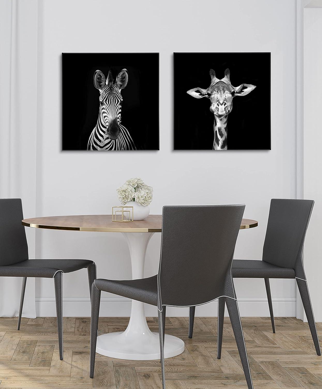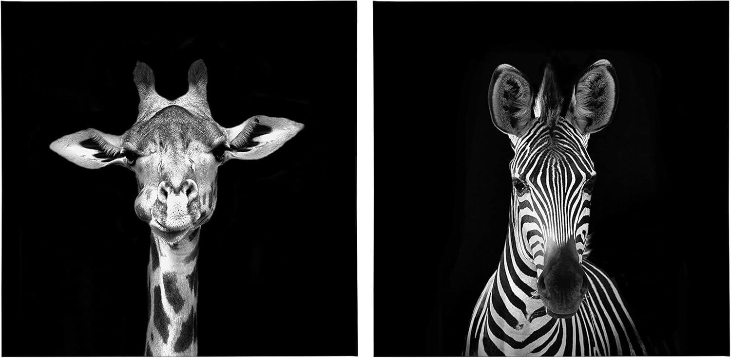 This art set embraces a beautiful modern theme while showcasing some black and white and cute-all-over animal faces! This canvas art will be a pleasure to look at every day in your living room, bedroom, office, or any room in the home. This art set also makes an excellent gift for birthdays, holidays, or housewarming parties. Printed on stretched canvas, this wall art has two hangers already attached to the back for easy wall display. The outer dimensions are 20 inches by 20 inches by 1.58 inches. Print Name: “Minimalist Zebra Animal Portrait on Black & Minimalist Giraffe Animal Portrait on Black”