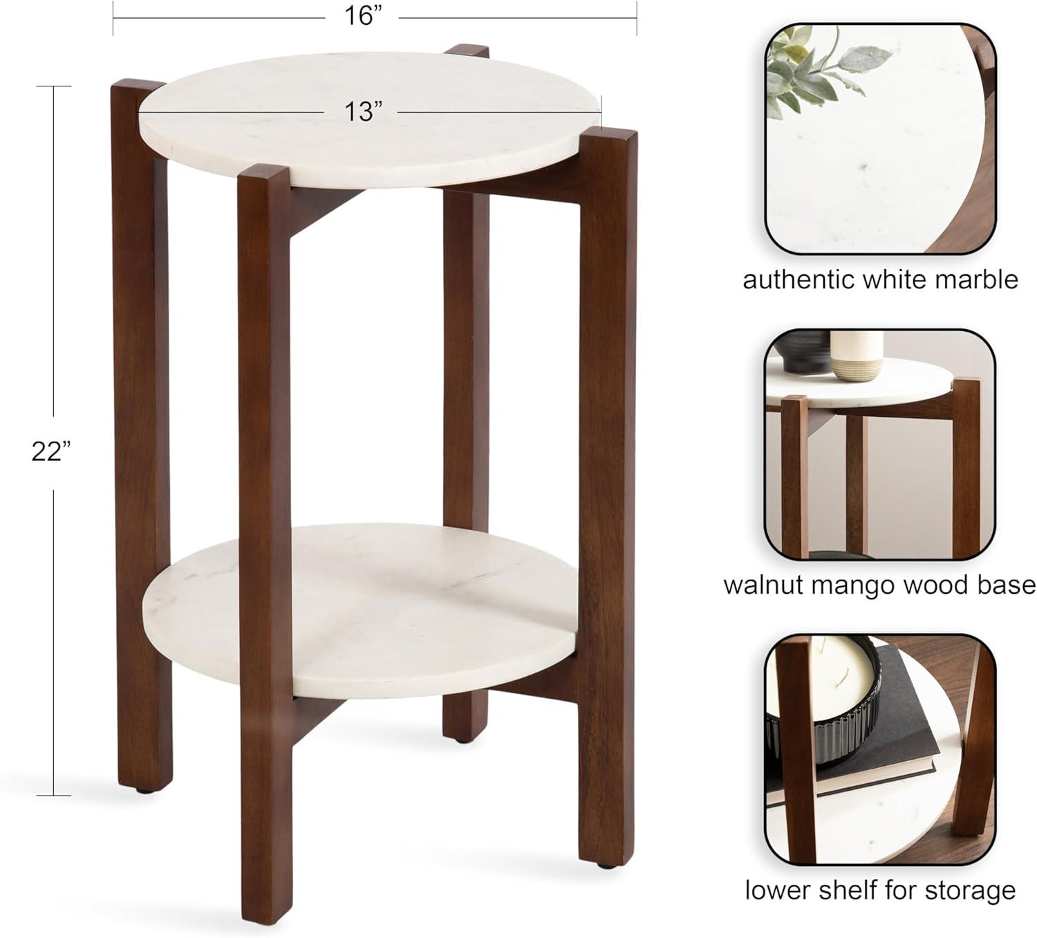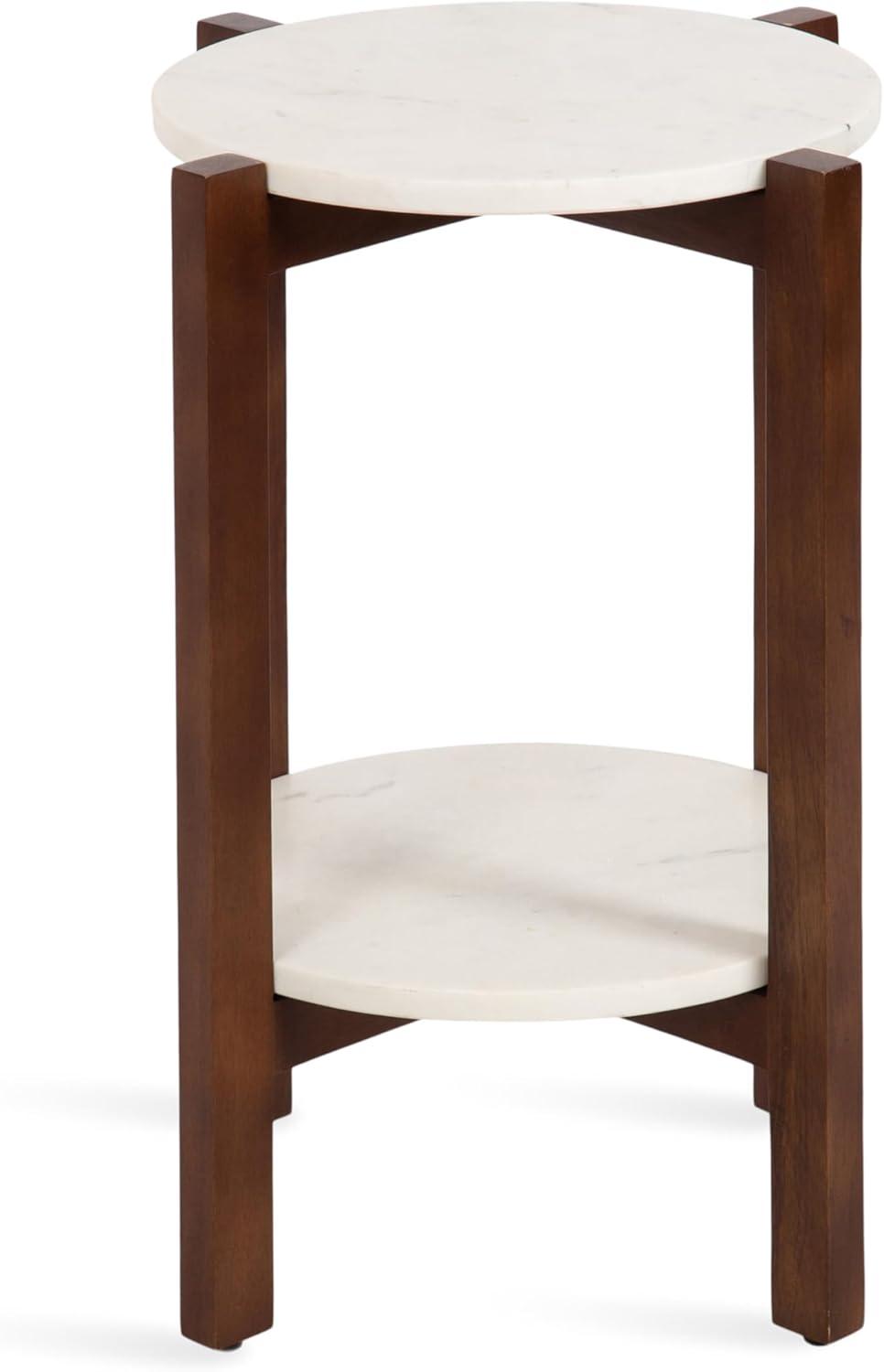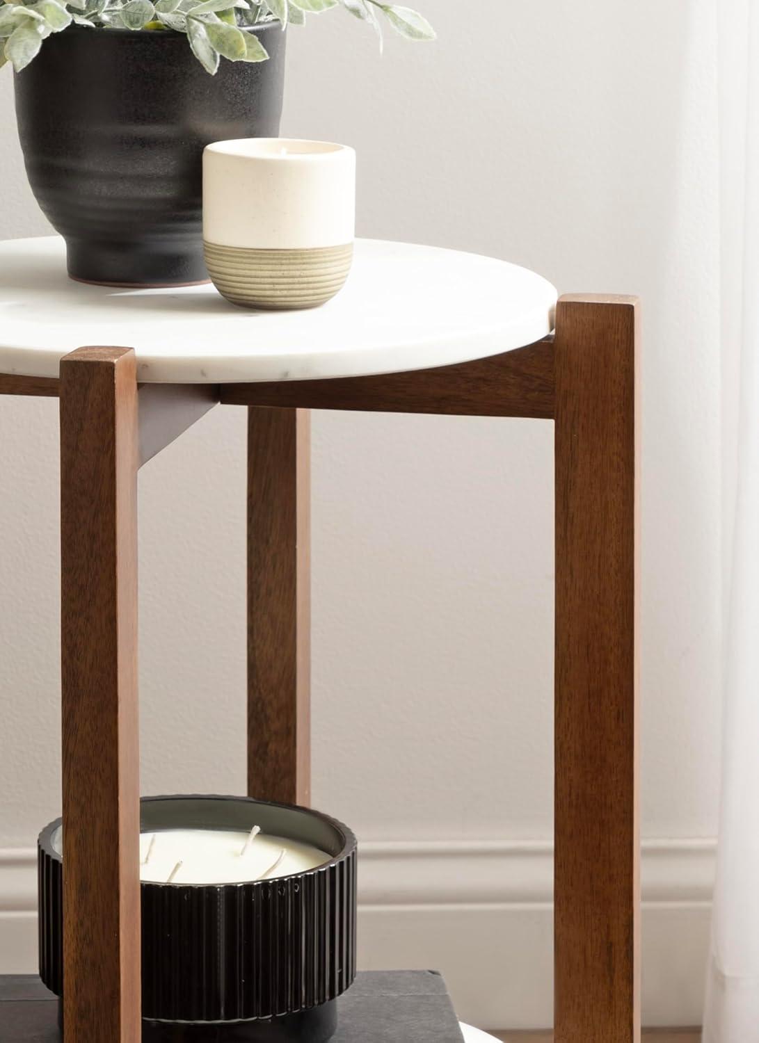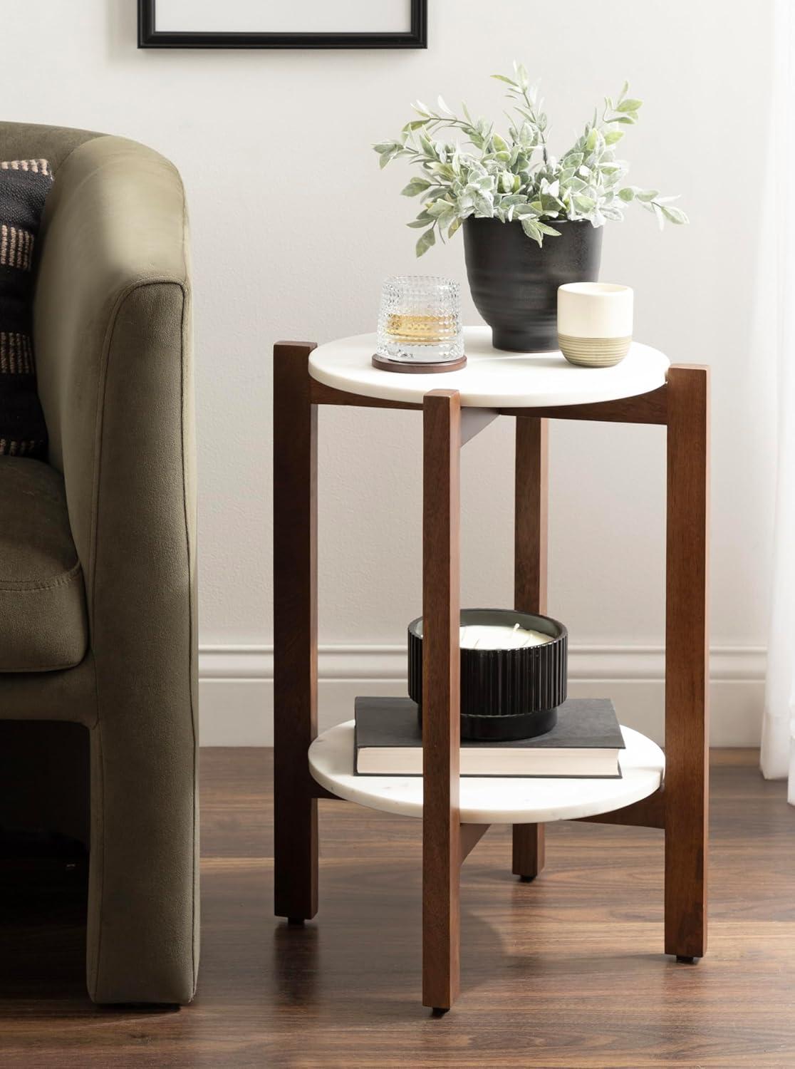 The Moxley is for the transitional modern decorator that craves functionality within their aesthetically-pleasing home. This beautiful side table features two beautiful, authentic marble tabletops for a refined look. Handcrafted in India, each Moxley table contains variations in marble veining, making each piece one-of-a-kind. Your Moxley table also boasts natural wood legs that blend well with almost any space. This end table is the perfect size for flanking your entryway, bed, or couch, measuring 16 inches in diameter by 22 inches tall. Use the top tier as a display surface for decorative accents like a drink with coasters, succulents, an alarm clock, or candles while using the lower shelf to store small household items like books and more. Regardless of where and how you use this beautiful side table, you can rest easy knowing your hardwood or tile floors are protected from damage with the rubber pads attached to each foot. Finally, assemble the stunning Moxley in a matter of minutes with the streamlined 3-step assembly process.