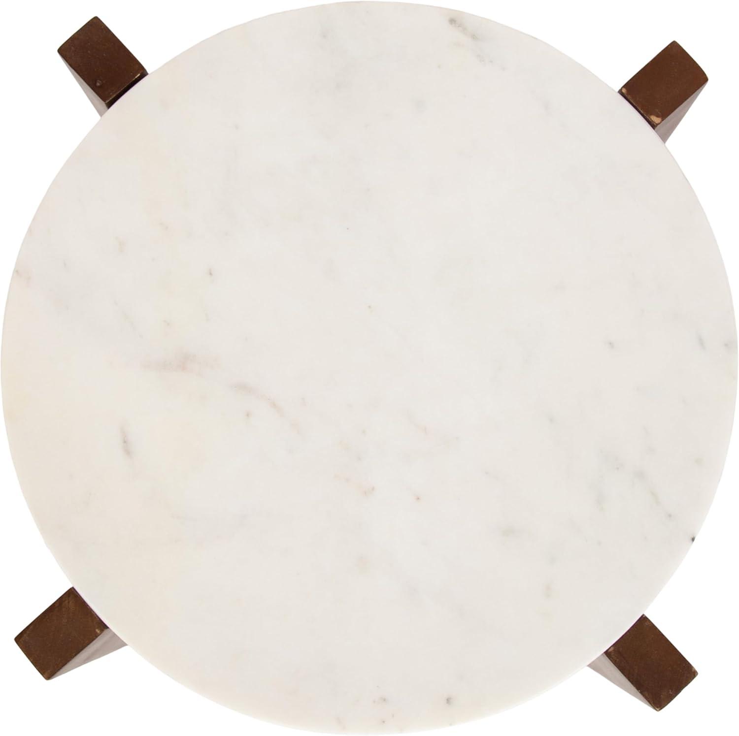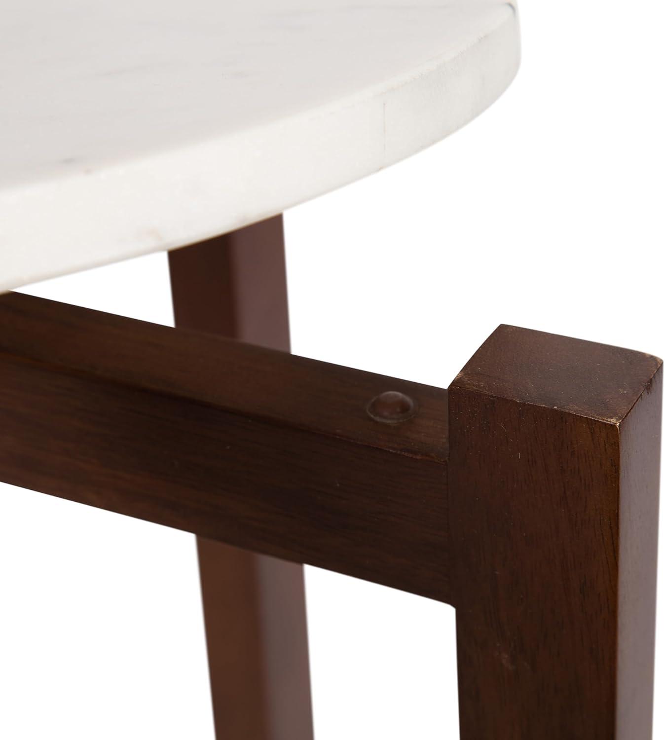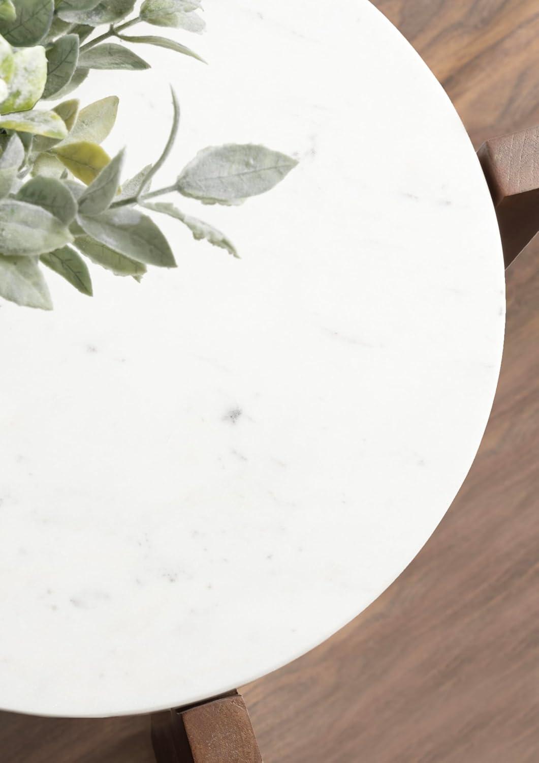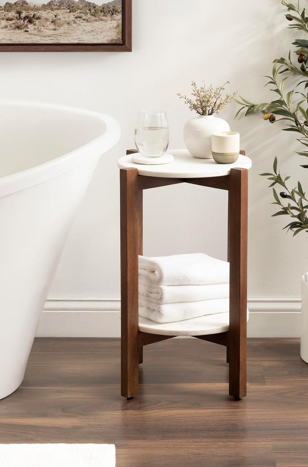 The Moxley is for the transitional modern decorator that craves functionality within their aesthetically-pleasing home. This beautiful side table features two beautiful, authentic marble tabletops for a refined look. Handcrafted in India, each Moxley table contains variations in marble veining, making each piece one-of-a-kind. Your Moxley table also boasts natural wood legs that blend well with almost any space. This end table is the perfect size for flanking your entryway, bed, or couch, measuring 16 inches in diameter by 22 inches tall. Use the top tier as a display surface for decorative accents like a drink with coasters, succulents, an alarm clock, or candles while using the lower shelf to store small household items like books and more. Regardless of where and how you use this beautiful side table, you can rest easy knowing your hardwood or tile floors are protected from damage with the rubber pads attached to each foot. Finally, assemble the stunning Moxley in a matter of minutes with the streamlined 3-step assembly process.