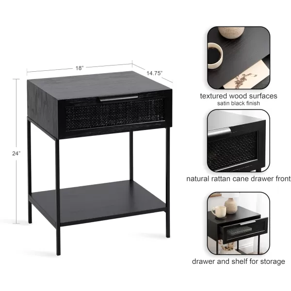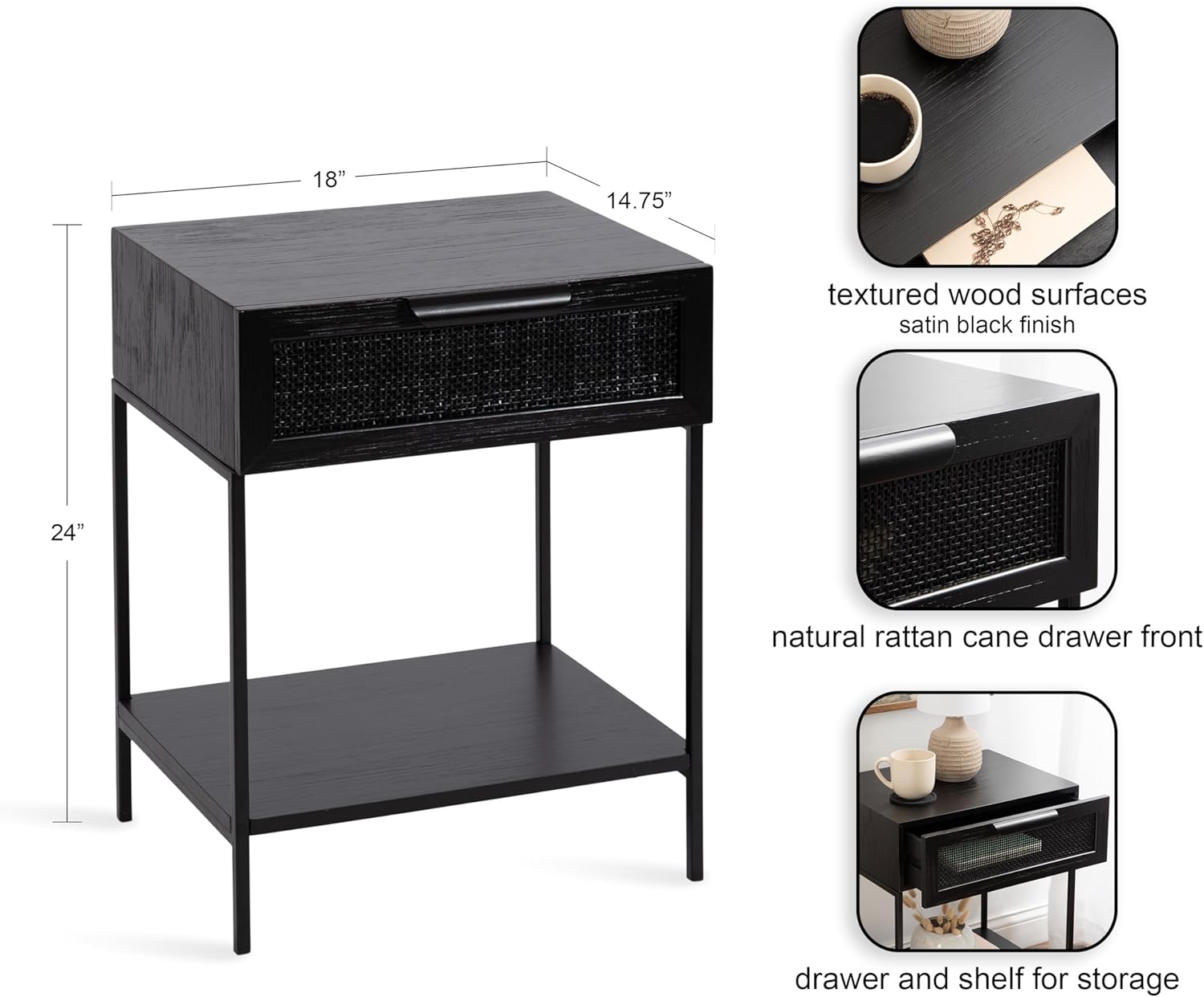 Introducing the Ori rectangle side table – the perfect addition to your bedroom or living space! This modern end table is designed to add functionality and style to any room with its sleek yet natural design. The modern black finish adds depth and elegance to your decor, making it a versatile piece that complements various interior styles. The rattan face adds a textural element, which allows this to lean boho or minimal based on your surrounding decor. Featuring a convenient drawer, this living room table provides ample storage space for your essentials, such as books, remotes, and other small items. The useful two-tiered design also helps to create more storage space, making it a great choice for small rooms or apartments. Made from solid wood, this rectangular side table is built to last. Measuring 18 inches wide by 14.75 inches deep by 24 inches tall, this compact side table is ideal for small spaces, making it perfect for use as a bedroom table or as a space-saving solution in any room. Whether you use it as a bedroom accent or a sleek side table, it is sure to enhance the functionality and style of your room. Add a touch of modern sophistication to your home with this versatile and stylish side table!