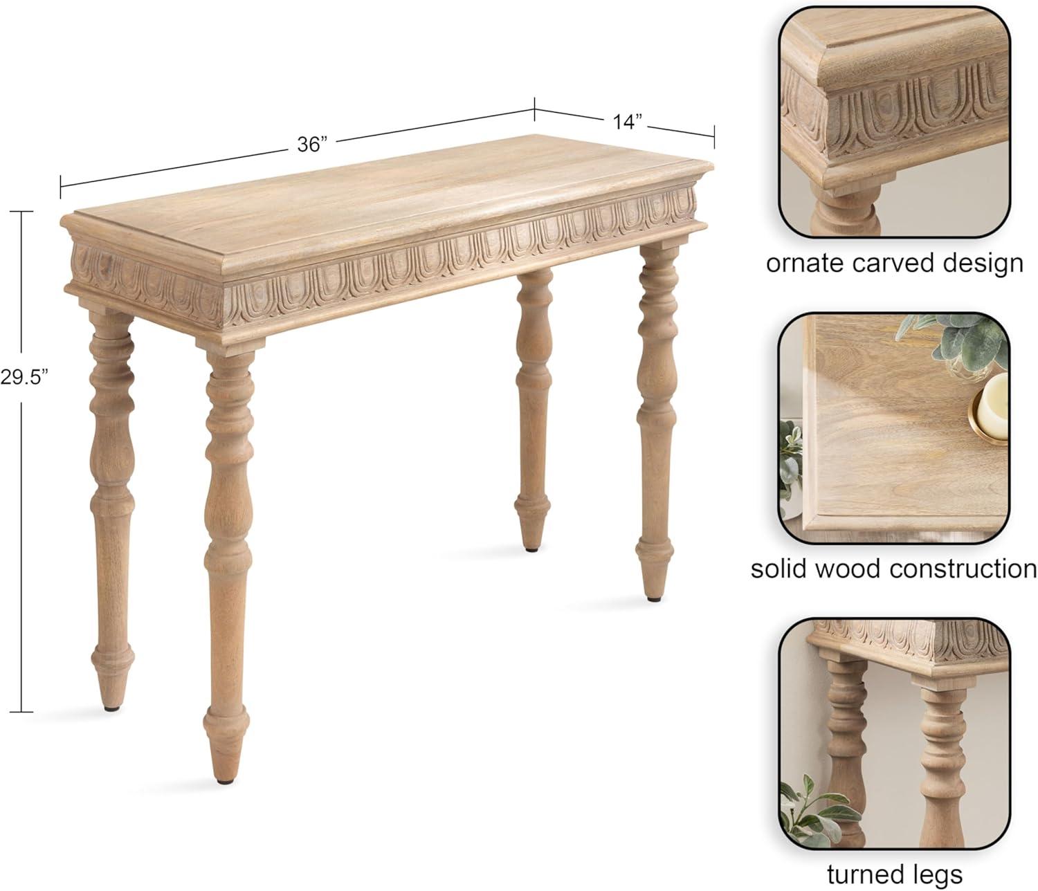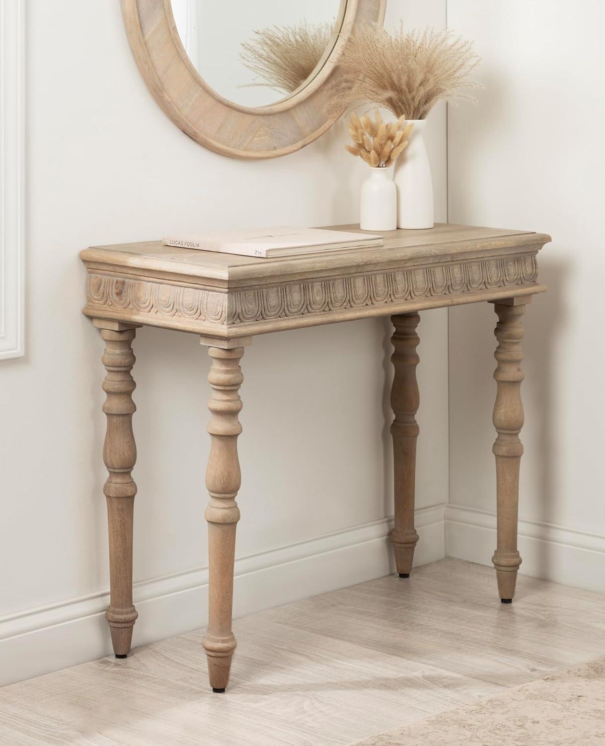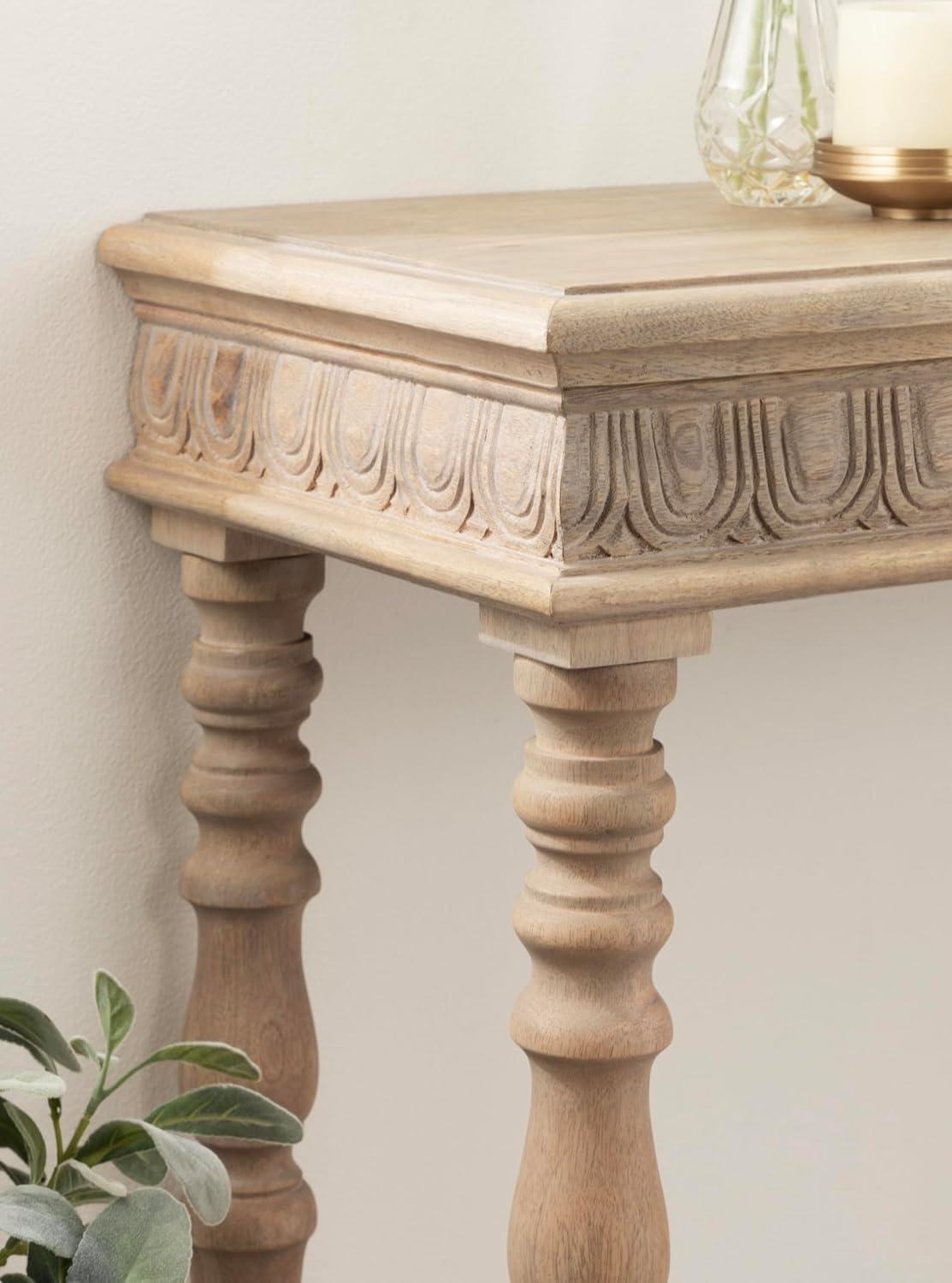 Ornate Carved Detailing: Crafted from solid mango wood, the Patresa console table features carved details along the sides of the table