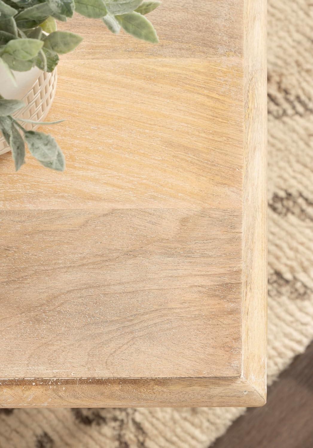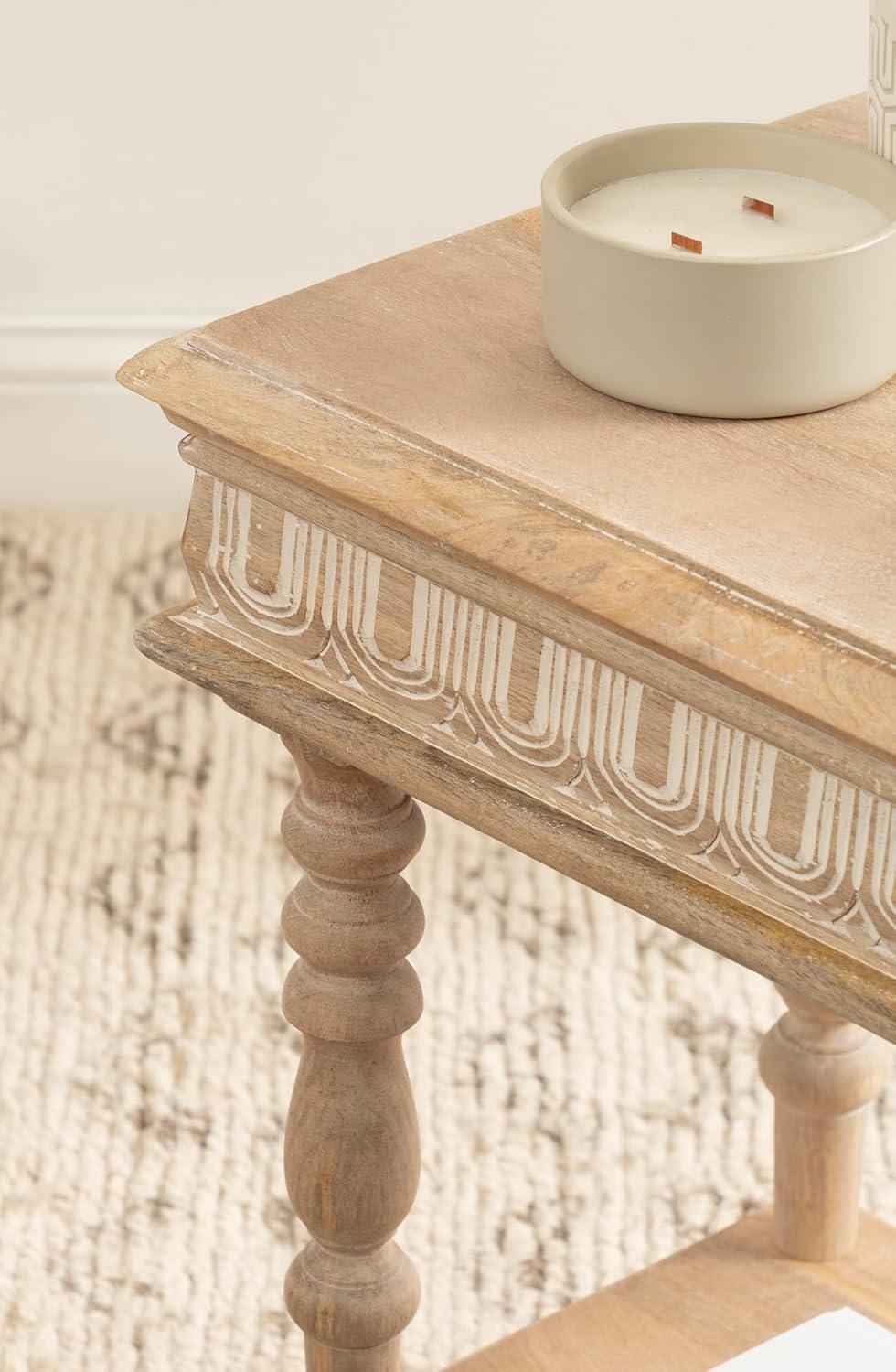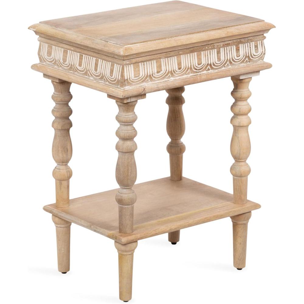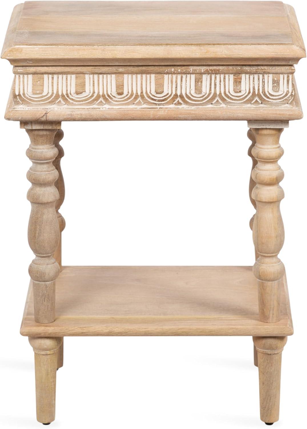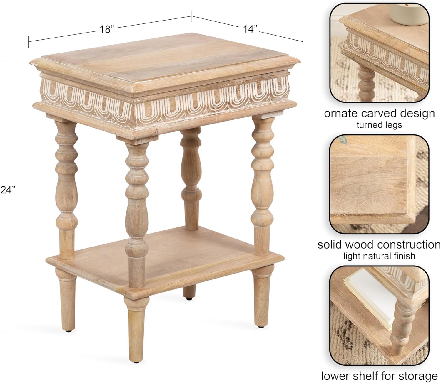 Blend your love of modern style with a dash of transitional functionality with the Patresa side table. This table embraces a minimalist, uncomplicated design in its rectangular shape. Skilled artisans craft the Patresa by hand, and due to this careful, delicate crafting, each piece is one-of-a-kind in finish and woodgrain. It is made of 100% solid mango wood with detailed carvings, giving your space a unique look and textural feel. It not only looks good; however, it also features two tiers of mango wood tabletops that can serve various purposes throughout your home. The Patresa end table measures 18 inches wide by 14 inches deep by 24 inches tall, while the lower shelf is 16.25 inches wide by 11 inches deep. It is a perfect pairing next to a sofa, by your bed, or flanking your entryway. In addition, the two tiers are ideal for storing and displaying household necessities and your most cherished decorative accent pieces. Assembly for this minimal table takes a matter of minutes with a 3-step process will have your new end table ready in no time.