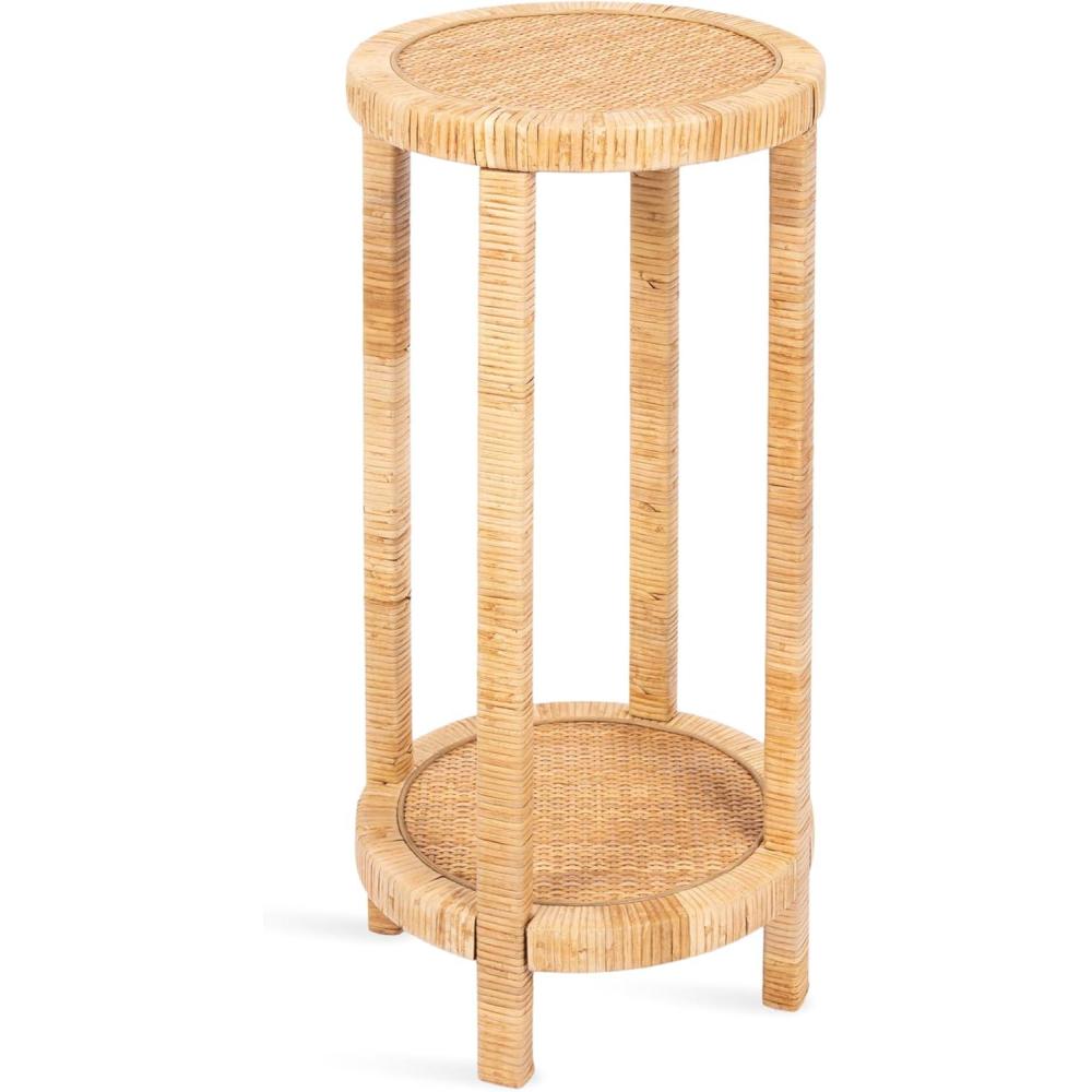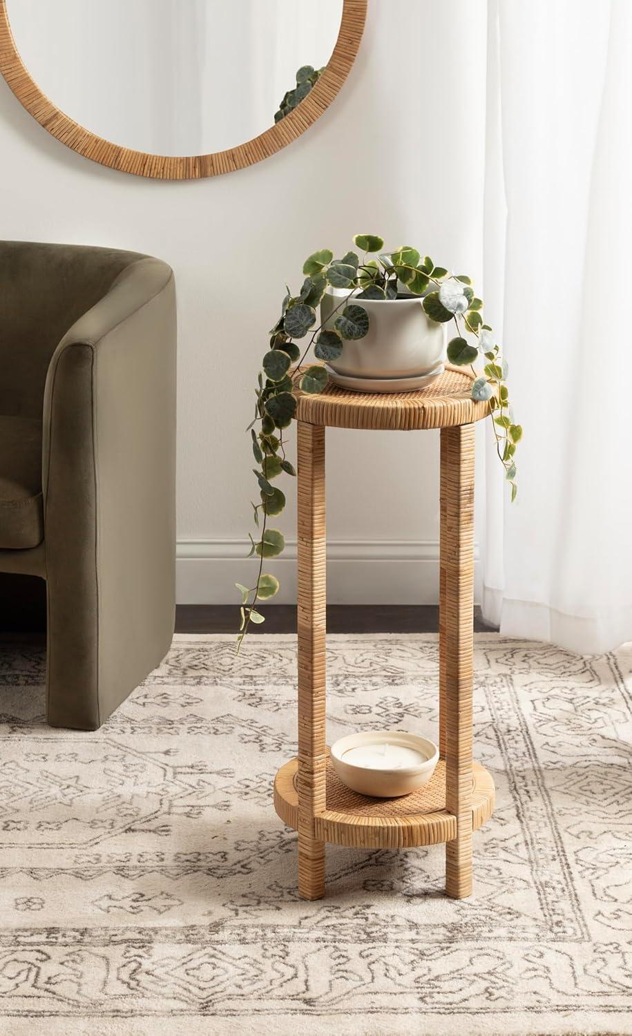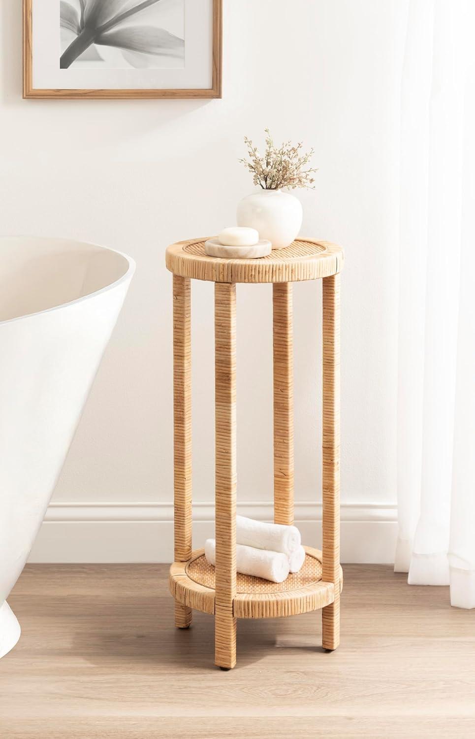 Add a charming accent to your home with this Rafina rattan drink table. Between its rattan-wrapped table legs and round tabletop, the table serves as the most delightful display accent. Crafted from premium materials, this tall drink table features high-quality natural cane wrapping for a boho rattan table look. The Rafina is the optimal accent table for your living room, bedroom, or home office area. Commonly used as a living room drink table, this table also serves as a lovely boho plant stand. Perfect for a beach house or vacation home, this coastal accent table perfectly accentuates your beachy decor. At 28 inches tall, it is the perfect height for easy access to your drink as you relax on a comfy sofa or chair. The platform diameter of 12.25 inches is the perfect size to hold a drink or a smaller plant with a little extra wiggle room. With its unique design, this coastal drink table comes with a very simple two-step assembly, so you can start enjoying and decorating it at once. The table's unique negative space gives you openings between each of the four table legs. Complete your living room or bedroom decor scheme with this boho decor piece.