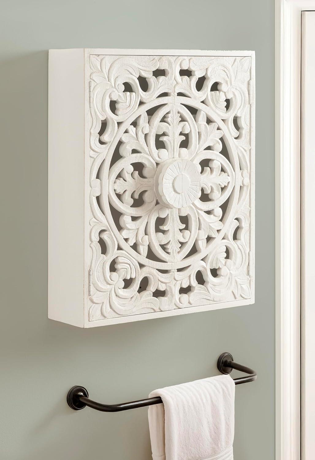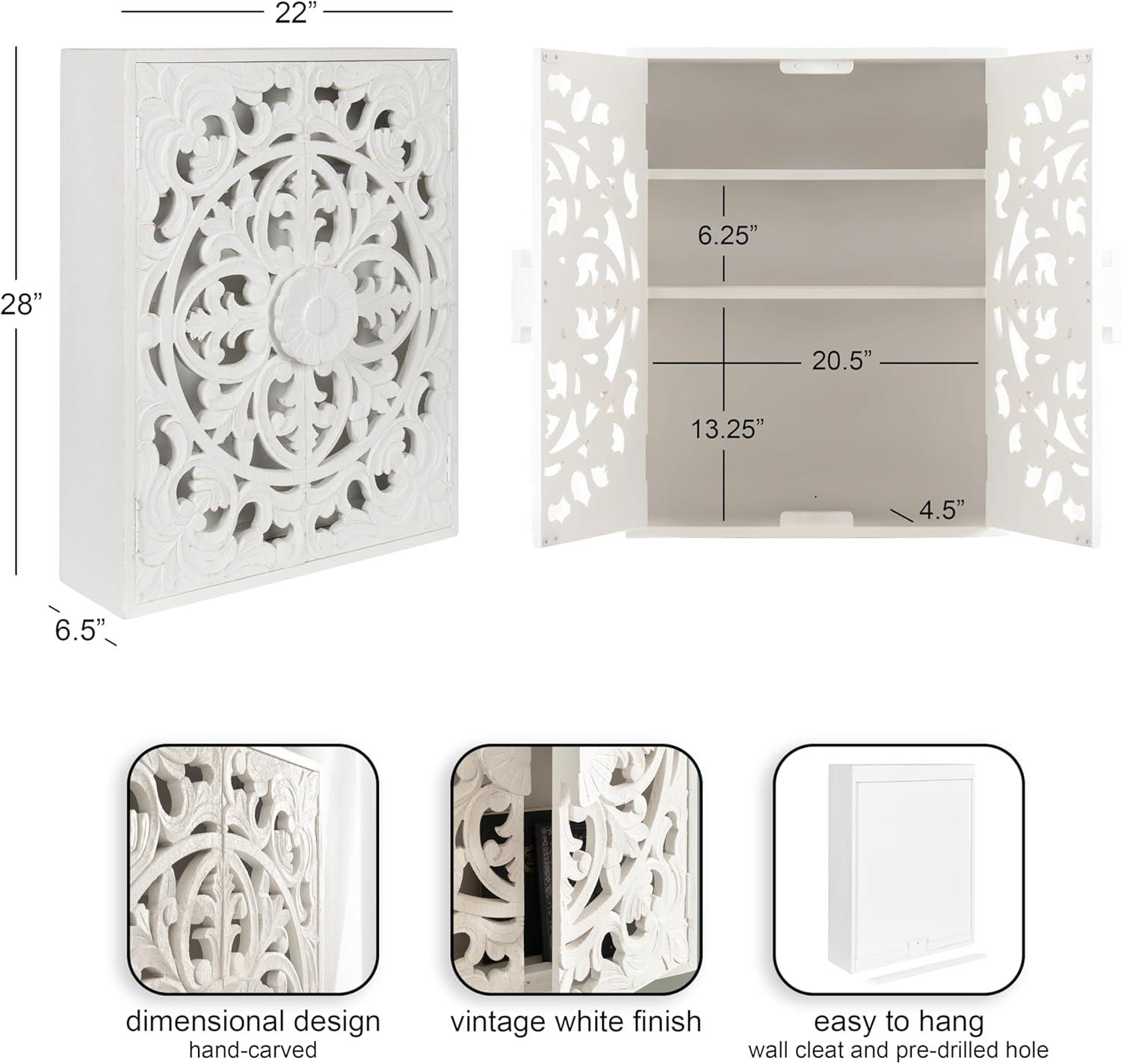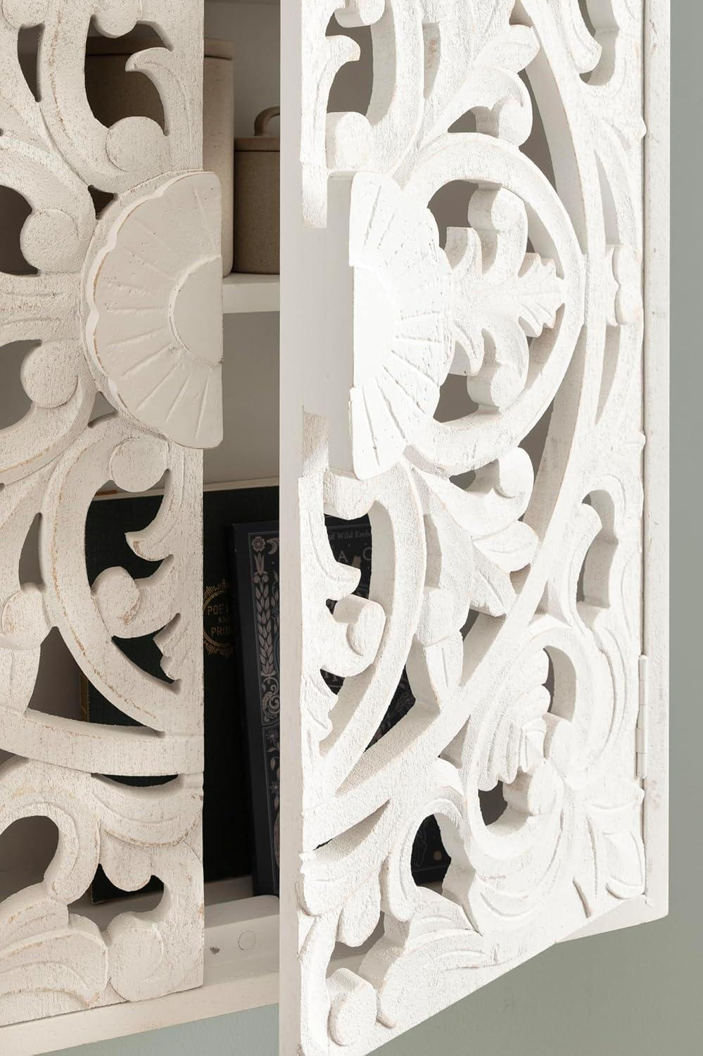 Elevate your bathroom decor with the Kate and Laurel Saanvi carved wall cabinet. Craftsmanship meets elegance in the intricate wood carving that graces this cabinet. It's not just storage; it's a statement piece, adding sophistication to your bathroom, living room, or bedroom. Designed to make the most of your space, the dimensional over-the-toilet configuration offers smart storage without compromising style. Measuring 22 inches wide by 6.5 inches deep by 28 inches high, this display cabinet provides ample space for your essentials, from toiletries to hand towels. Built to last, the cabinet boasts a durable construction from solid mango wood and sturdy wooden material, ensuring stability and longevity. Hand-carved by talented artisans in India, this wall cabinet is truly one-of-a-kind with slight variances from product to product. The classic white finish not only complements any decor but also imparts a clean and bright feel to your bathroom. Beyond practicality, the Saanvi wall cabinet serves as a display area. Showcase your favorite decor items on its top surface, adding a personal touch to your bathroom. Or, feature two of them side-by-side under your television for a unique, charming entertainment center. Transform your space into a stylish and organized haven with this exceptional storage and display solution. Use the attached Z-brackets for simple, secure wall hanging.