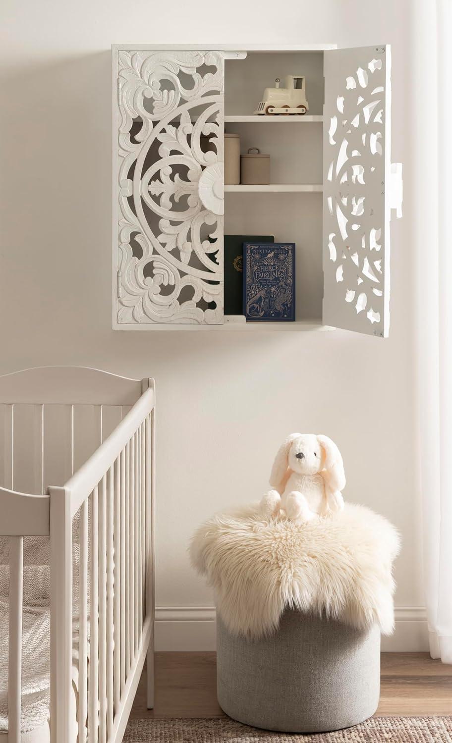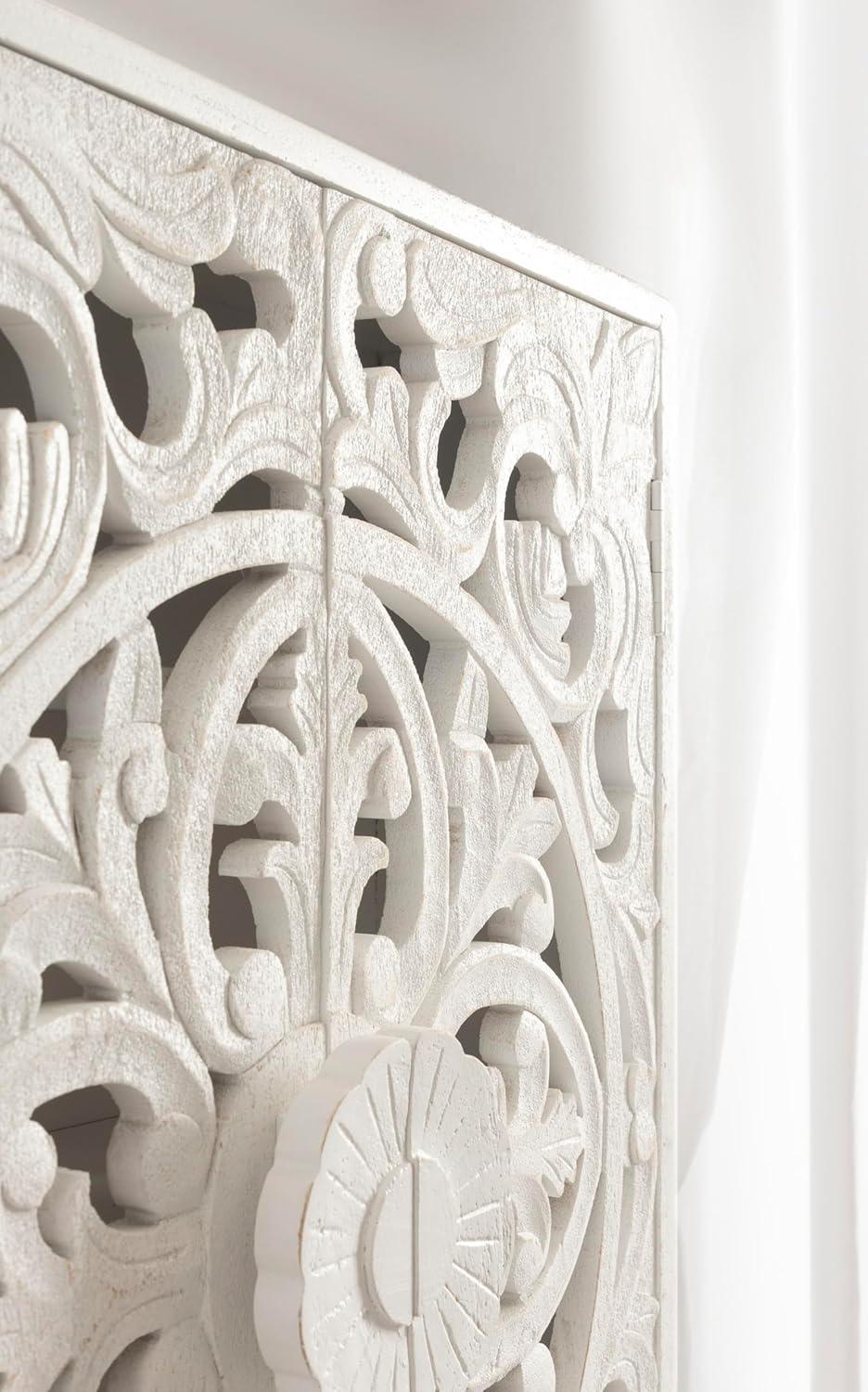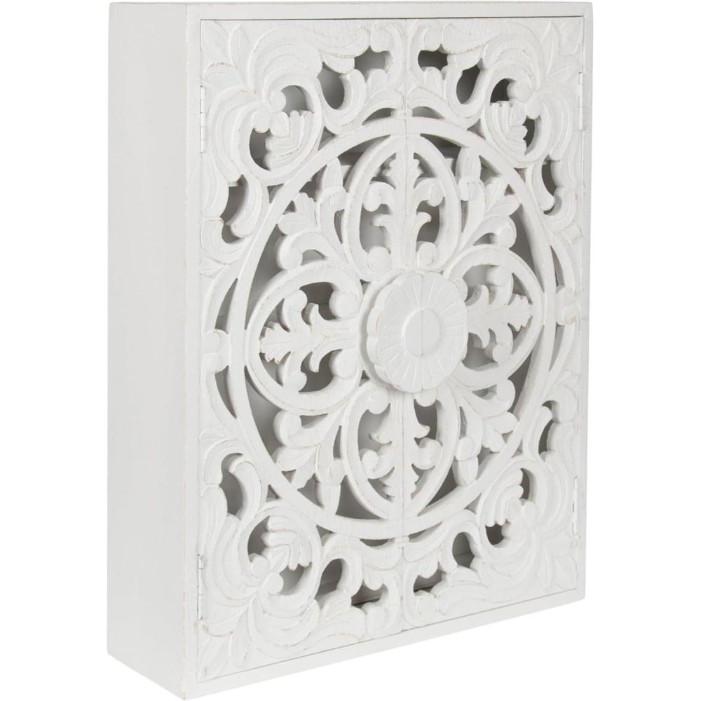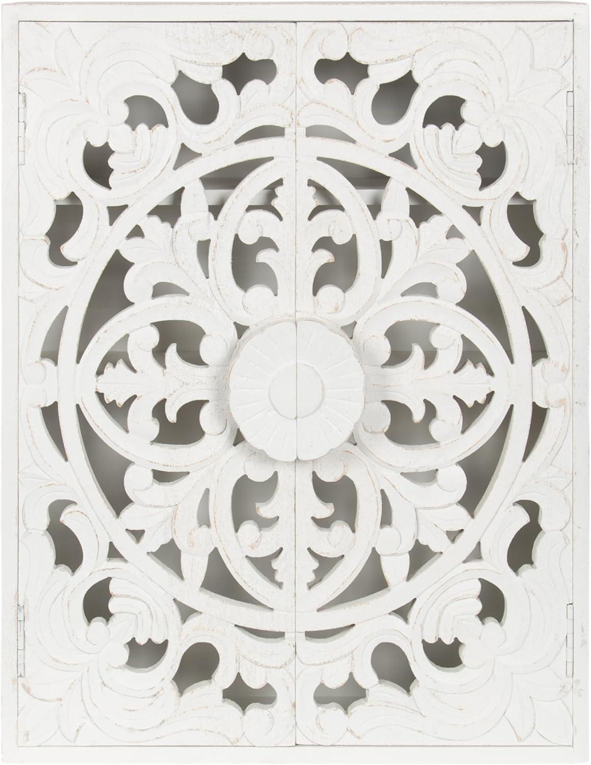 Elevate your bathroom decor with the Kate and Laurel Saanvi carved wall cabinet. Craftsmanship meets elegance in the intricate wood carving that graces this cabinet. It's not just storage; it's a statement piece, adding sophistication to your bathroom, living room, or bedroom. Designed to make the most of your space, the dimensional over-the-toilet configuration offers smart storage without compromising style. Measuring 22 inches wide by 6.5 inches deep by 28 inches high, this display cabinet provides ample space for your essentials, from toiletries to hand towels. Built to last, the cabinet boasts a durable construction from solid mango wood and sturdy wooden material, ensuring stability and longevity. Hand-carved by talented artisans in India, this wall cabinet is truly one-of-a-kind with slight variances from product to product. The classic white finish not only complements any decor but also imparts a clean and bright feel to your bathroom. Beyond practicality, the Saanvi wall cabinet serves as a display area. Showcase your favorite decor items on its top surface, adding a personal touch to your bathroom. Or, feature two of them side-by-side under your television for a unique, charming entertainment center. Transform your space into a stylish and organized haven with this exceptional storage and display solution. Use the attached Z-brackets for simple, secure wall hanging.