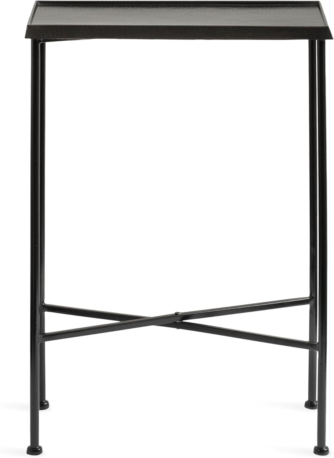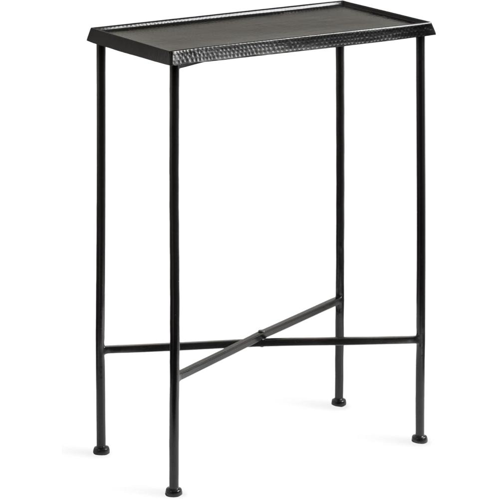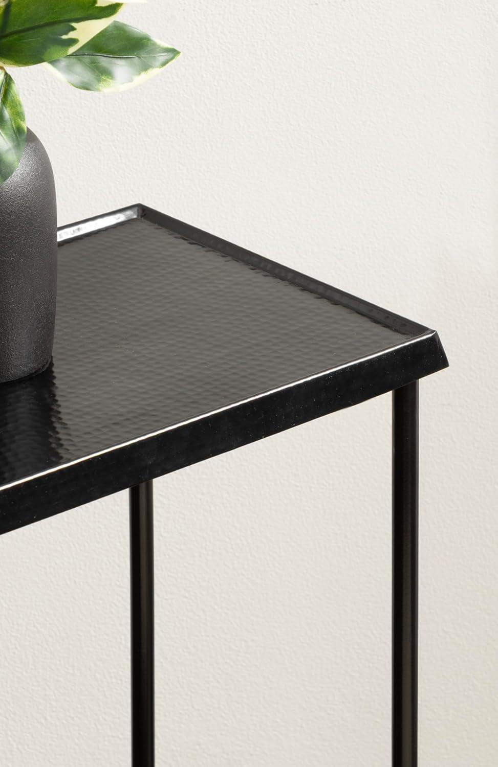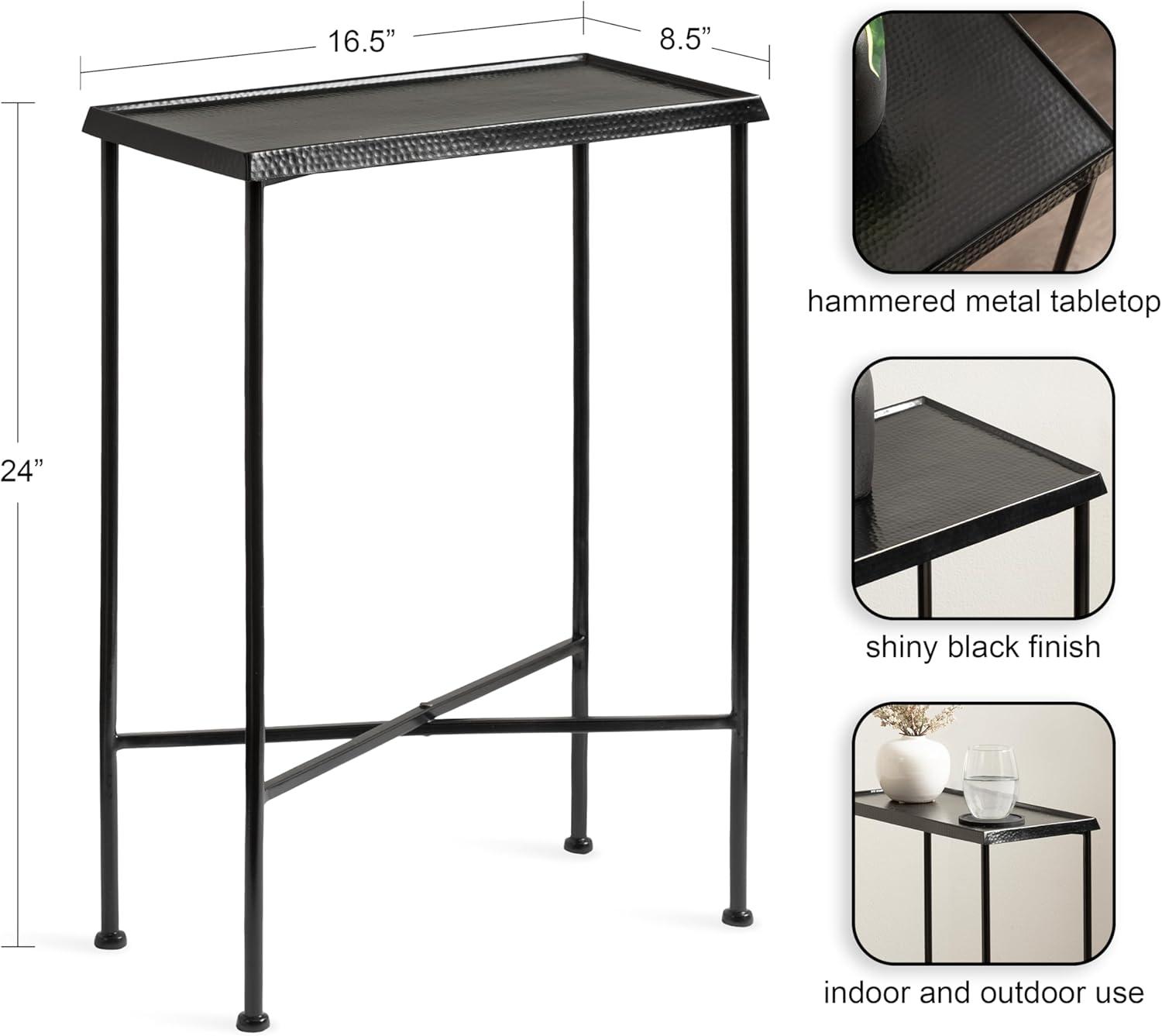 For the interior decorator with a passion for modern design comes our Sanzo narrow side table. The Sanzo collection features a solid iron construction with a hand-applied hammered texture crafted by artisans in India. Each table stands at 24 inches tall, ideal for placement next to your living room couch or bed. The tabletop's surface area is a perfect display or storage area for lamps, morning coffee, plants, alarm clocks, or other small items. Use it as a living room table, a slim nightstand in the bedroom, or an accent table near your bathtub. Regardless of where you put it, the Sanzo end table makes for a unique statement piece in any area of your modern home. Everything down to the outdoor-grade glossy black finish echoes timeless design and style. You won't have to work hard to set up this charming table, either; the Sanzo side table has a simple, three-step assembly process. The 16.5-inch width and 8.5-inch depth make this a charming indoor or outdoor plant stand option for some small succulents or your favorite house plant.